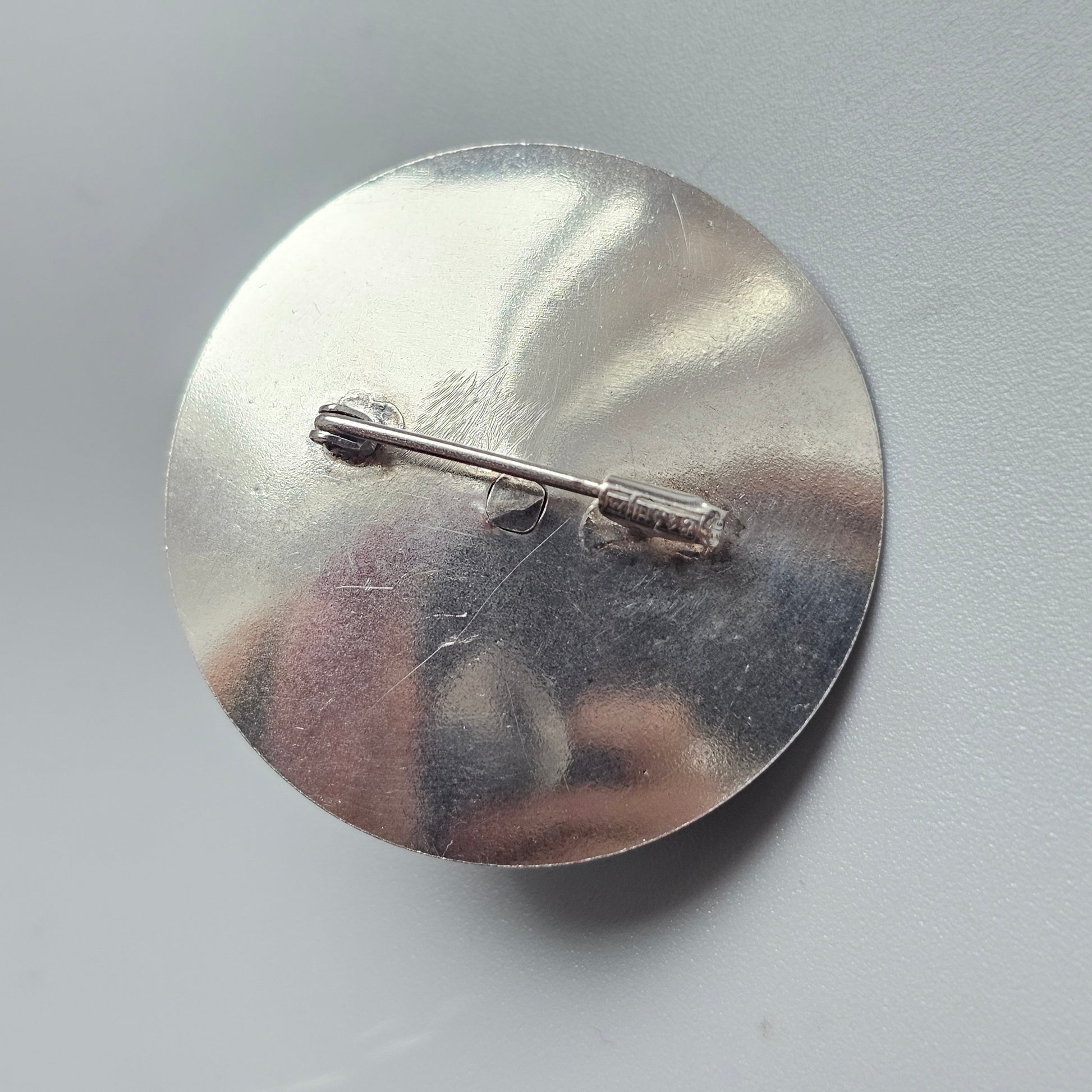 Modernist silver brooch made from two concaved round silver pieces one polished silver and the other reticulated in texture with a rose quartz bead set in the middle. The pin is quite short due to the design, it is convex at the back so it appears to be almost floating once in place.