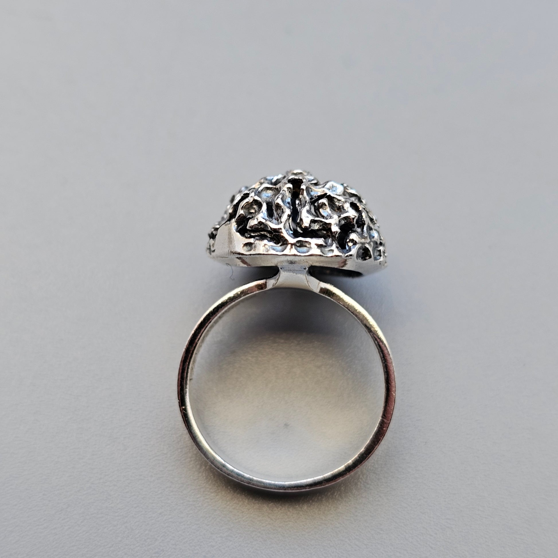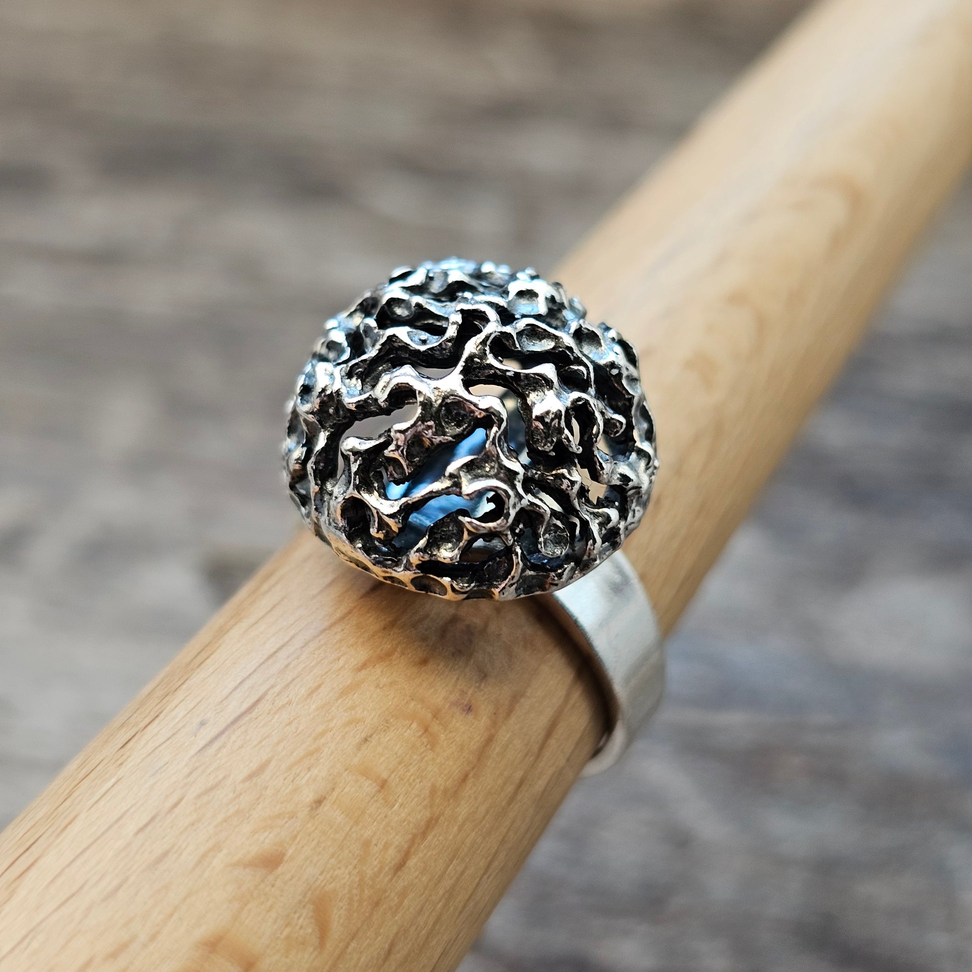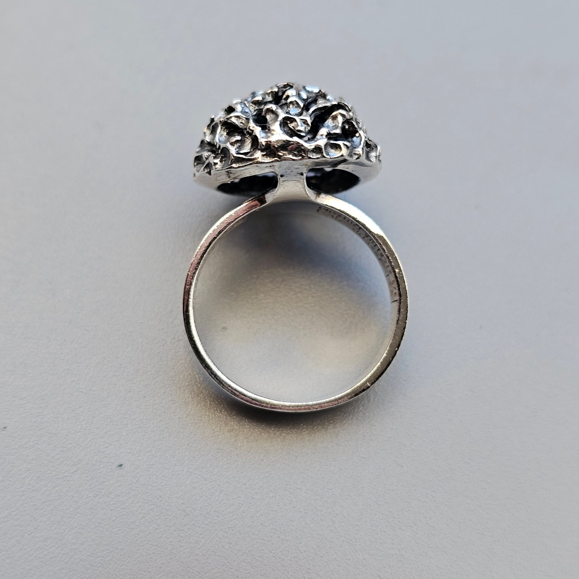 Finnish sterling silver ring from the 1960s with a rugged brutalist textured design.