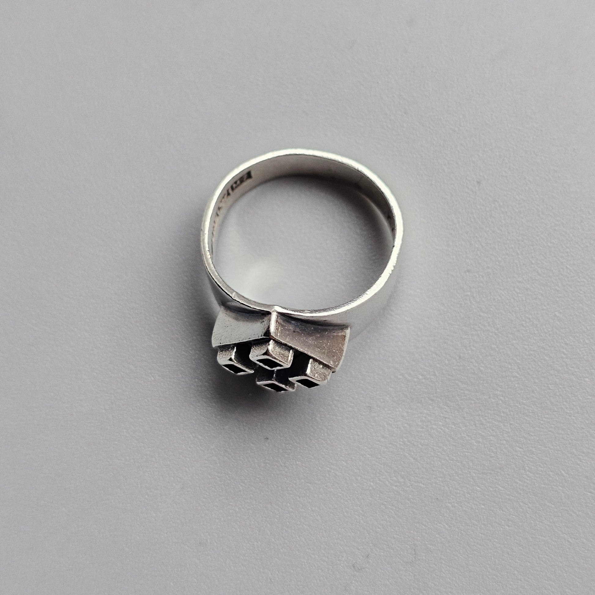 A 1960s Finnish modernist silver ring by master goldsmith Väinö Hamara. The design centres on a geometric raised square with four open rectangular cutouts arranged symmetrically, giving the piece a minimalist and architectural presence. The clean lines and balanced proportions reflect typical of mid-century Finnish design.