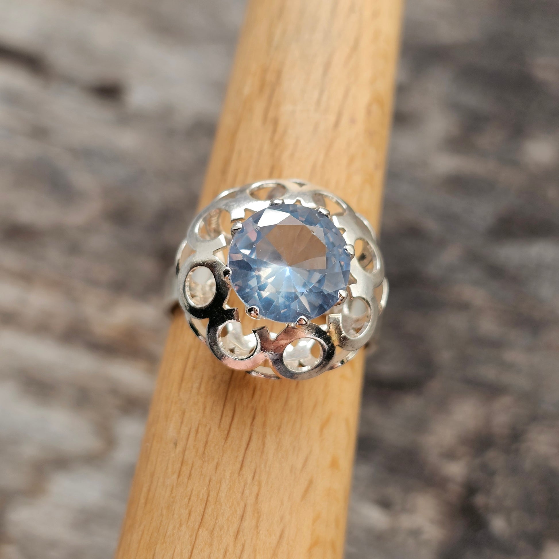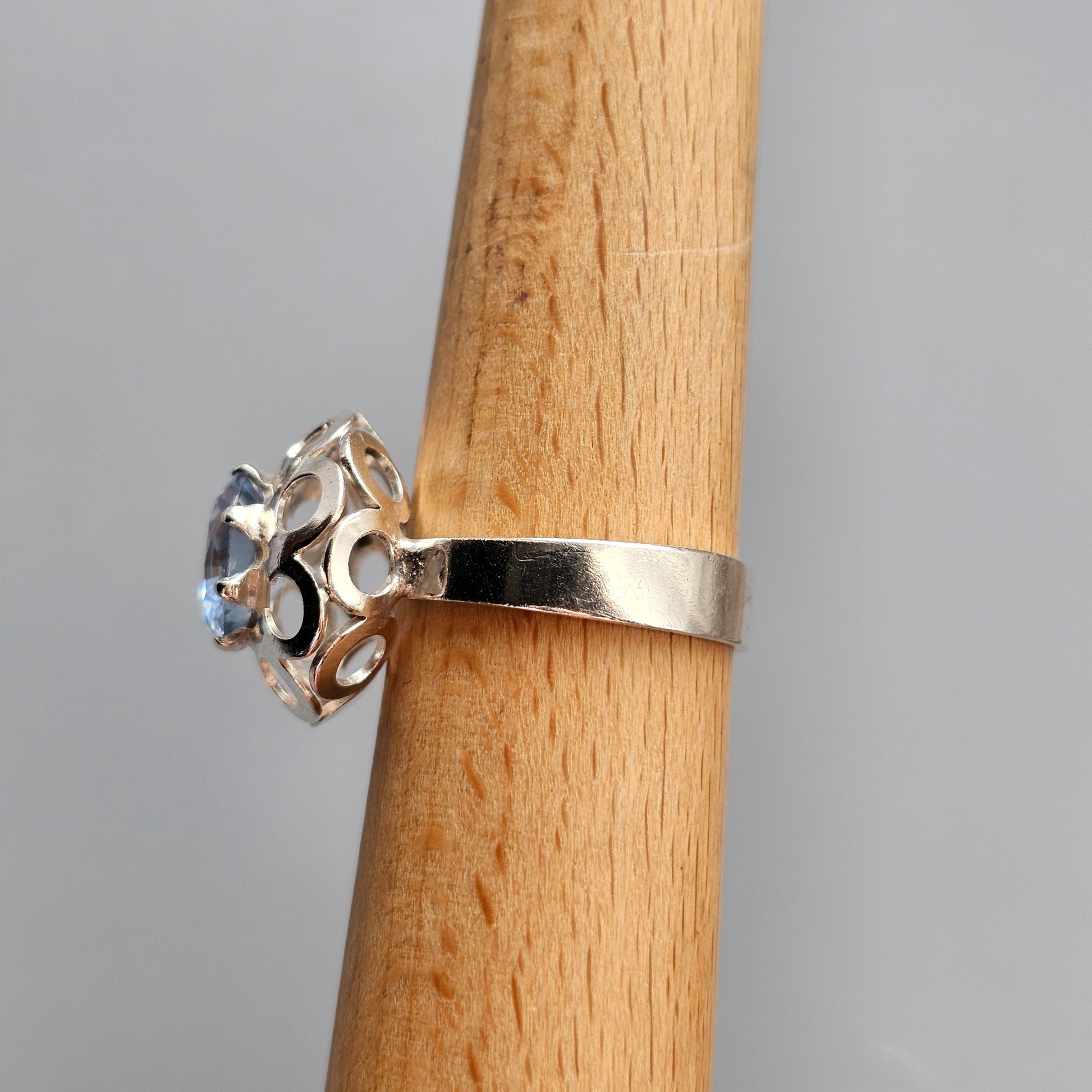This 1960s Finnish silver ring features a bright lab-created blue spinel set in an airy, openwork mount. The faceted stone sits within a circular cut-out surround that lifts it slightly above the band, allowing the light to pass through the setting.