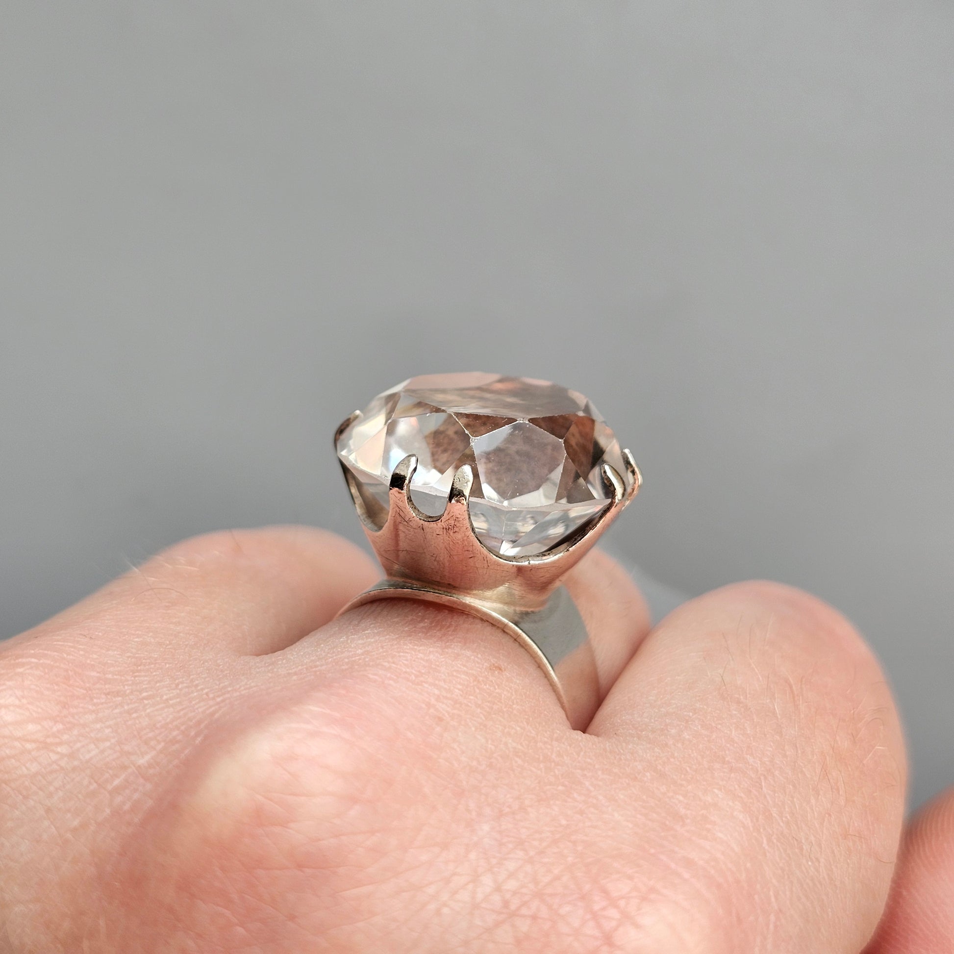 This 1960s Finnish modernist ring by Kultaseppä Salovaara features a large faceted rock crystal set in an open prong mount that rises strongly above the band. The stone is bright and clear, catching the light through its many facets and the open sides of the setting. The mounting has the sculptural, elevated silhouette characteristic of Salovaara’s mid-century work, with a wide, tapering band that supports the tall crown-shaped top.