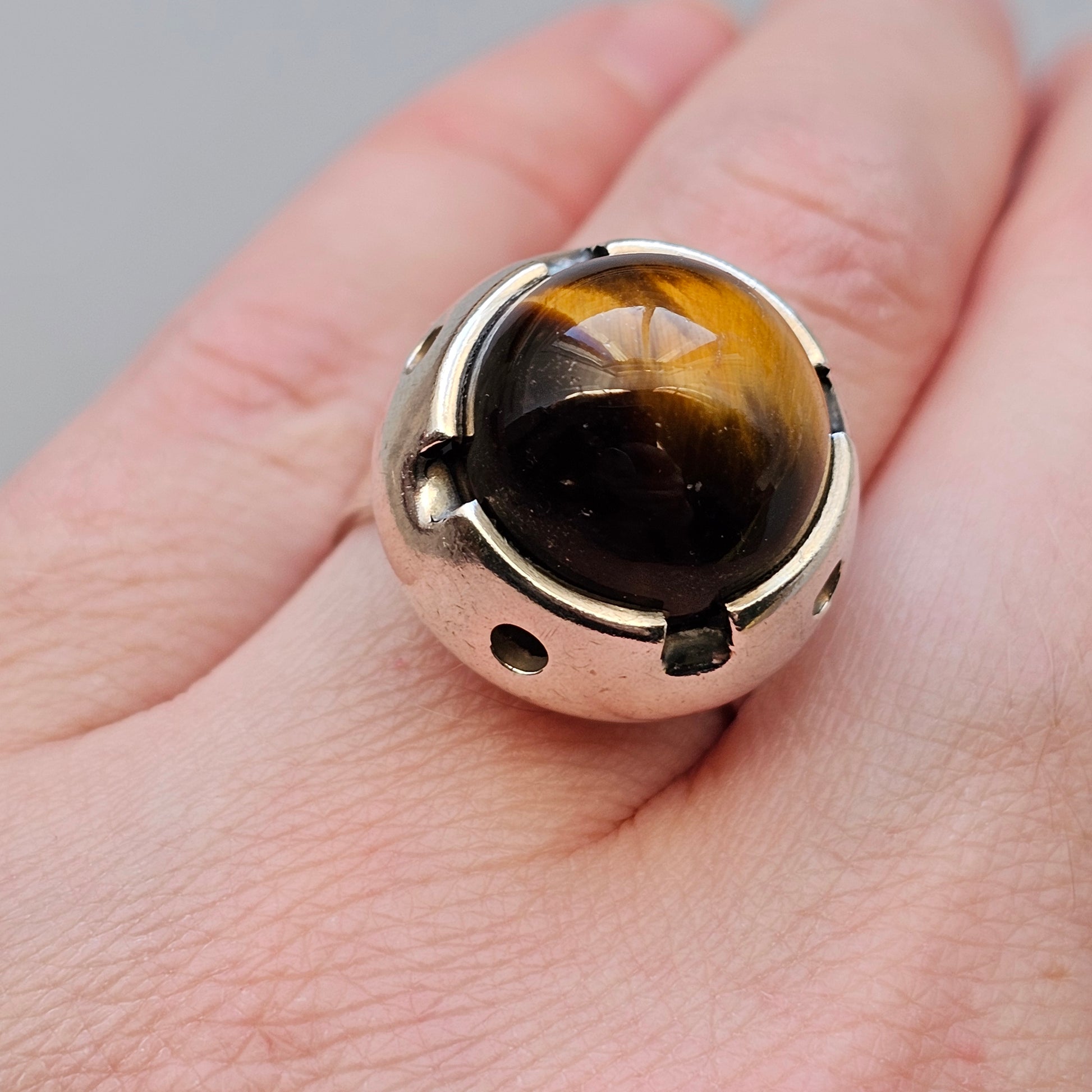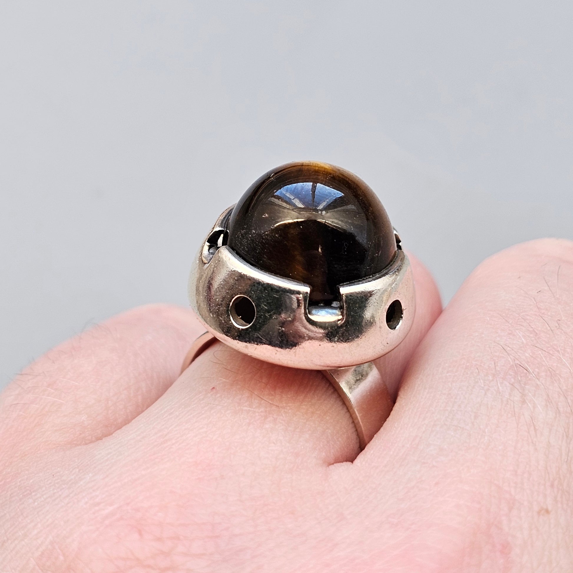A distinctive 1960s Finnish silver ring set with a domed tiger’s eye cabochon. The stone is held in a sculptural, elevated silver setting with circular cut-outs around the sides, giving it an open, airy structure. The tiger’s eye shows its natural banding and warm golden–brown tones, sitting prominently above a simple round band.