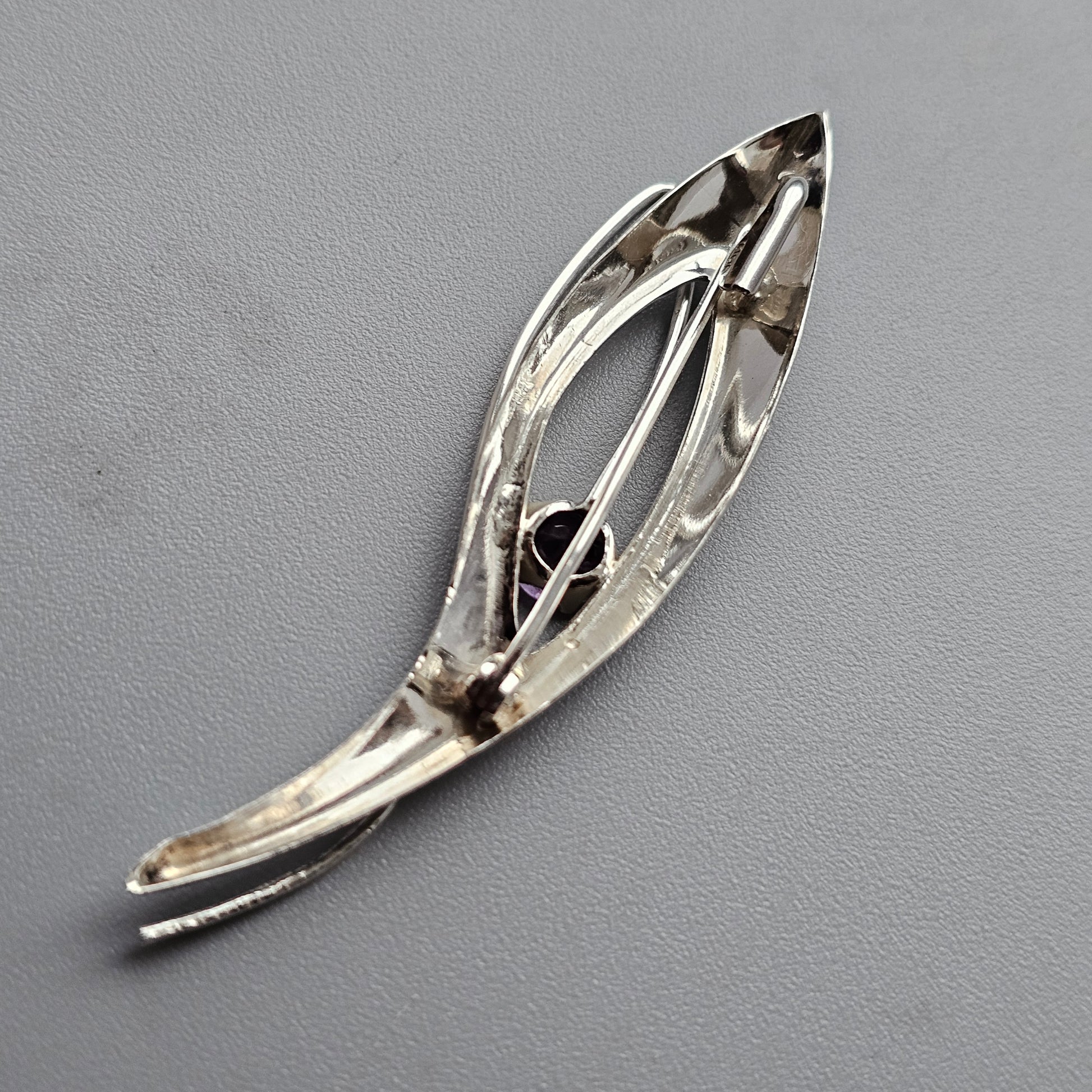 Elegant 1960s Finnish modernist brooch featuring a flowing sculptural form set with a faceted purple amethyst. The design echoes a budding flower or leaf, capturing the soft organic lines typical of mid-century Scandinavian jewellery.