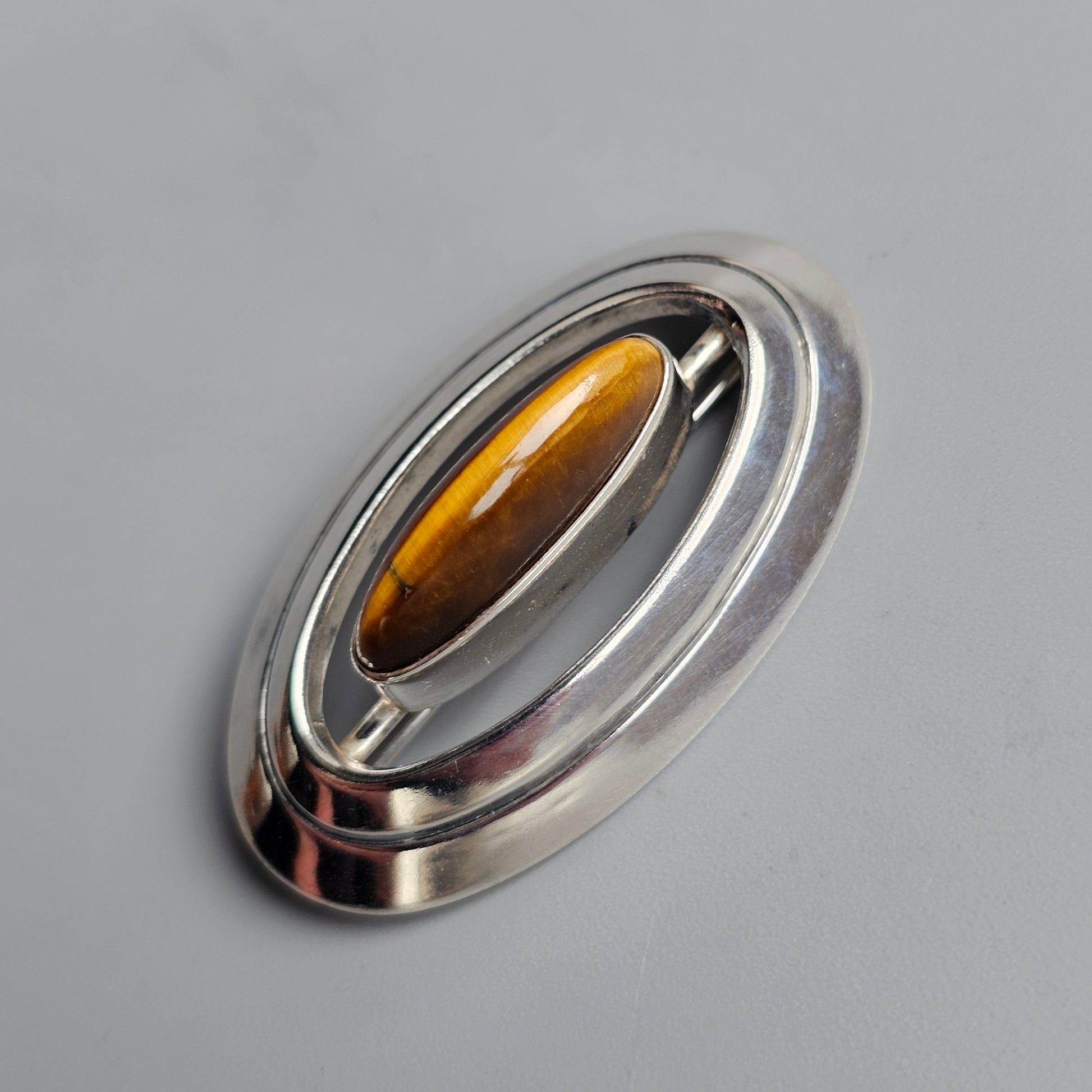 Striking mid-century Finnish silver brooch set with a natural tiger’s eye. The sleek flowing shape highlights the stone. A classic and collectible Scandinavian modernist design from the 60s era.