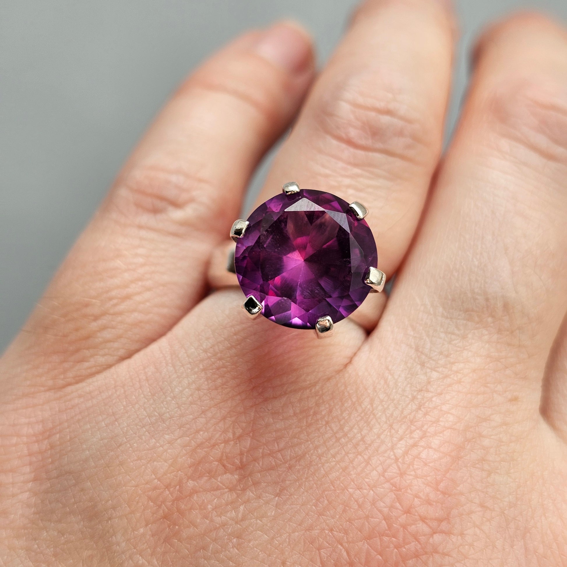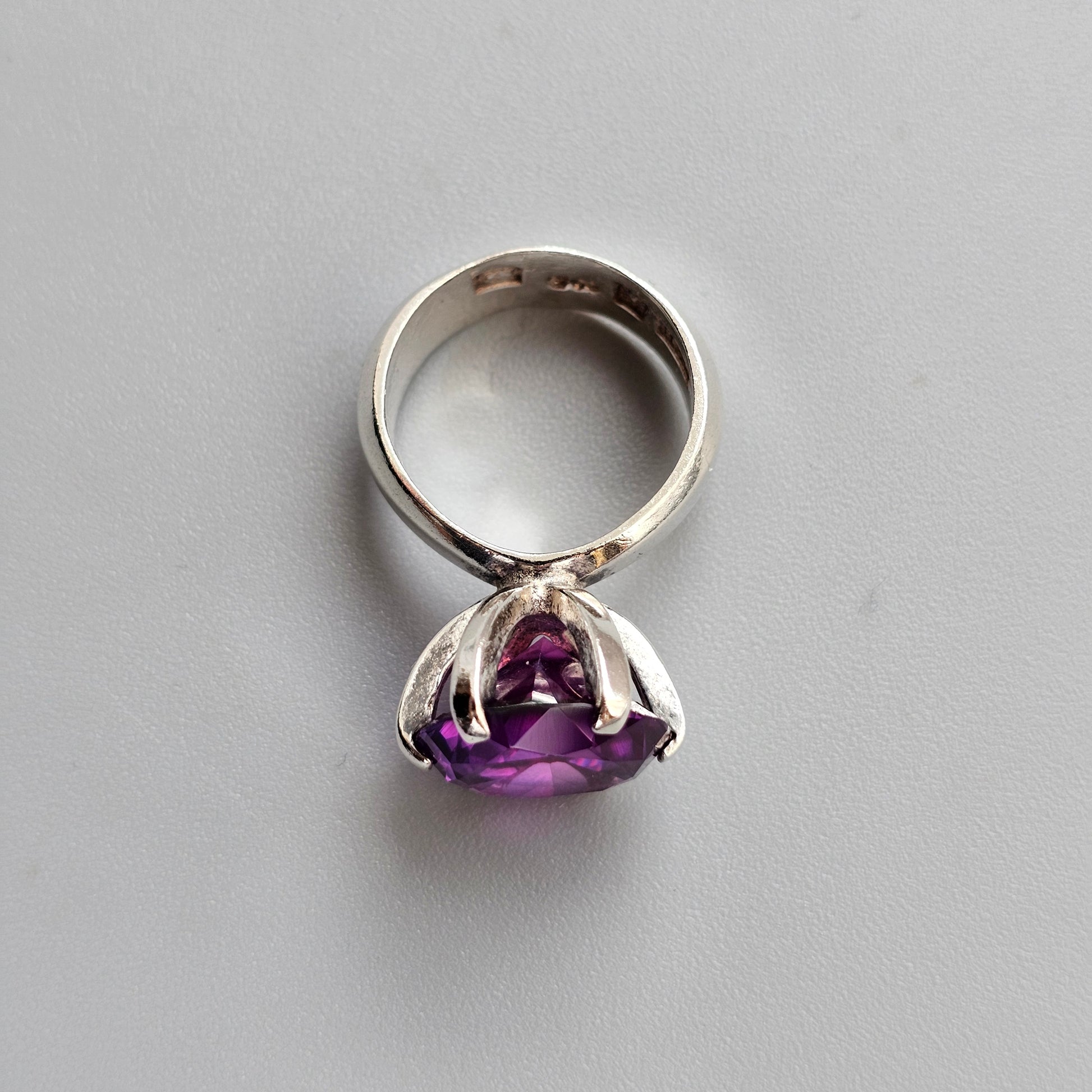 A Swedish modernist silver ring from the 1960s by Bengt Hallberg. The design features a large round faceted lab-created purple sapphire held in a simple open prong setting. The band is a clean, slightly tapered form with a smooth profile.