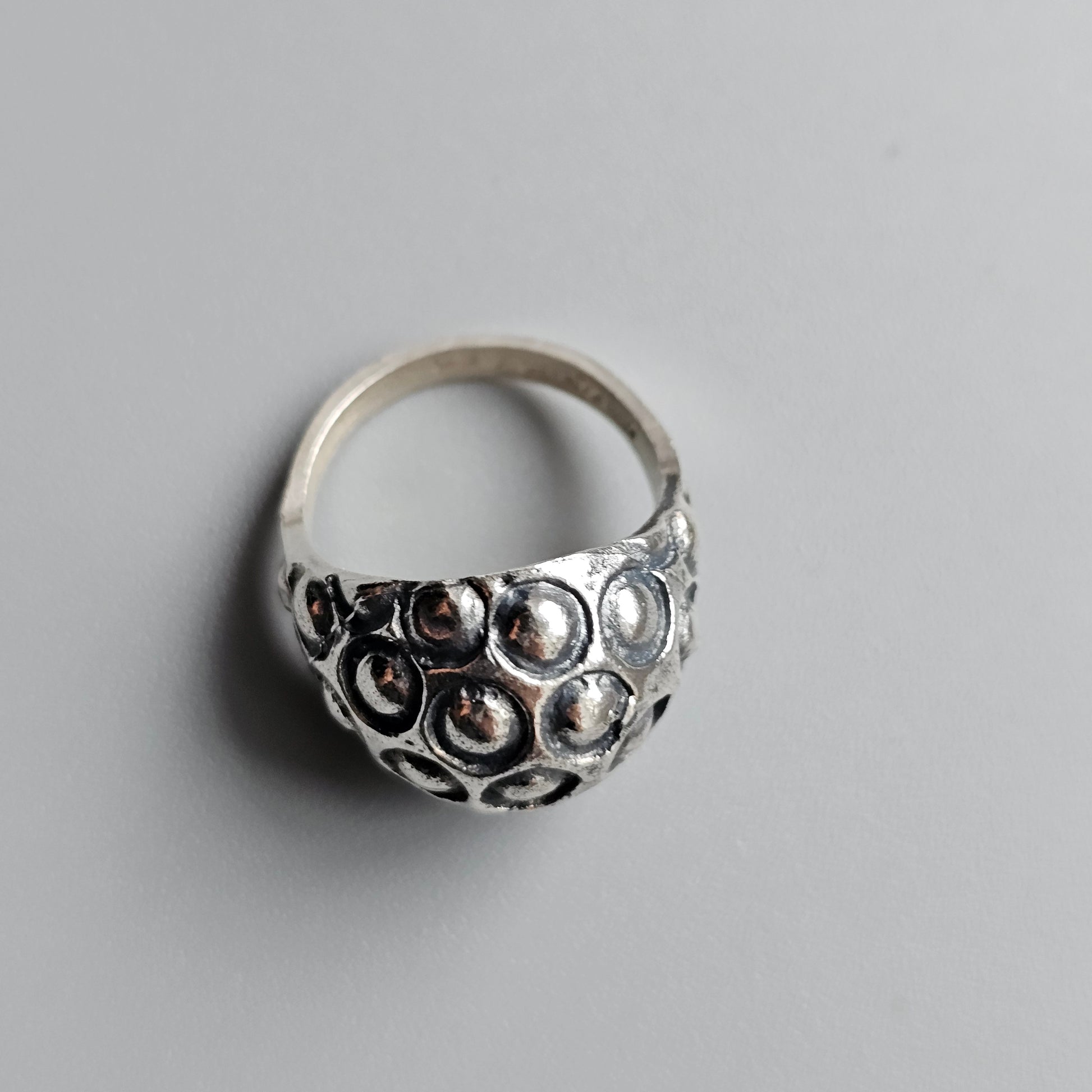 A striking modernist domed ring by Alpo Tammi, crafted in Finland in the early 1970s. The bold, sculptural design features a rounded dome of raised circular forms with oxidized recesses that emphasize depth and texture.