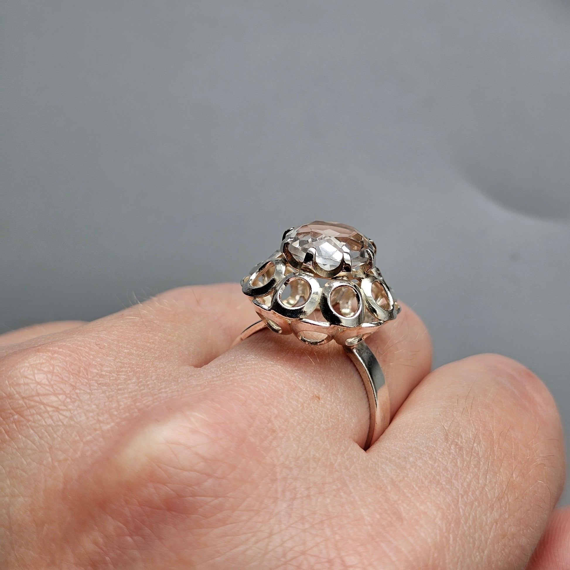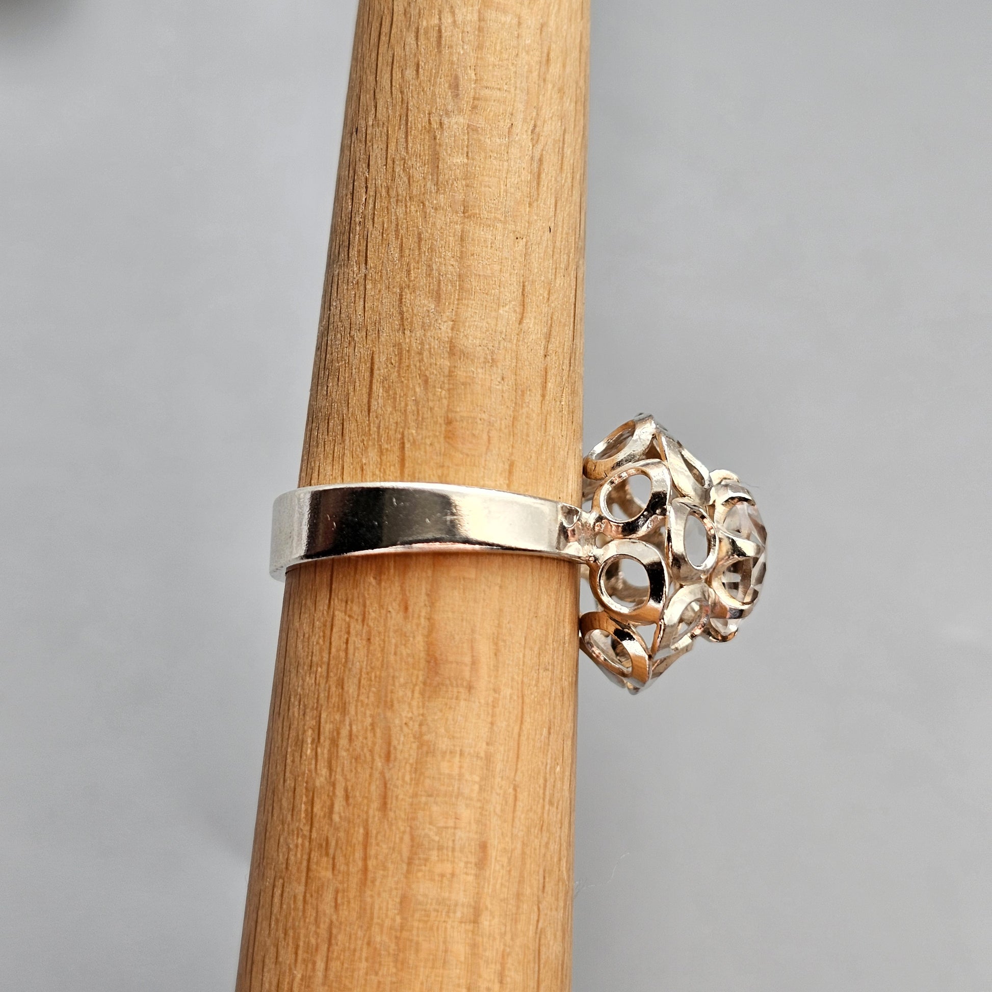 This 1970s Finnish silver ring features a bright rock crystal set in an airy, openwork mount. The faceted stone sits within a circular cut-out surround that lifts it slightly above the band, allowing the light to pass through the setting.