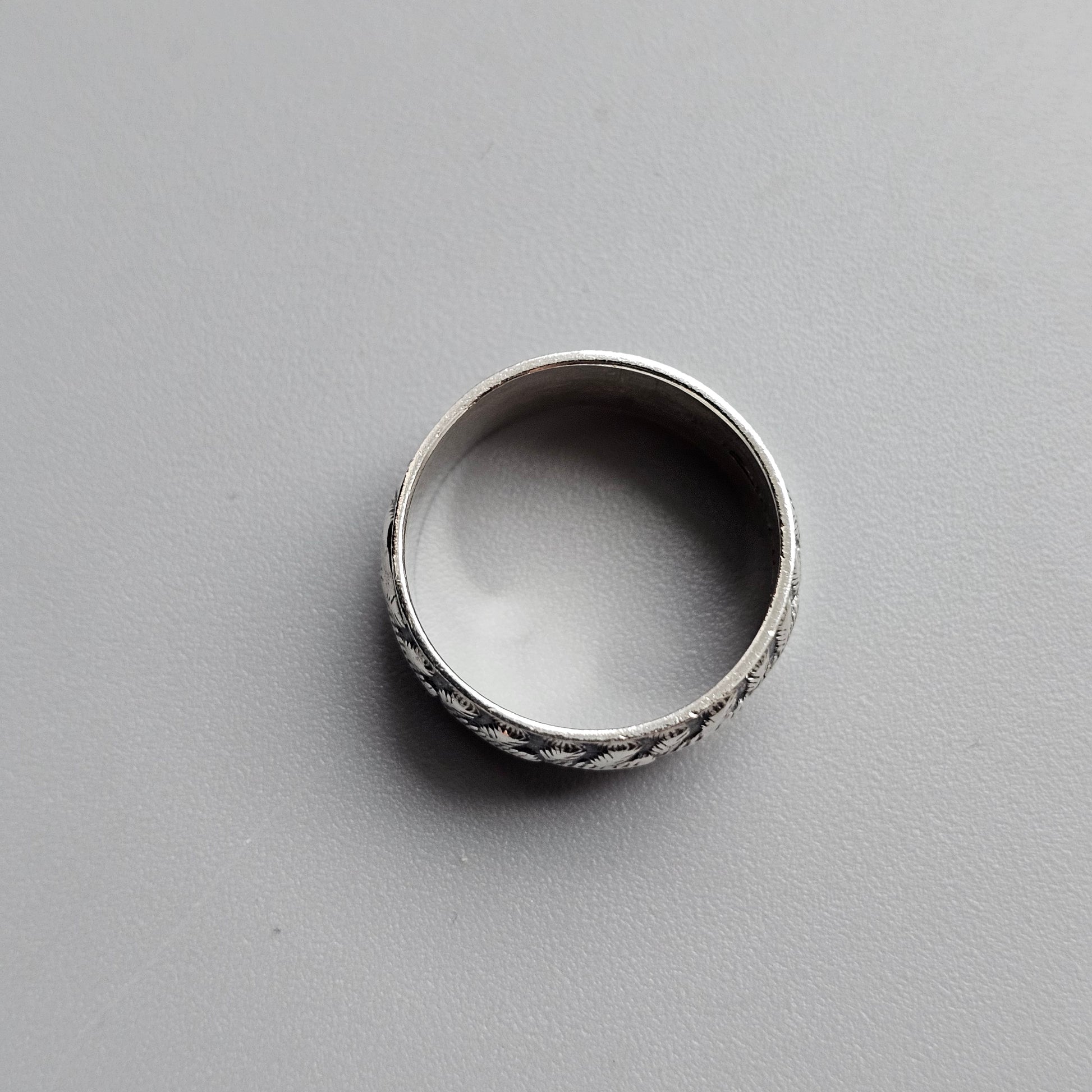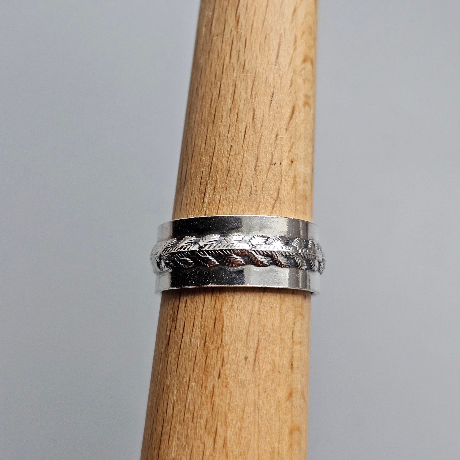 A 1970s Finnish silver ring featuring a raised, finely detailed band of interlocking branch-like forms, likely inspired by the spruce tree — one of the most iconic trees of Finland. The textured central motif contrasts with the smooth polished edges, giving the ring a defined yet natural character.