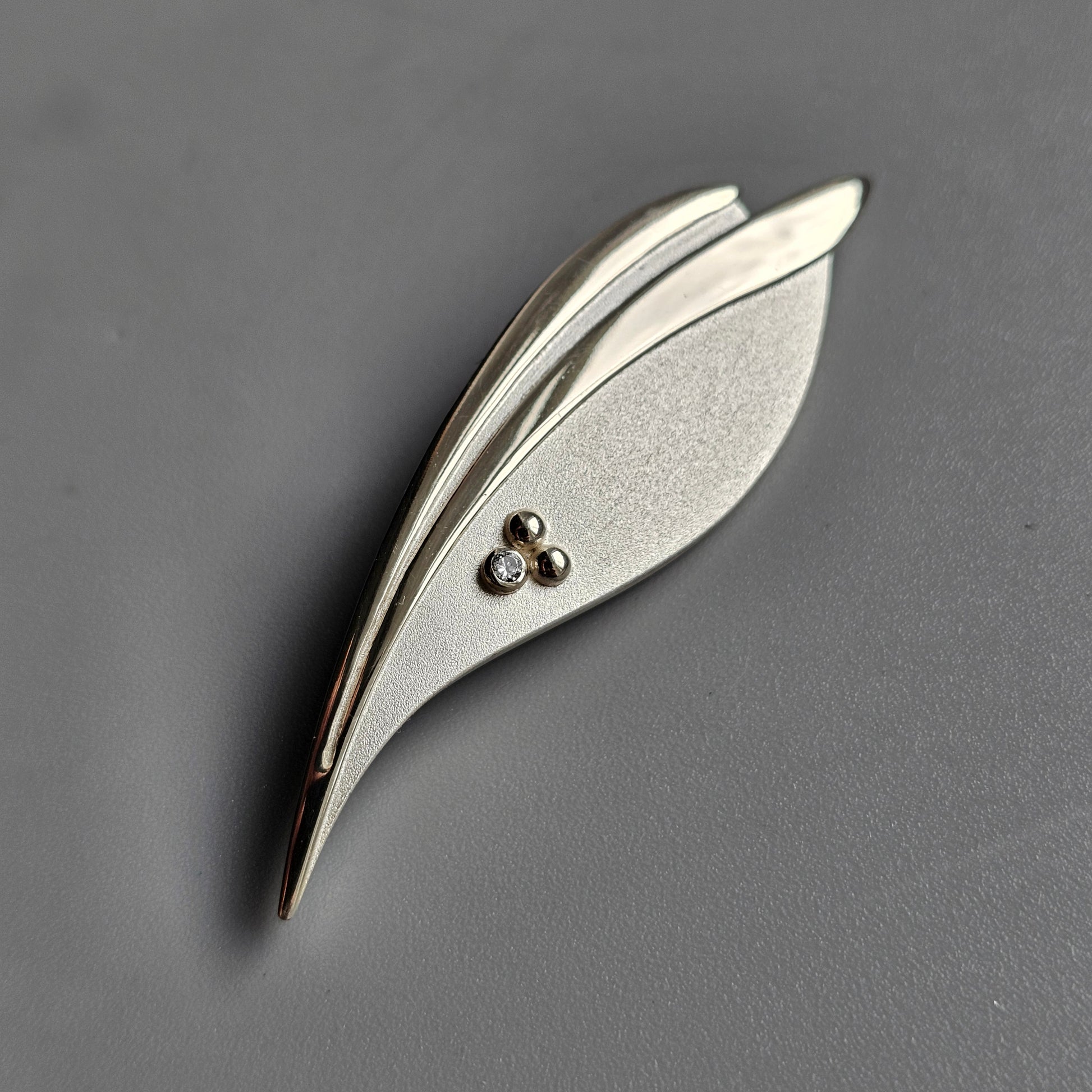 Elegant contemporary Finnish brooch crafted in sterling silver, designed in a sleek curved leaf form. The brooch features a modern sculptural shape with contrasting finishes — polished and softly satin-textured — accented by sparkling cubic zirconia stone.
