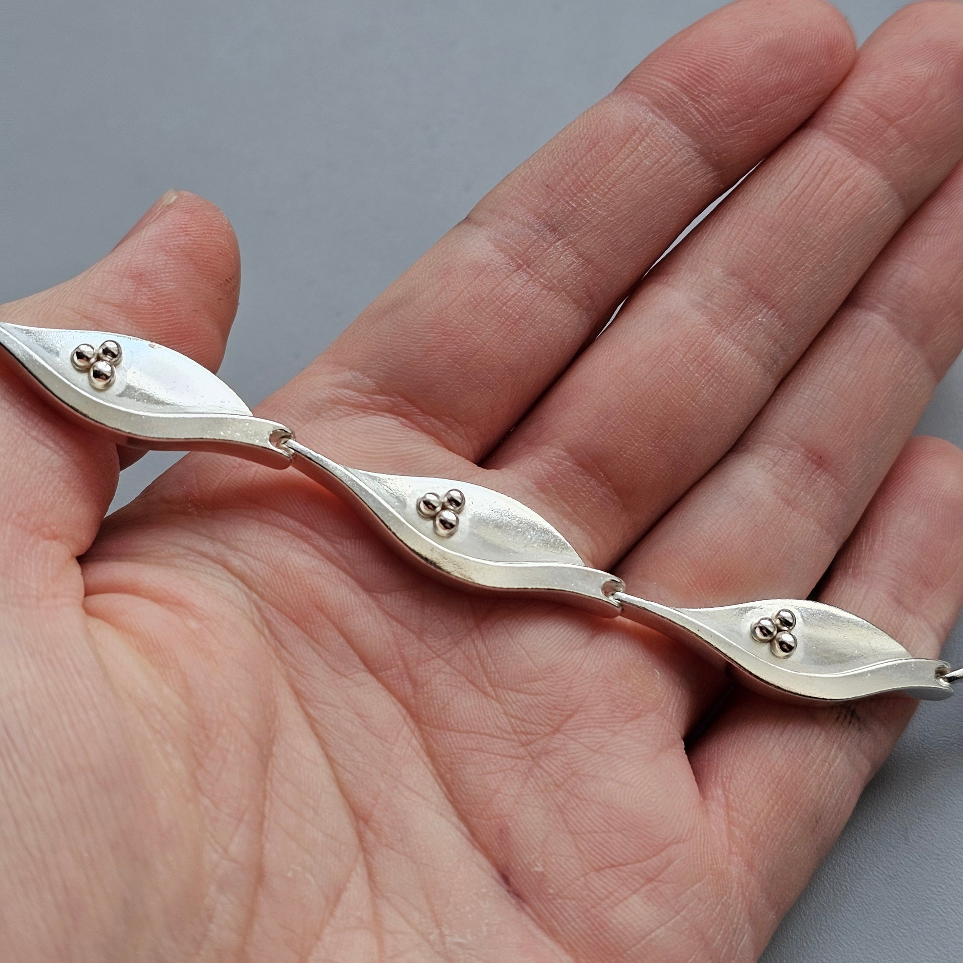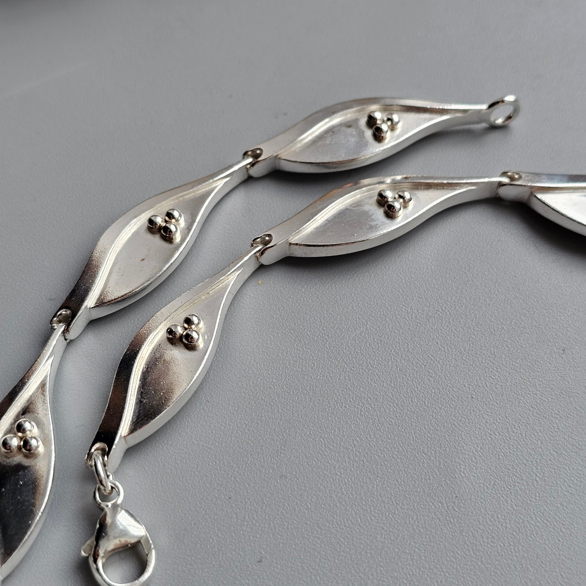 A contemporary Finnish sterling silver necklace featuring a series of softly sculpted, organic links with a flowing, almost botanical form. Links create a fluid line around the neck with subtle surface texture and gentle movement.