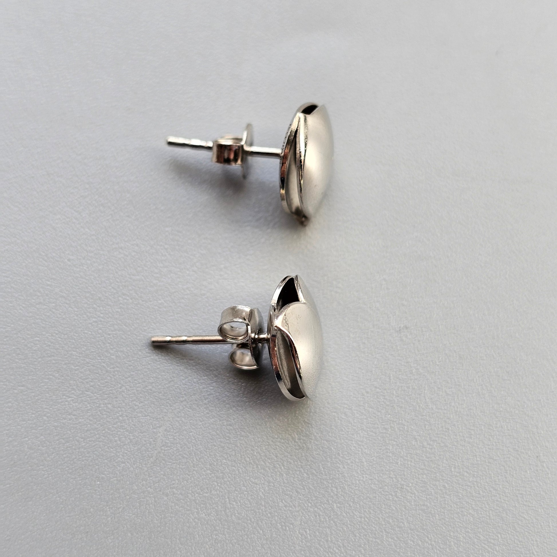 A pair of sterling silver stud earrings from the Halaus / Hug collection, designed by Heikki Hartikainen for Lumoava. Each earring features a smooth, polished form with a subtle heart-like shape.