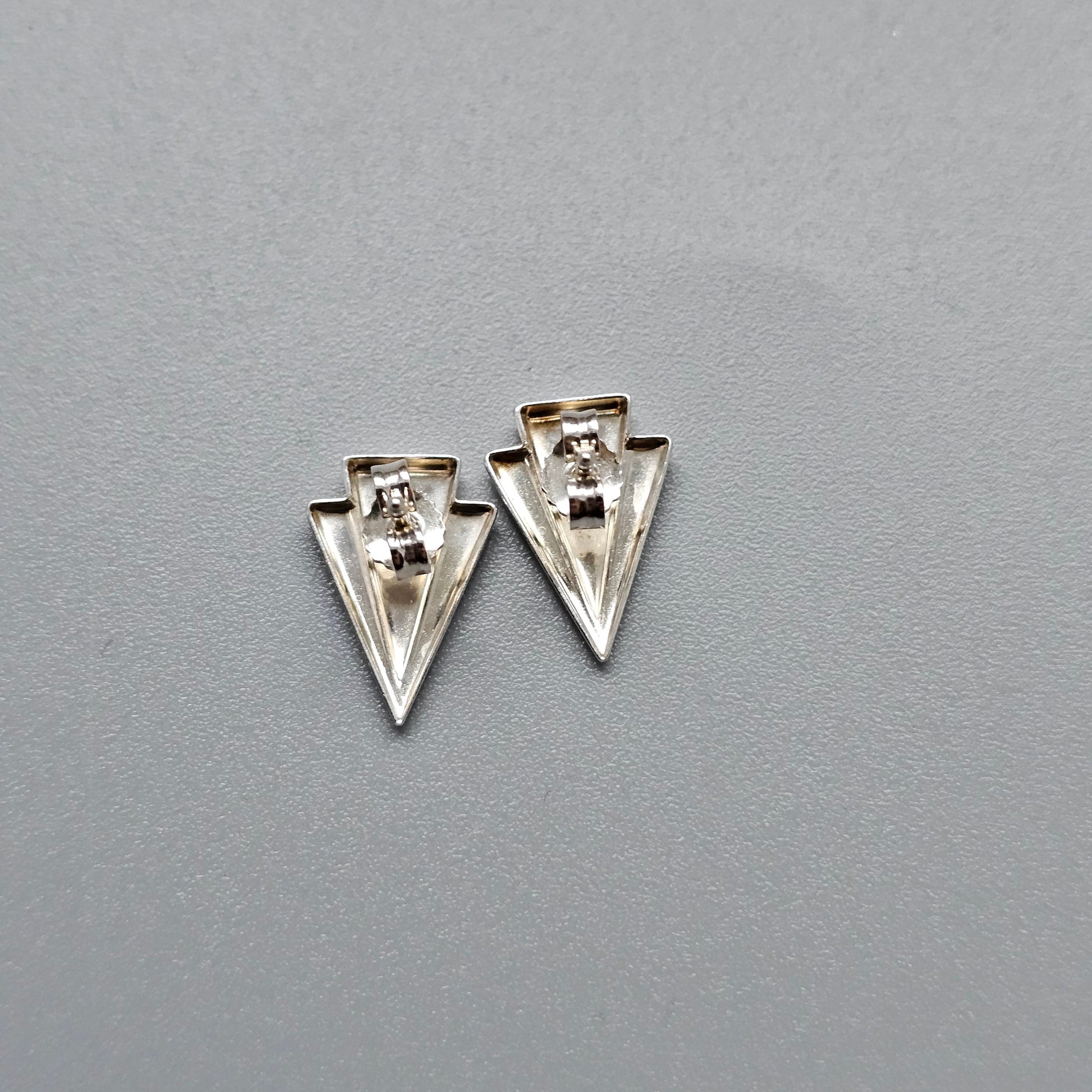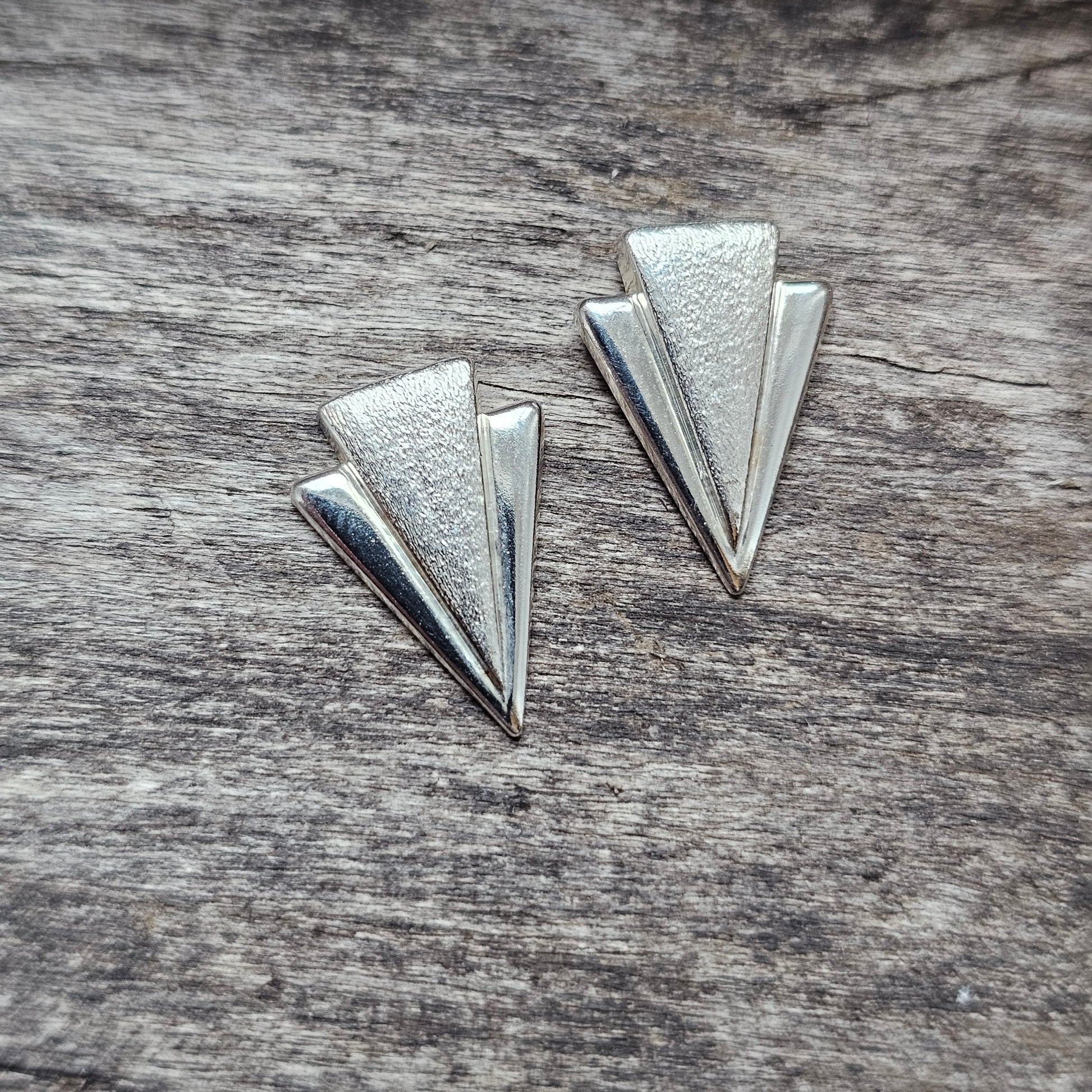 A pair of contemporary sterling silver stud earrings with a clean, geometric profile. Each earring features layered triangular forms with contrasting polished and lightly textured surfaces, giving them depth and a subtle sculptural quality