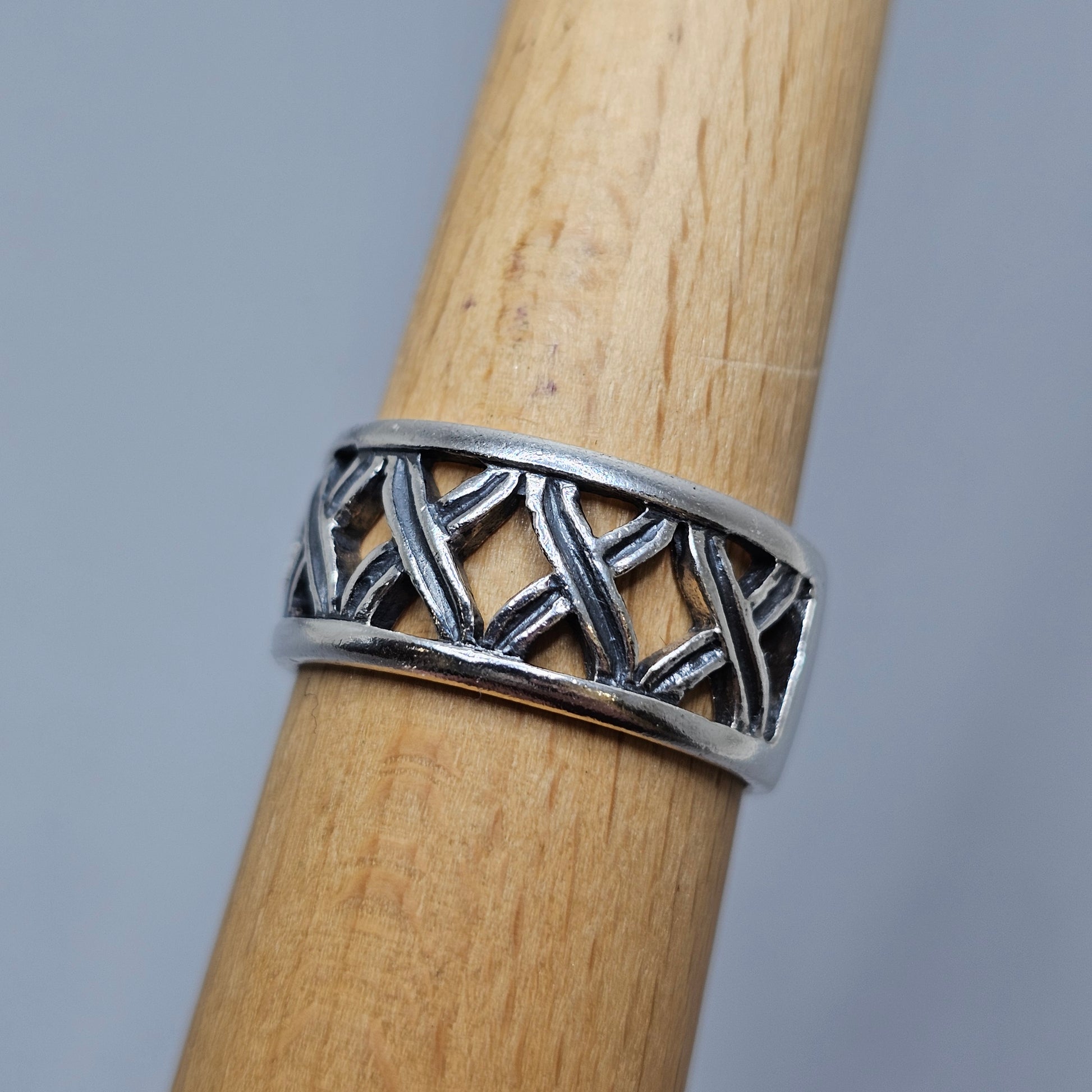A beautifully crafted contemporary sterling silver band featuring an intricate woven openwork design.