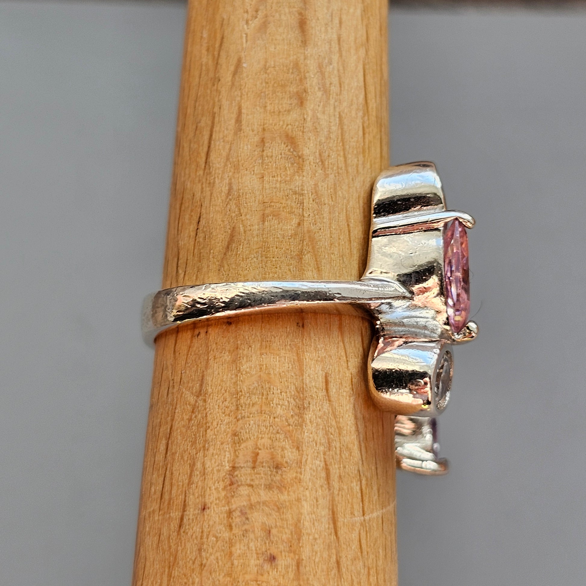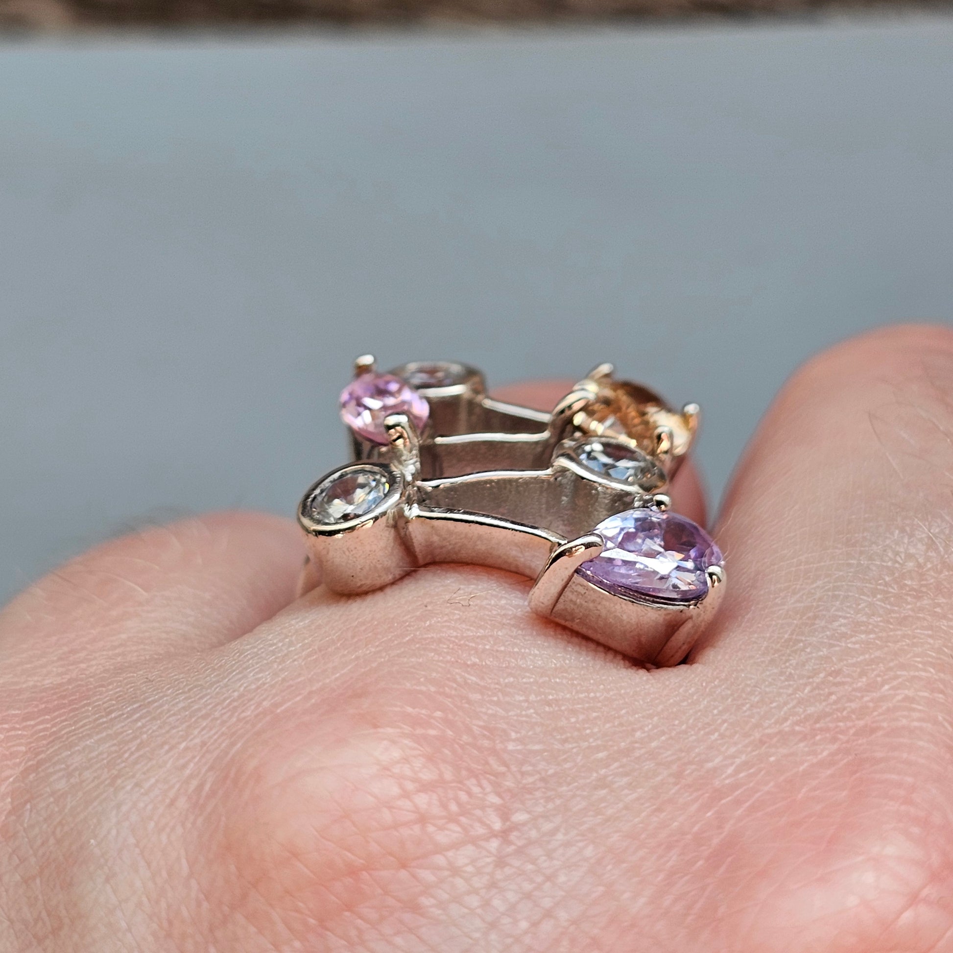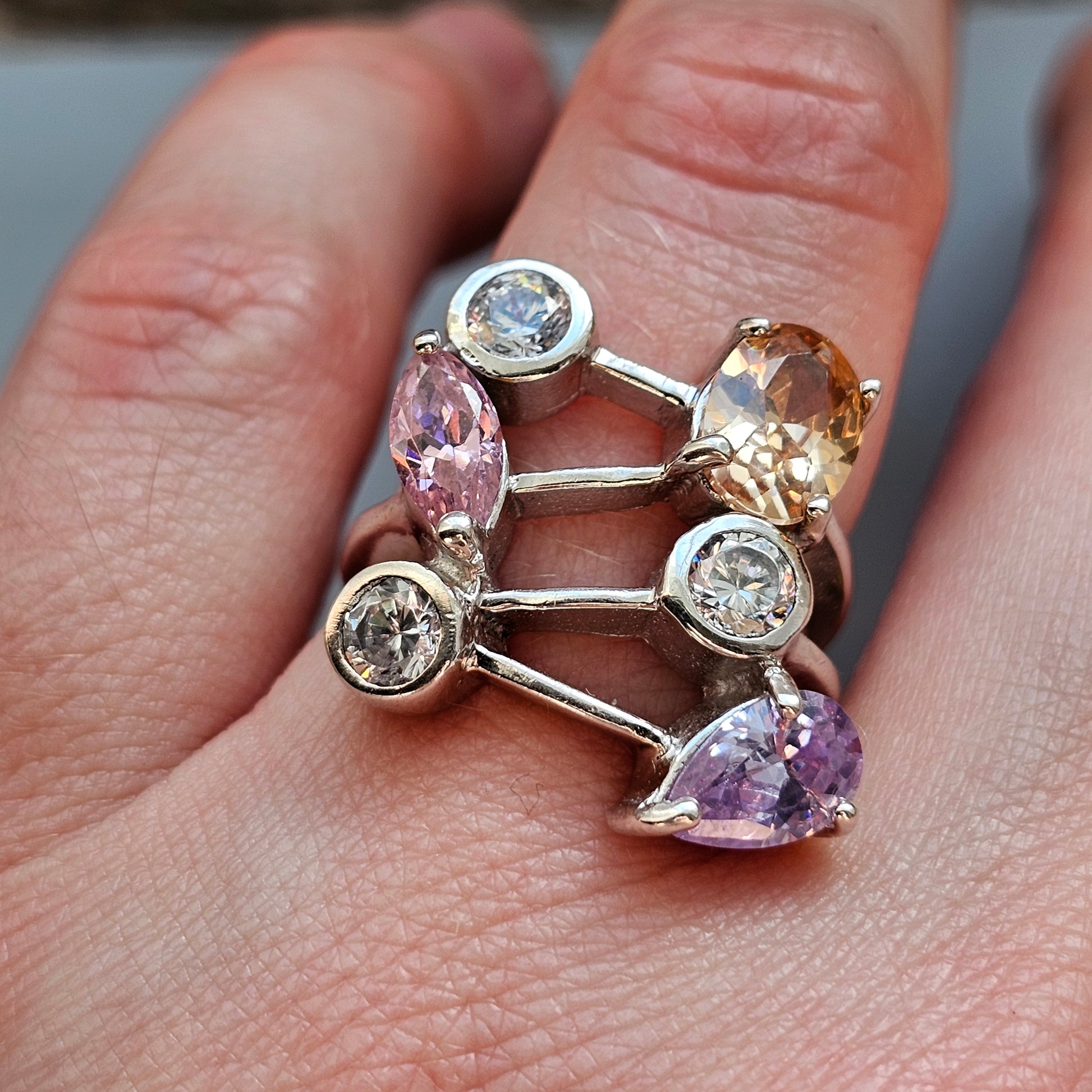 Contemporary sterling silver ring with bezel and prong set clear & multi coloured cubic zirconias.