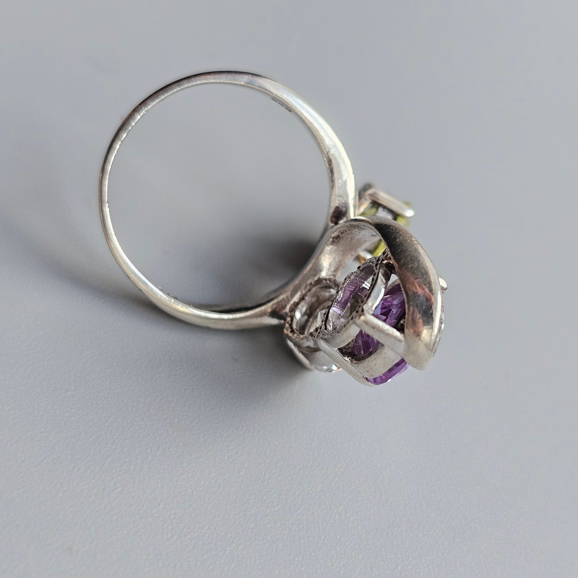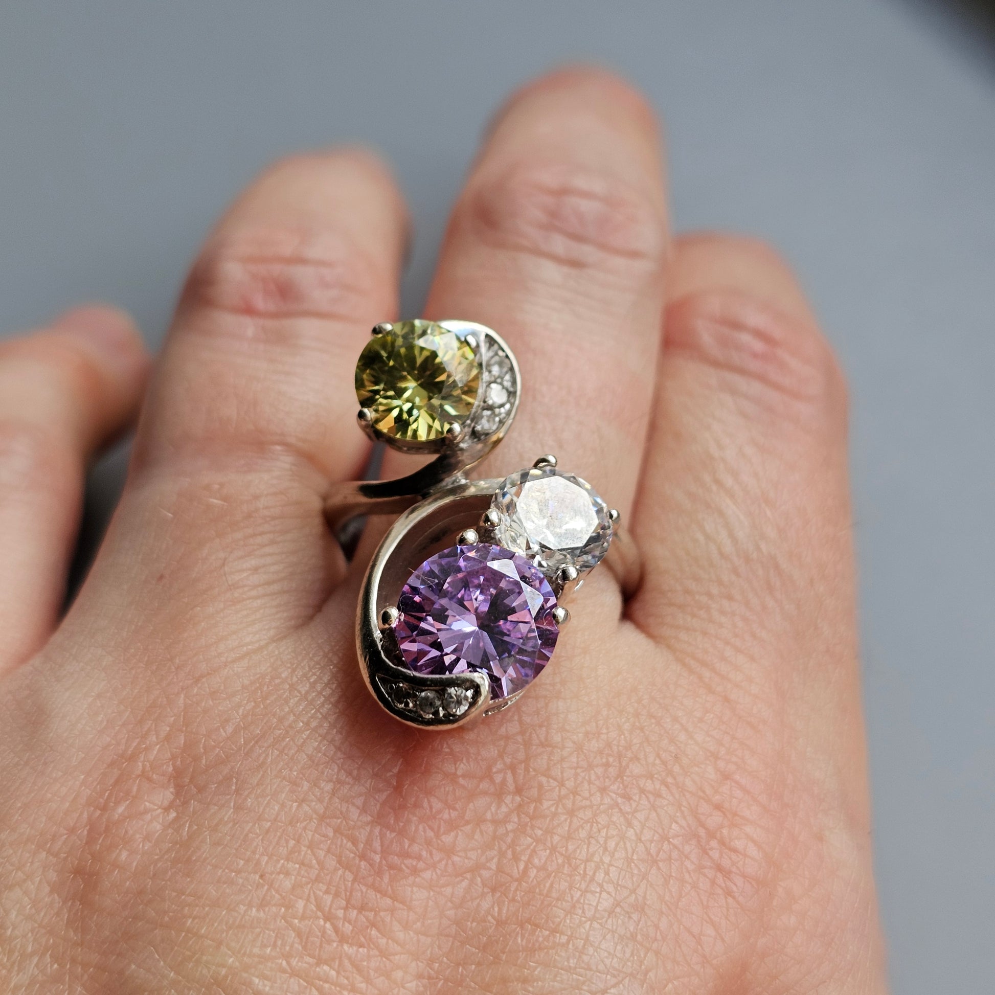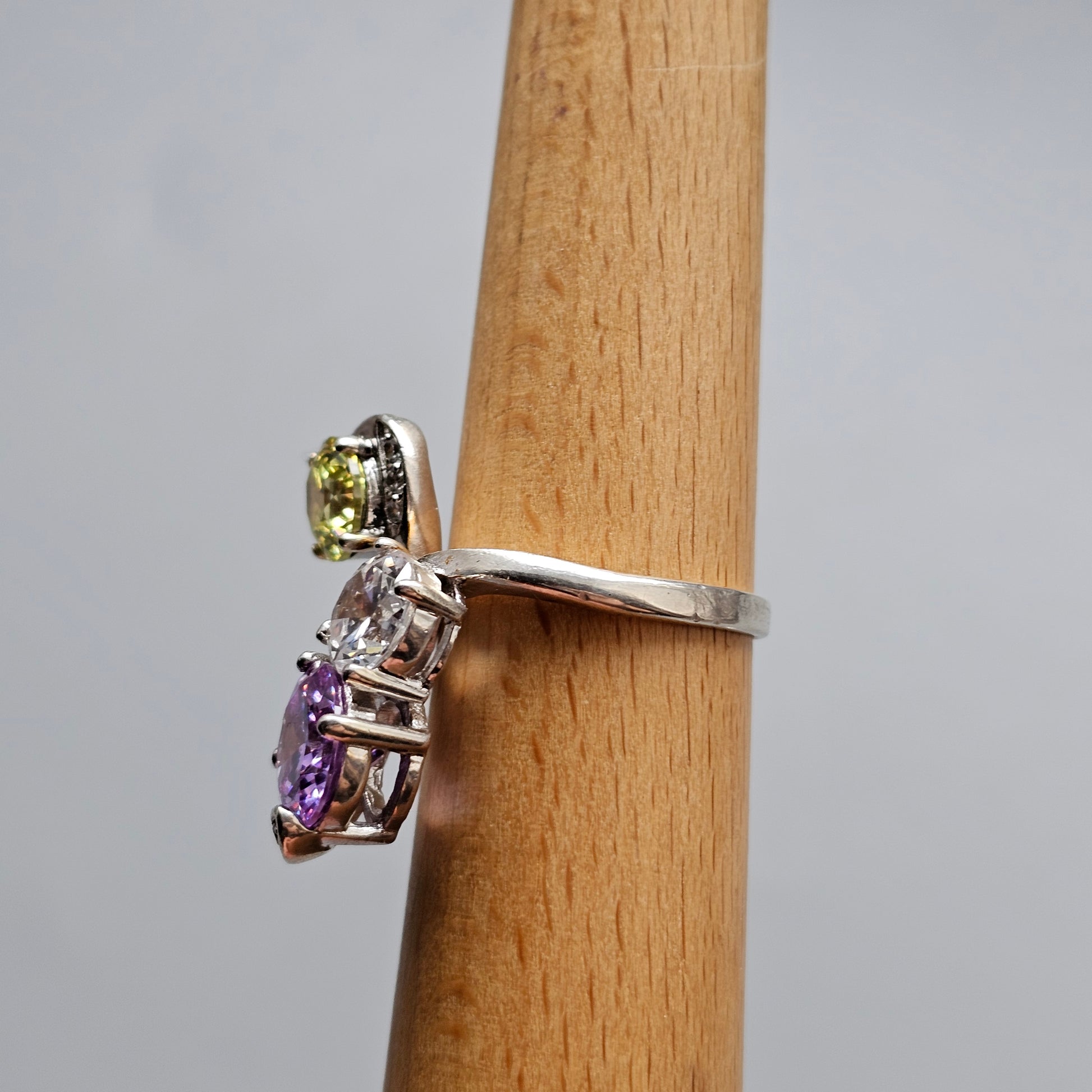 Elegant contemporary silver ring by Swedish jeweller Indo Nordic, featuring a striking triple cubic zirconia design in soft shades of green, lilac, and clear white.