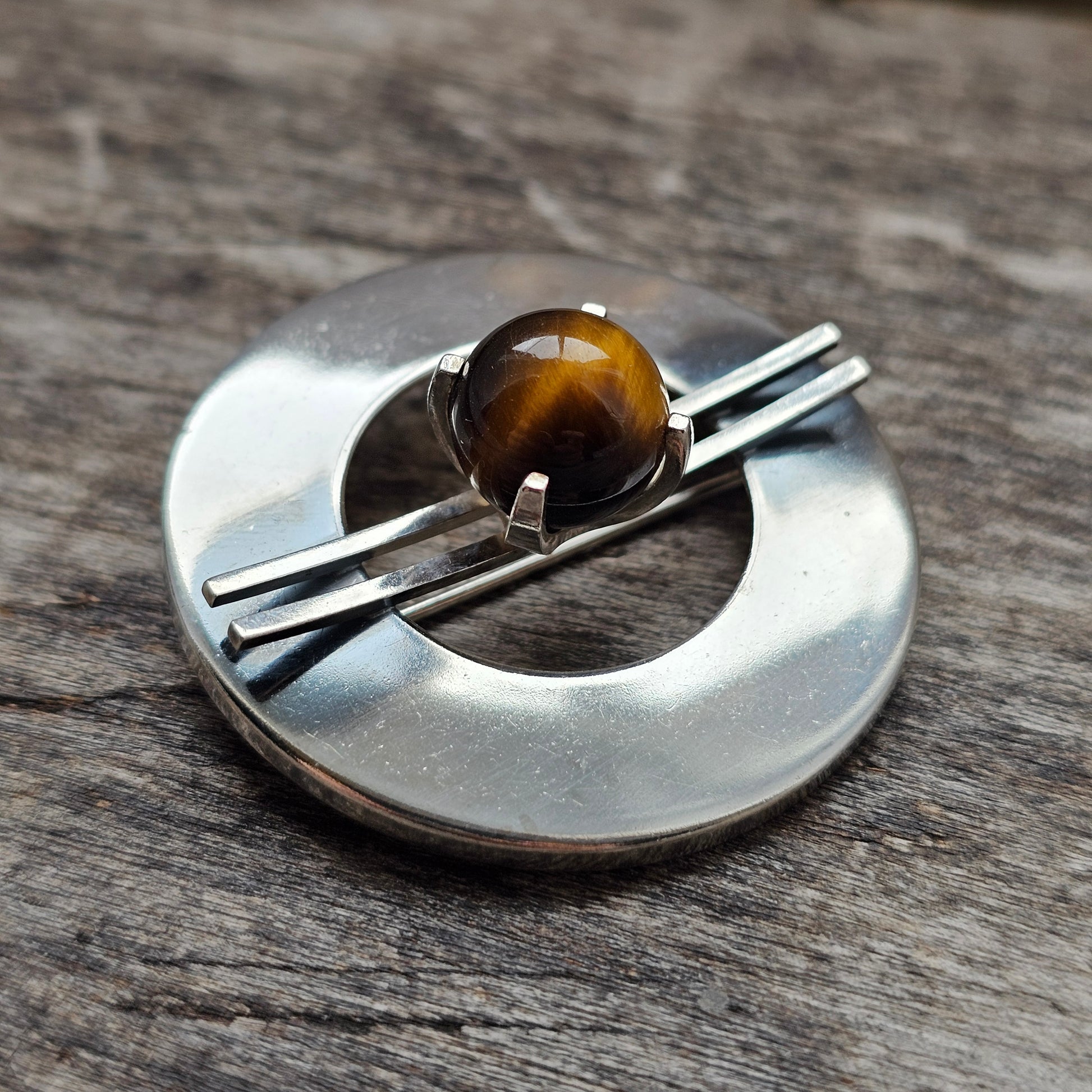 Beautiful vintage silver brooch from Kupittaan Kulta featuring a elevated polished tiger’s eye bead. Strong modernist lines meet natural gemstone warmth, creating a striking Nordic mid-century accessory.