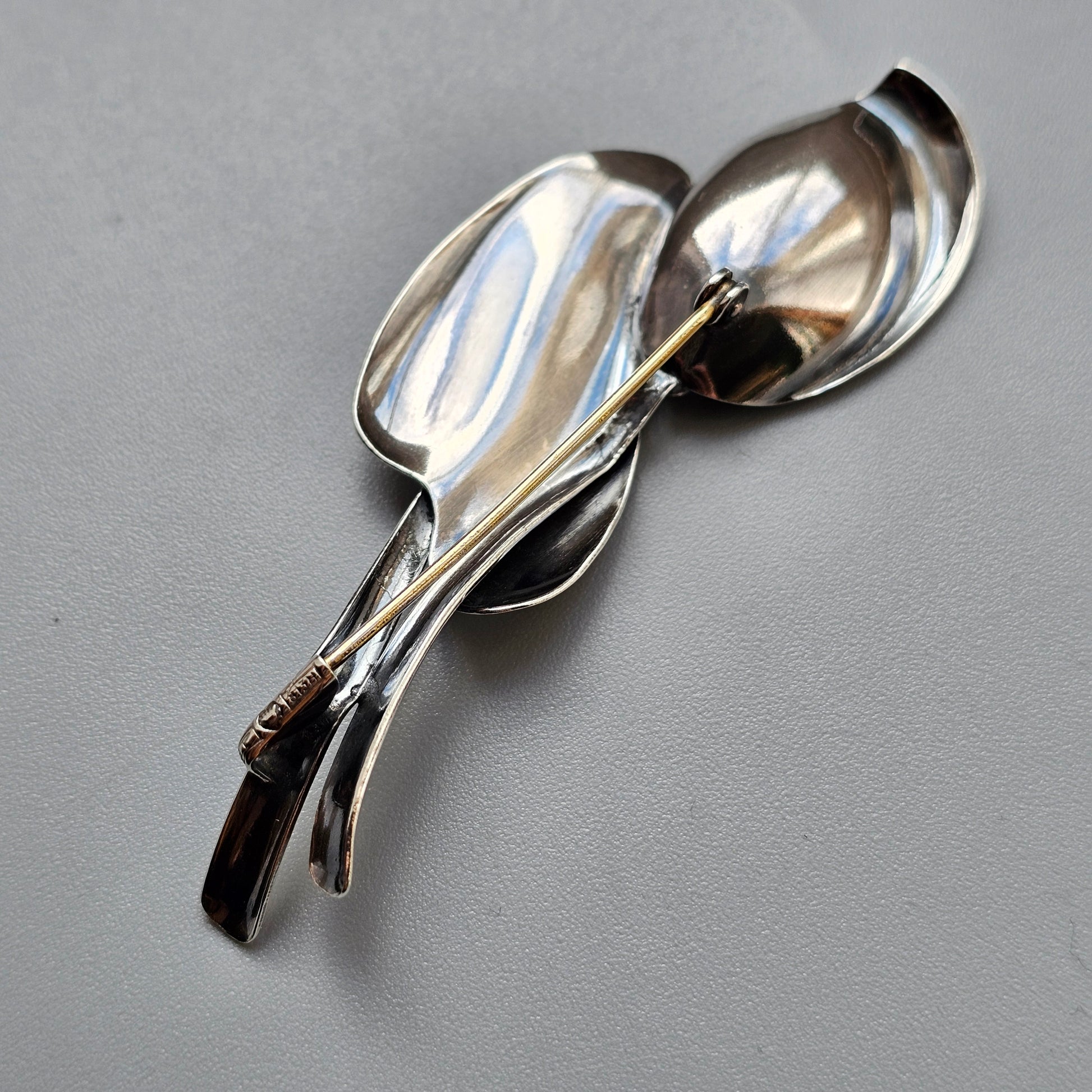 Designed by Elis Kauppi for Kupittaan Kulta, this Finnish silver brooch captures the soft curves of a peace lily in clean, modernist form. With its flowing lines and polished finish, it’s simple, sculptural, and unmistakably mid-century in feel.