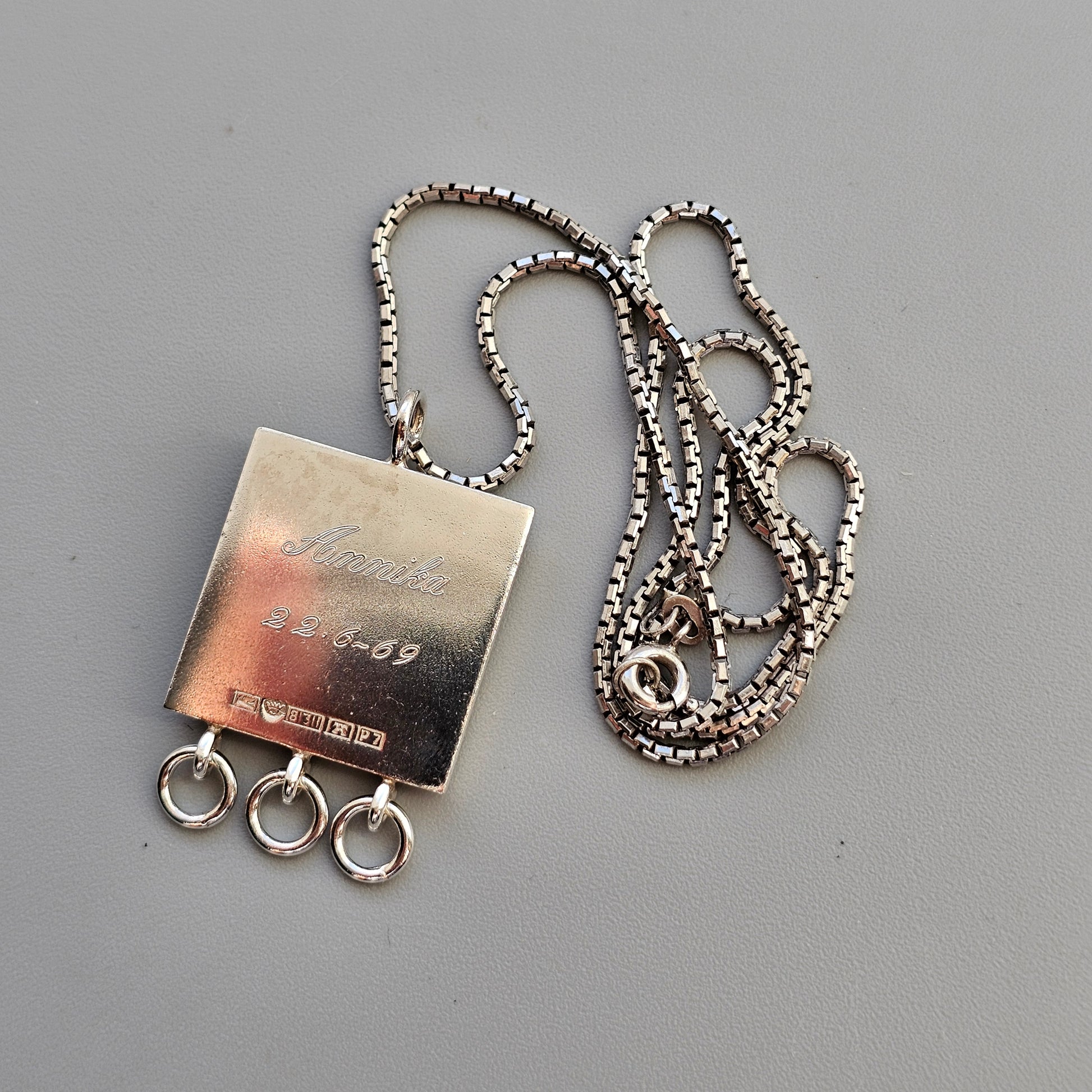 Hallmarks: Kultateollisuus Oy makers mark, Finnish Crown Mark, 813h for 813h grade silver, Turku City assay mark, date letter P7 for year 1968.