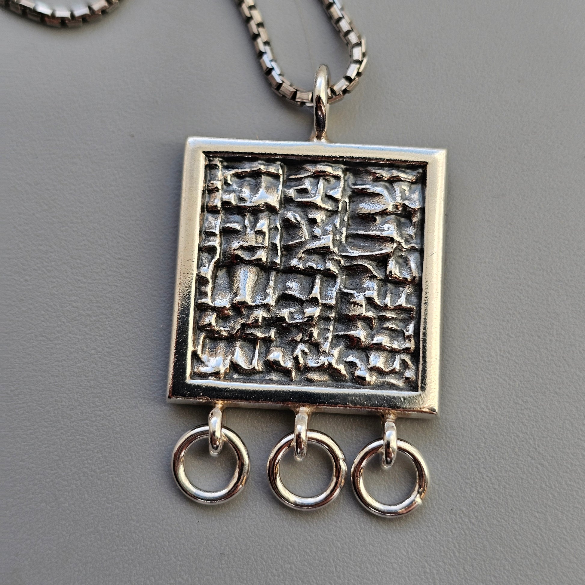 A Finnish modernist silver pendant from the 1960s with a bold, sculptural Brutalist surface. The square front features a textured relief with an abstract, irregular pattern, framed by a smooth border. Three circular hanging loops sit along the bottom edge, giving the pendant movement and a slightly architectural feel when worn.