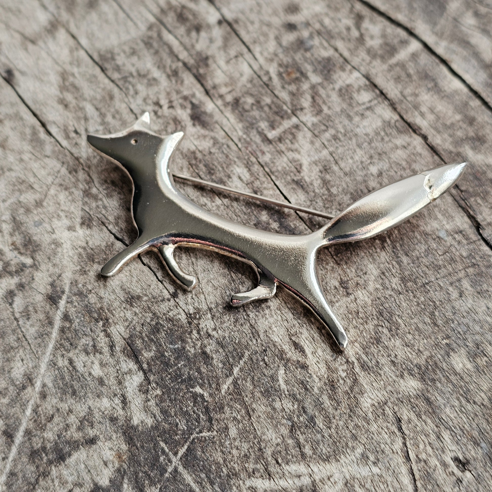A beautifully stylised silver fox brooch. This design has a light, playful feel — the fox shown mid-stride with a lifted tail and clean, flowing lines. The satin-finished body contrasts gently with the polished edges, giving the piece a lively sense of motion when it catches the light.