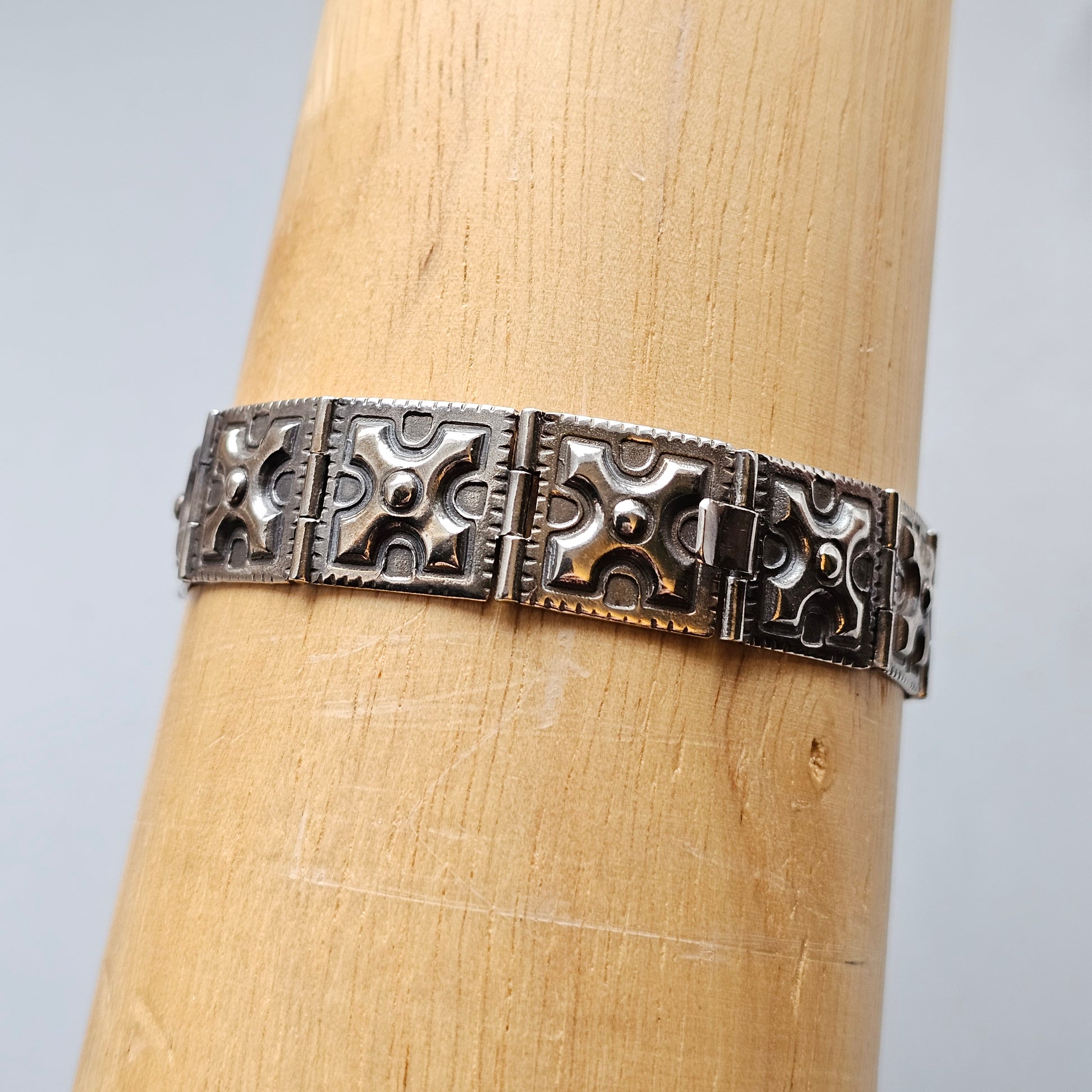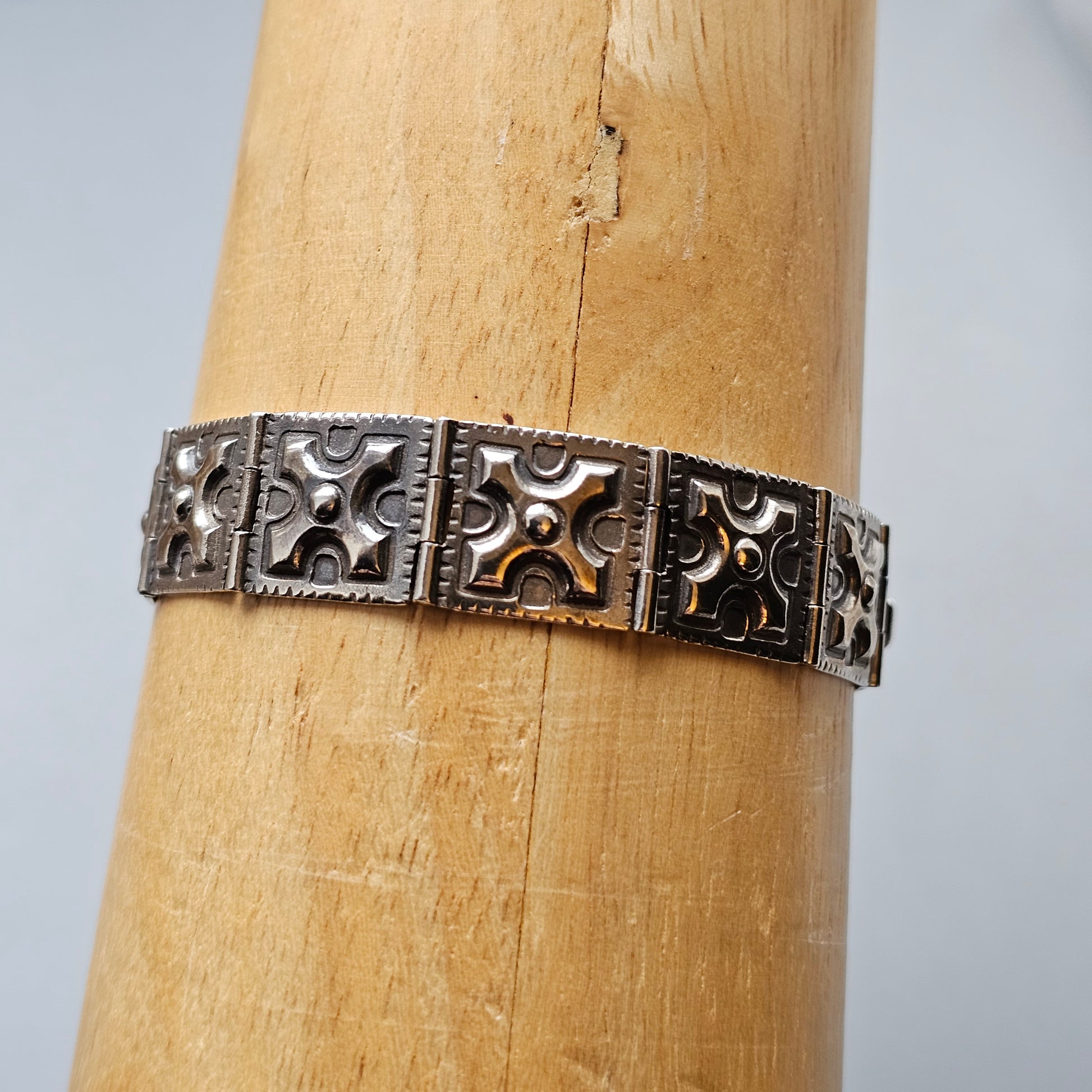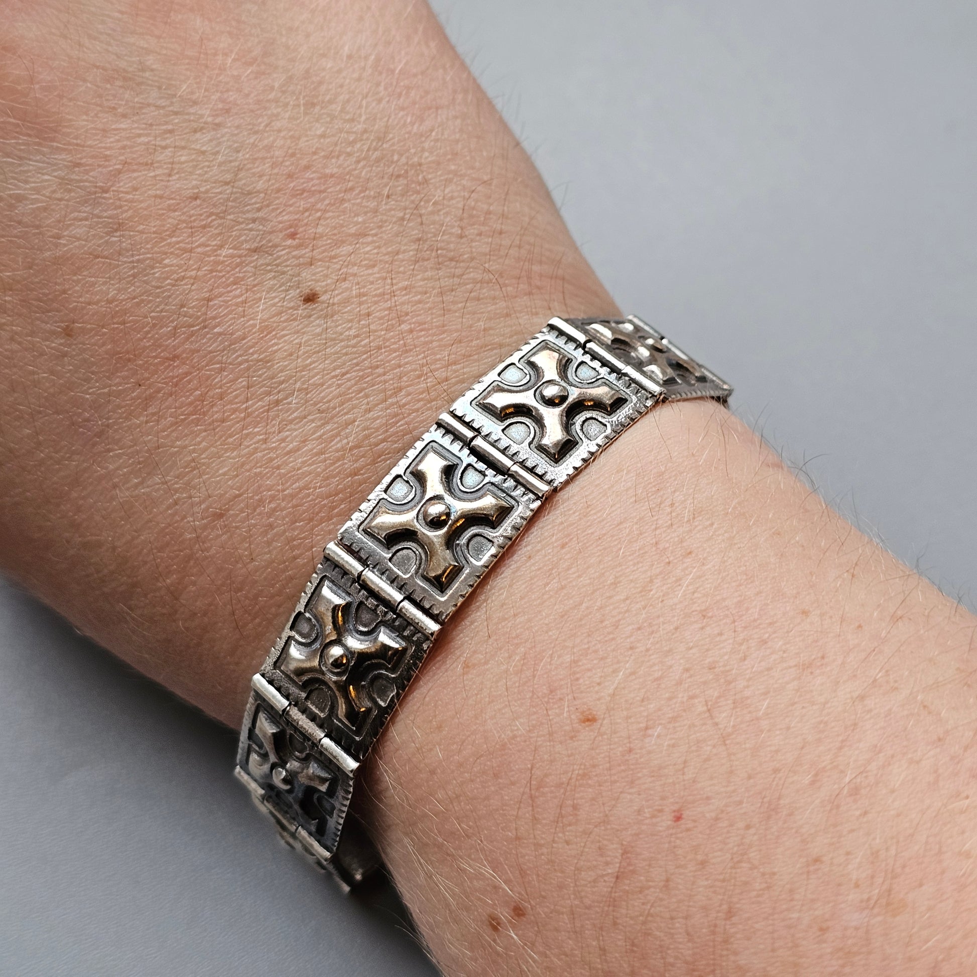 A silver bracelet from Mikko Koivula’s Ylöjärvi series, designed with inspiration drawn from Viking Age artefact finds. The bracelet is formed from linked rectangular panels, each featuring raised geometric motifs and central domed details. The patterning and structure reflect the ornamentation seen in early medieval metalwork, translated here into a clean, wearable modern piece.