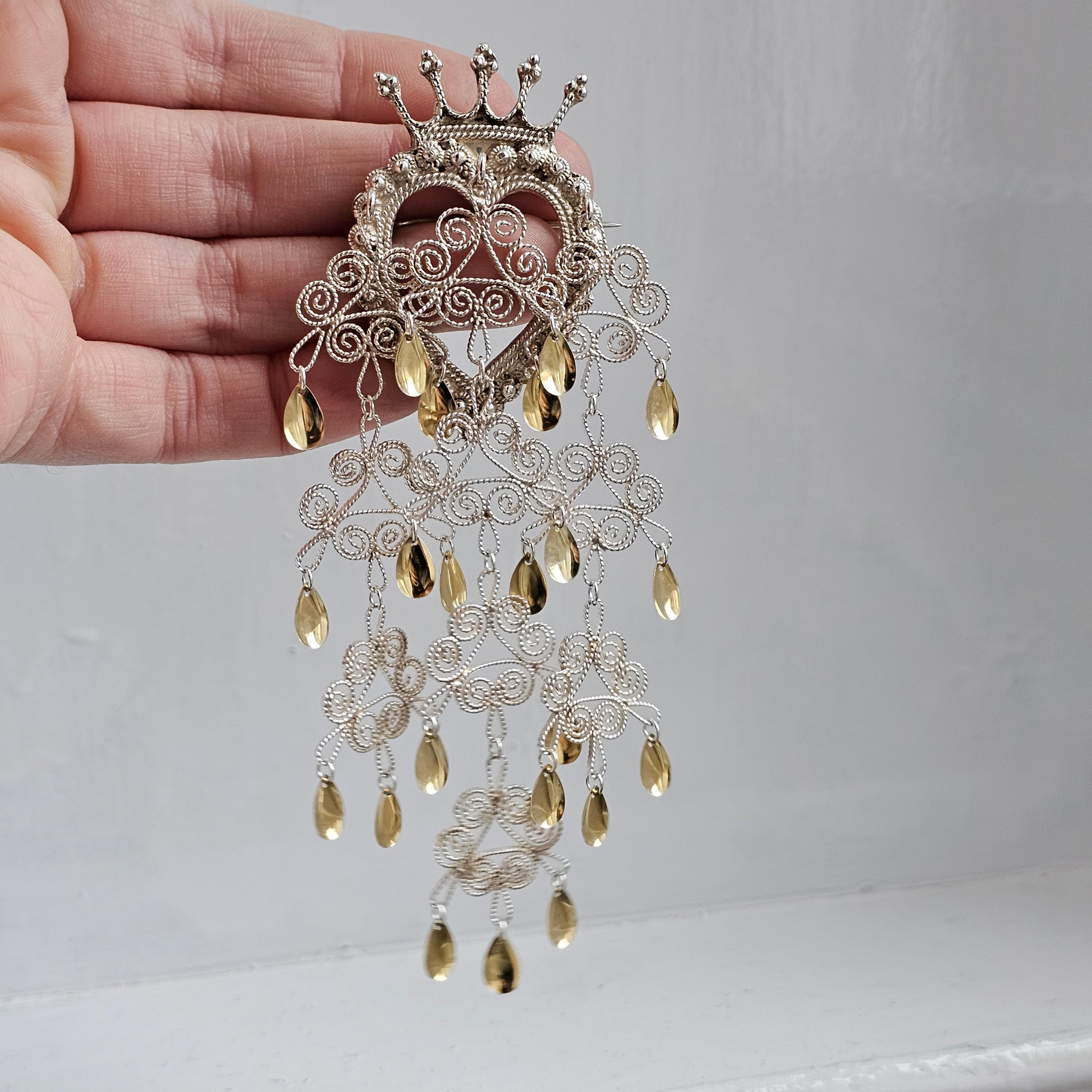 Large Traditional Norwegian Dangly Silver Filigree Crown Heart Solje Brooch