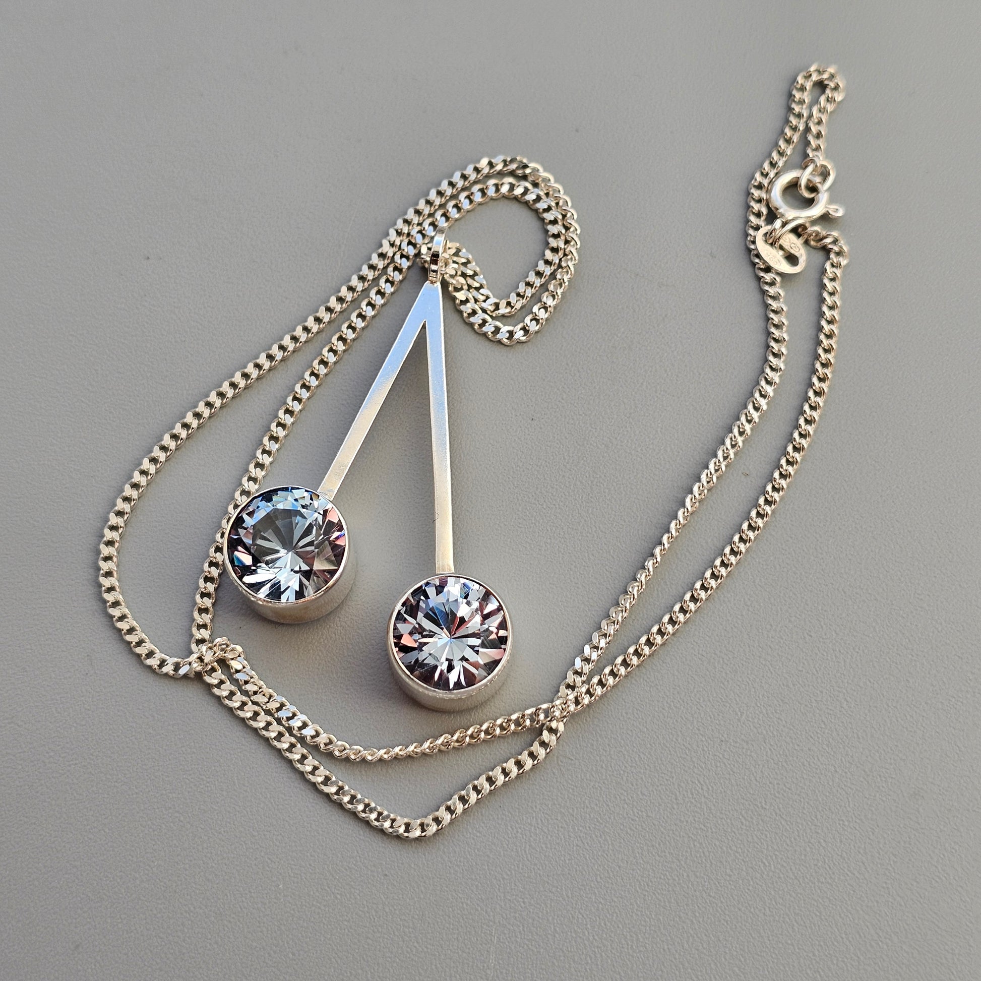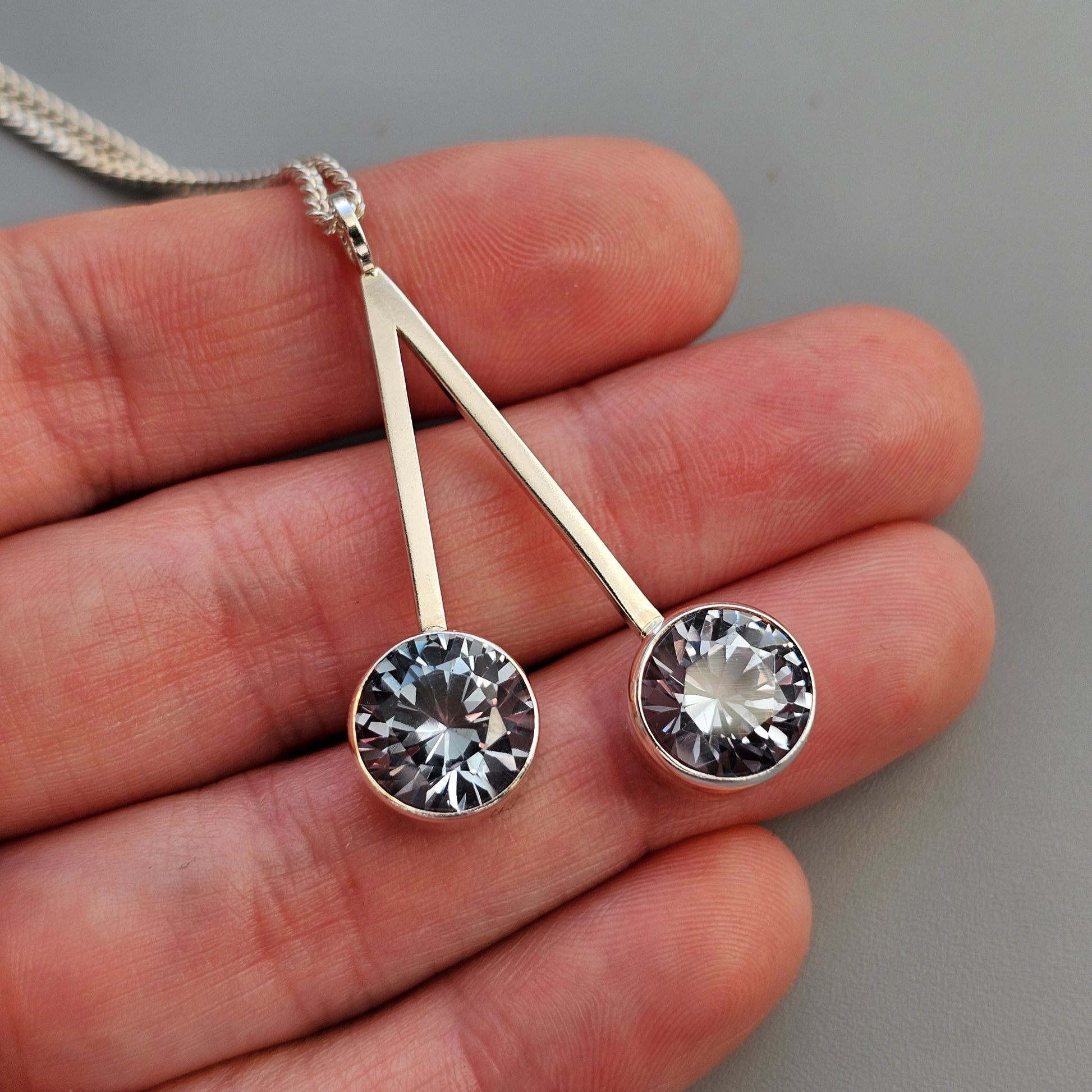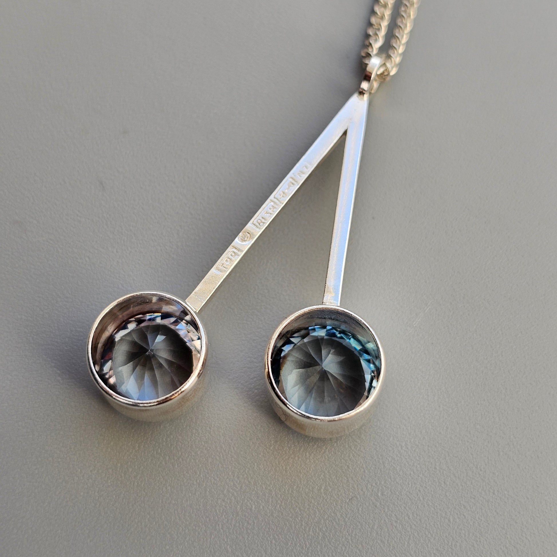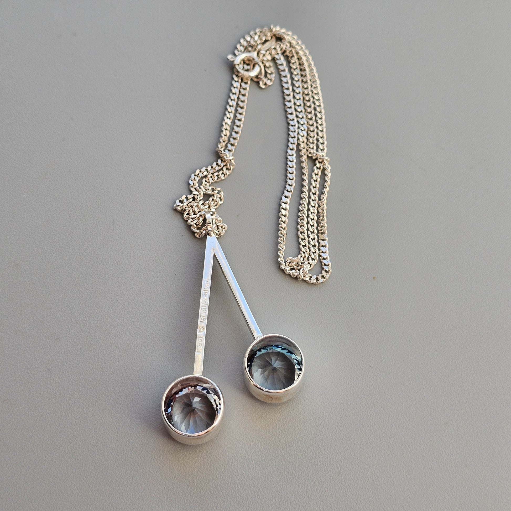 A sleek and minimal vintage Finnish modernist pendant from the 1960s, designed by Tuomo Rissanen. The piece is crafted in silver and set with two round lab-created blue spinel stones, positioned asymmetrically on a clean geometric frame. The stones have a bright, icy blue tone with strong light reflection, giving the pendant a striking but streamlined presence.