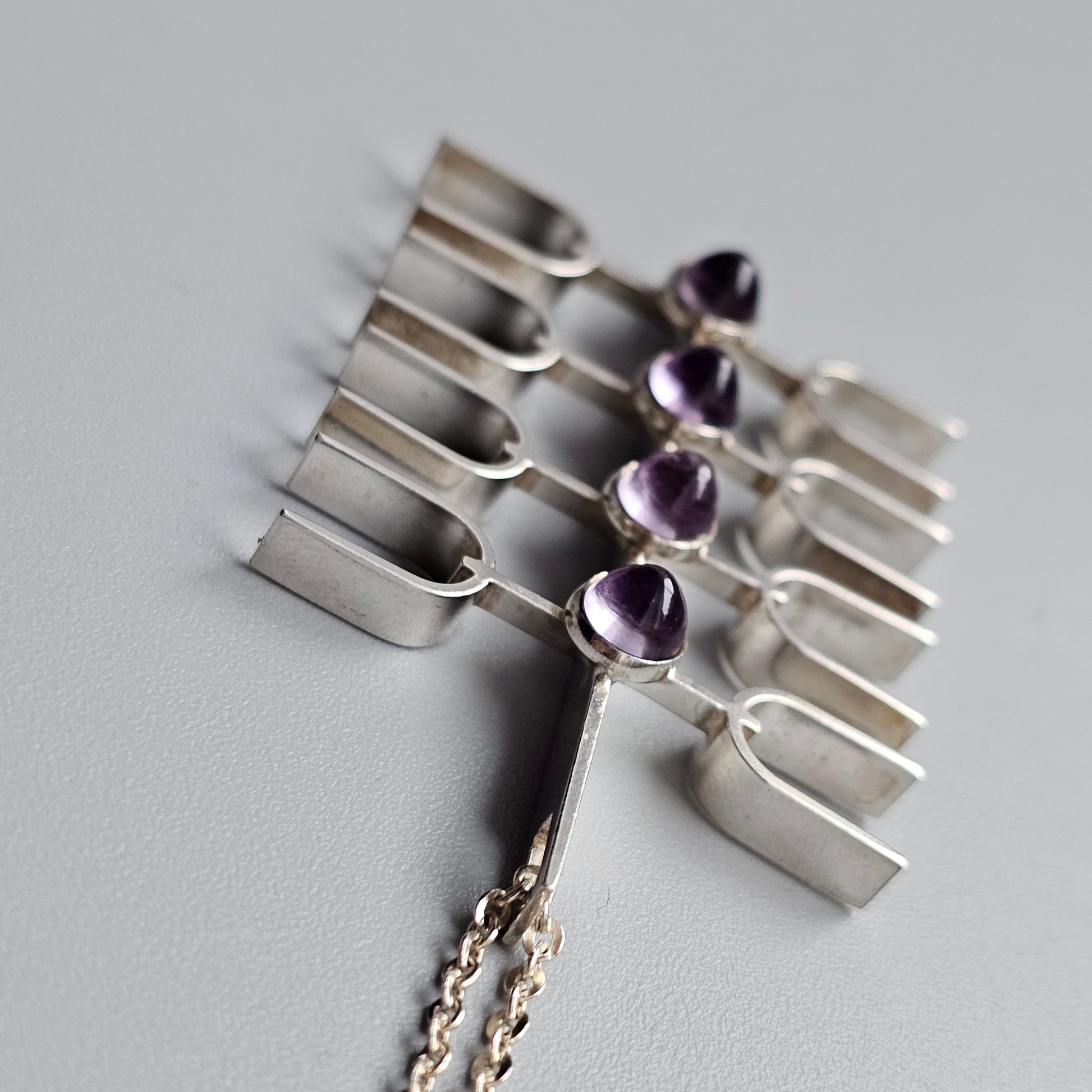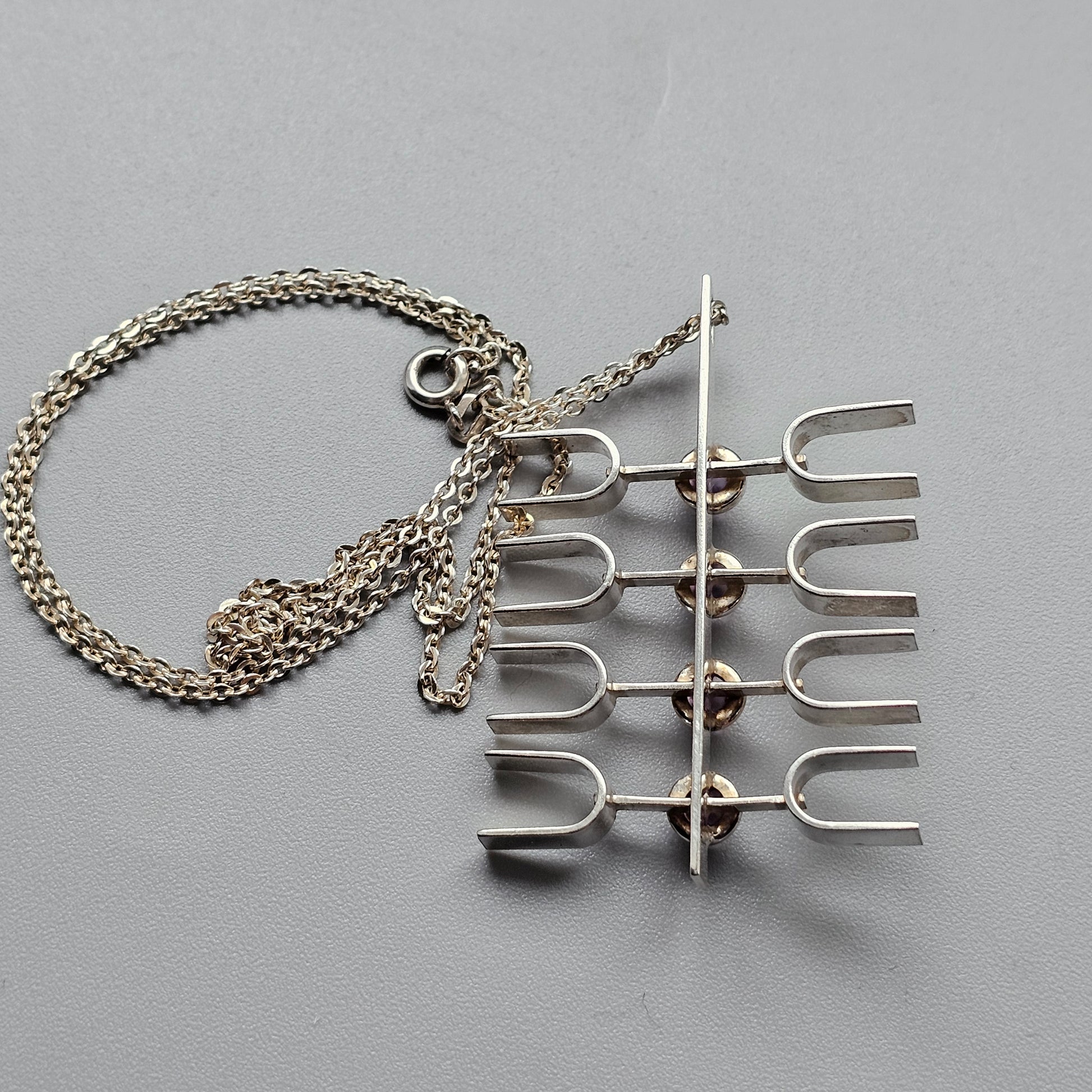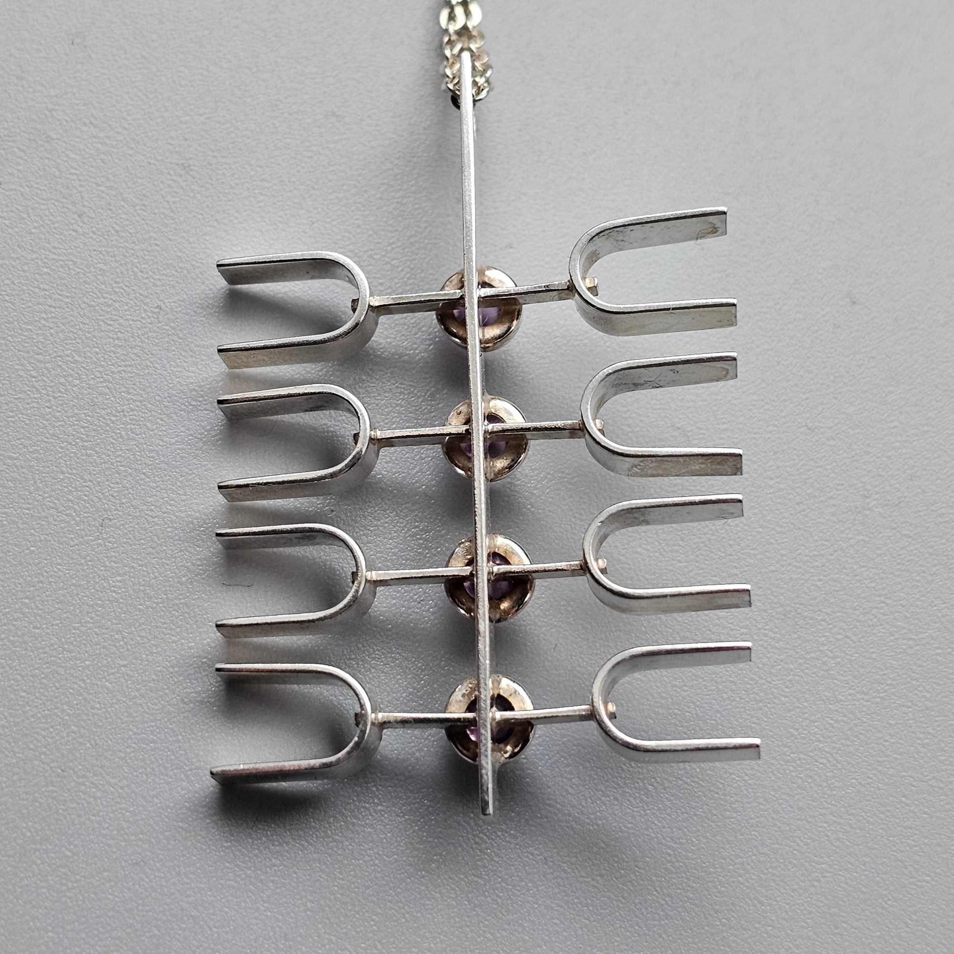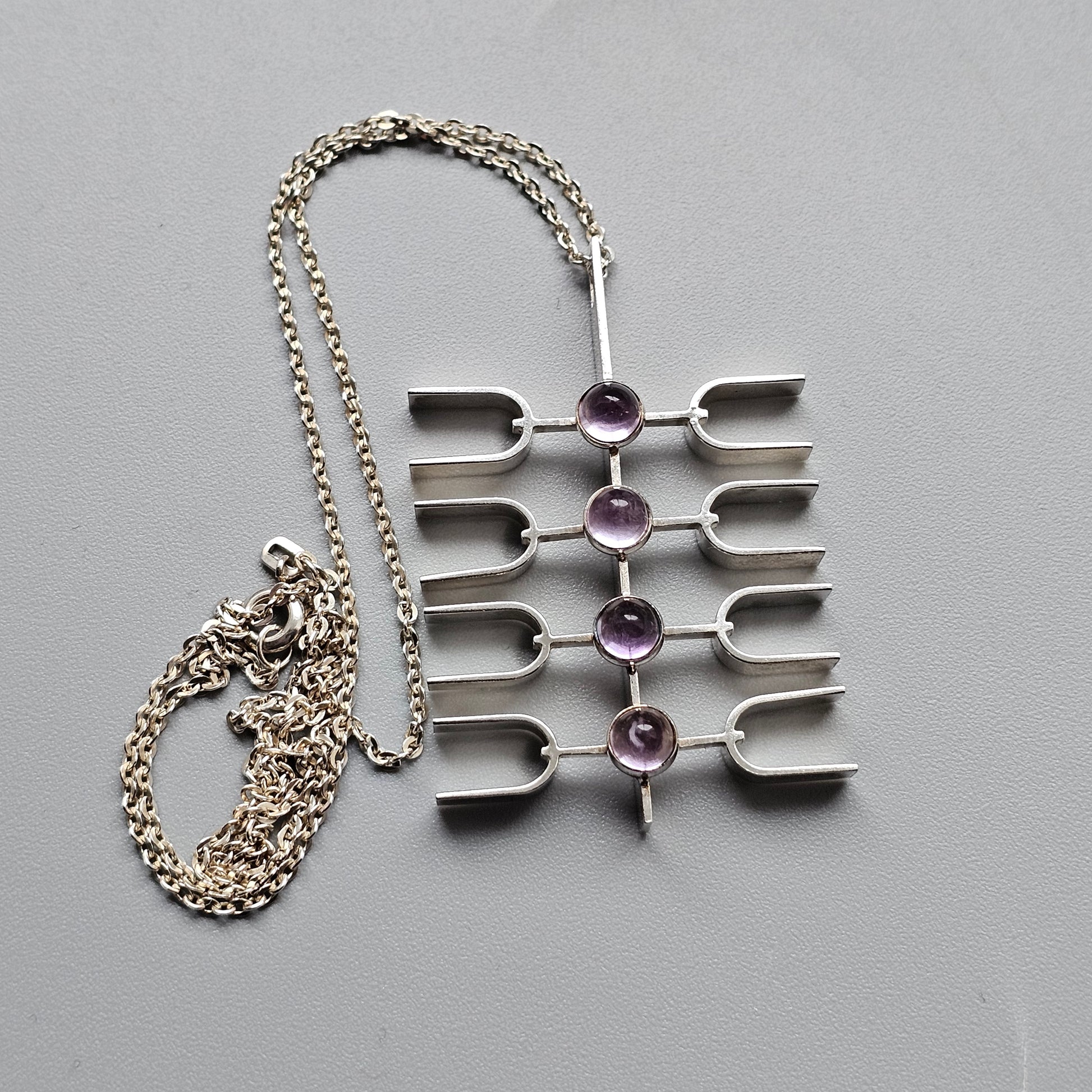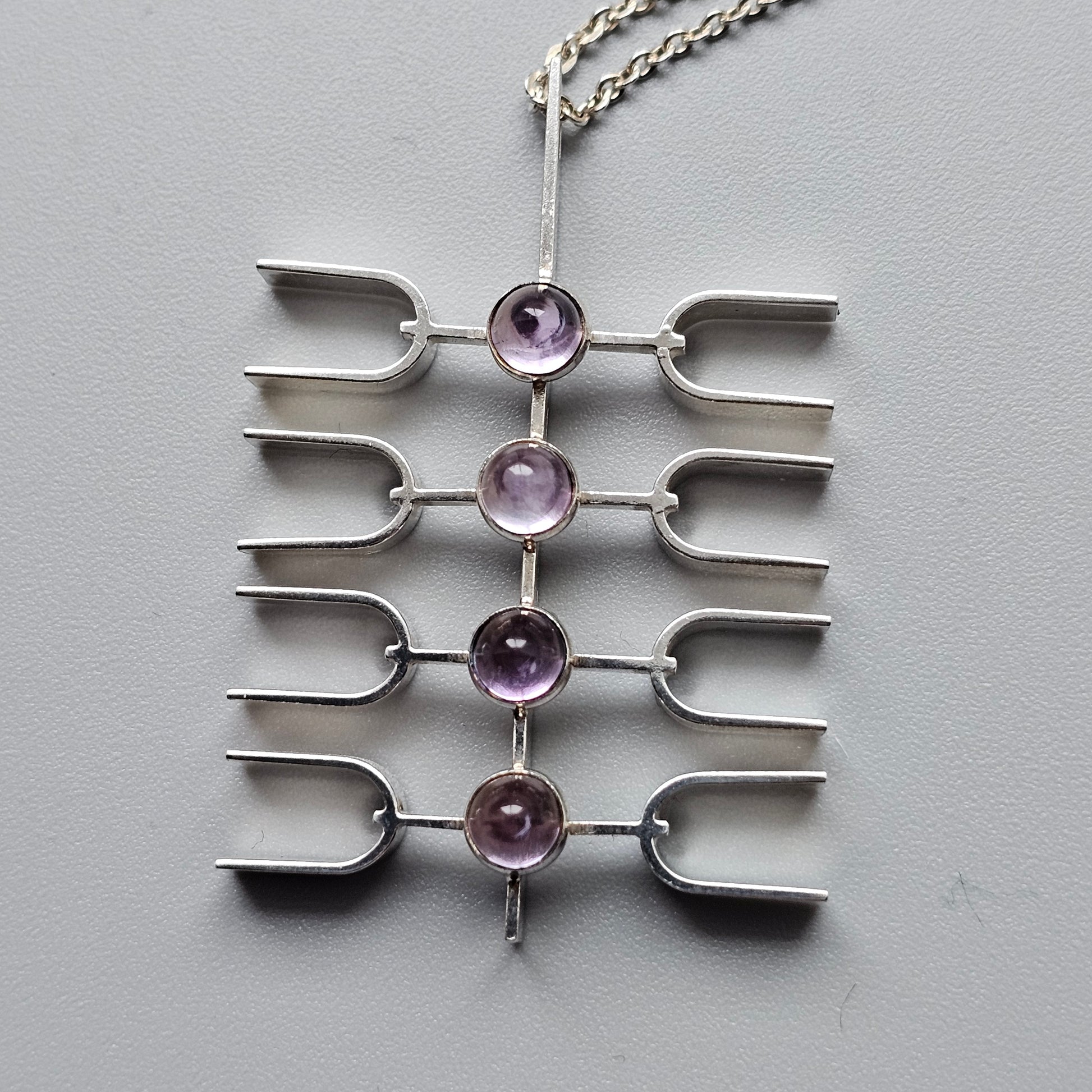A sculptural silver pendant from the 1960s by Kultasepät Salovaara. The design features a vertical bar with four evenly spaced horizontal elements, each set with a rounded amethyst cabochon. The structure gives the piece an architectural and open form, with clean lines and balanced spacing typical of mid-century Finnish design.