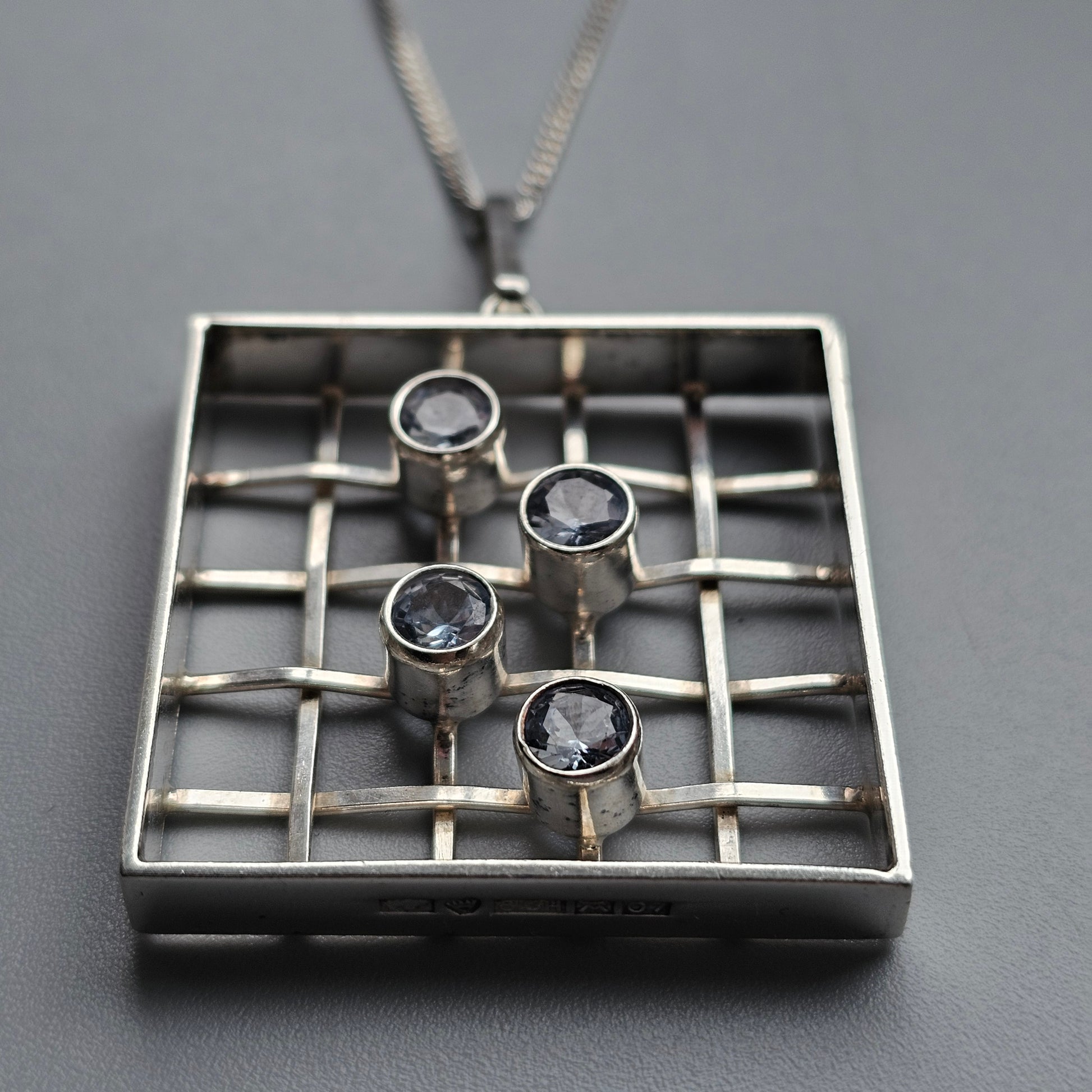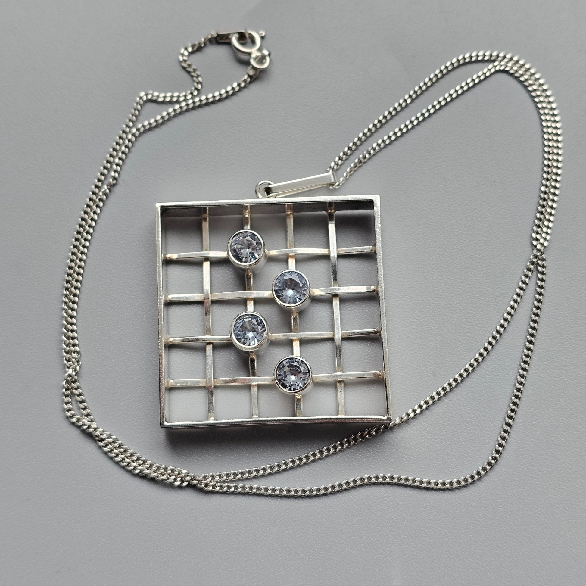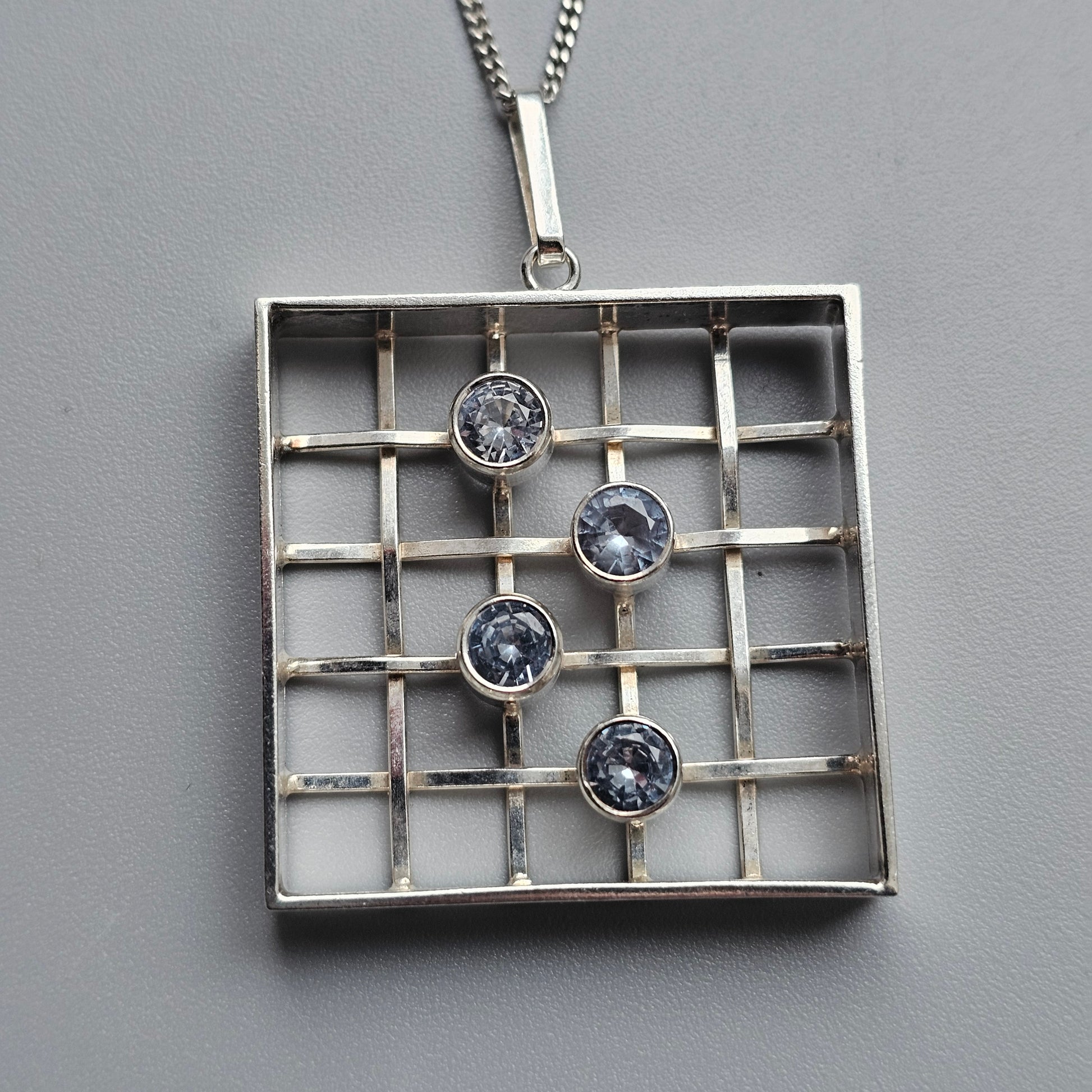 A vintage Finnish modernist silver pendant from the late 1960s, designed and made by Kultaseppä Salovaara. The pendant features a grid-like openwork structure with five bezel-set lab-created blue spinel stones. The geometric layout and clean lines give it a distinct mid-century Scandinavian feel.