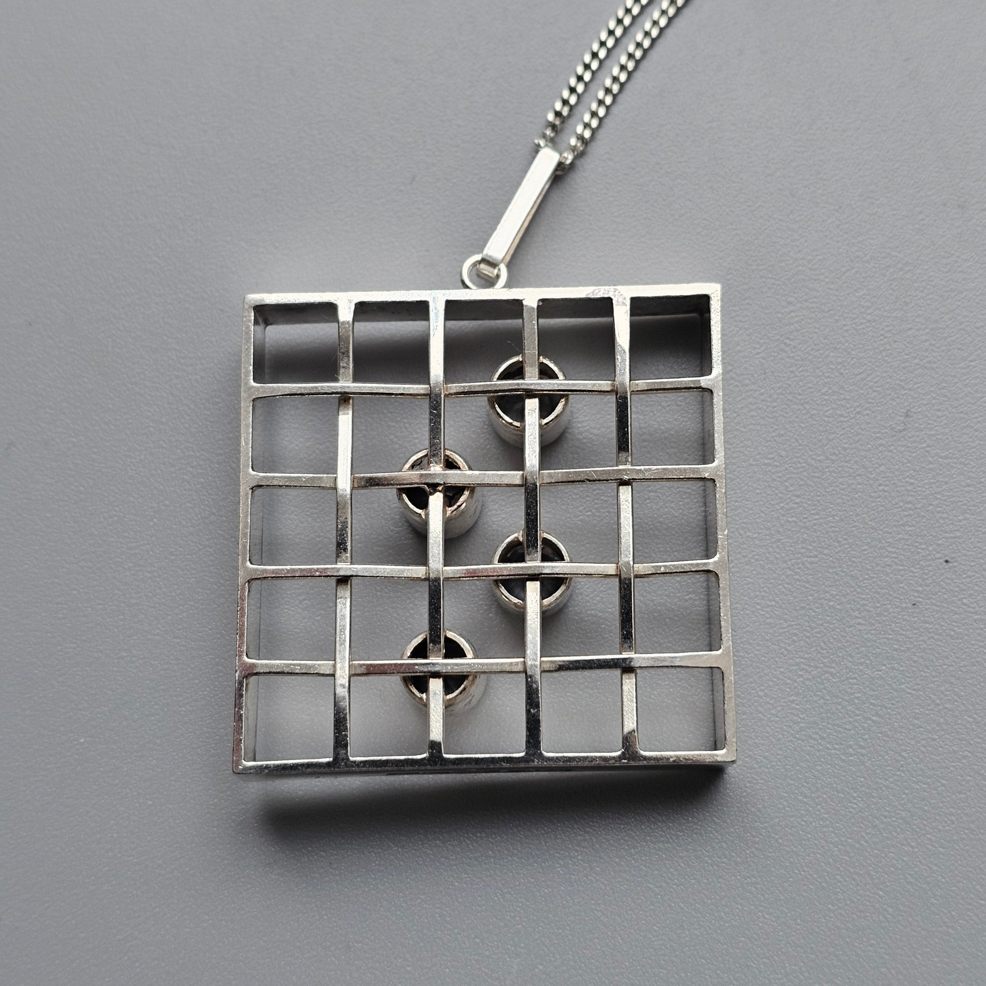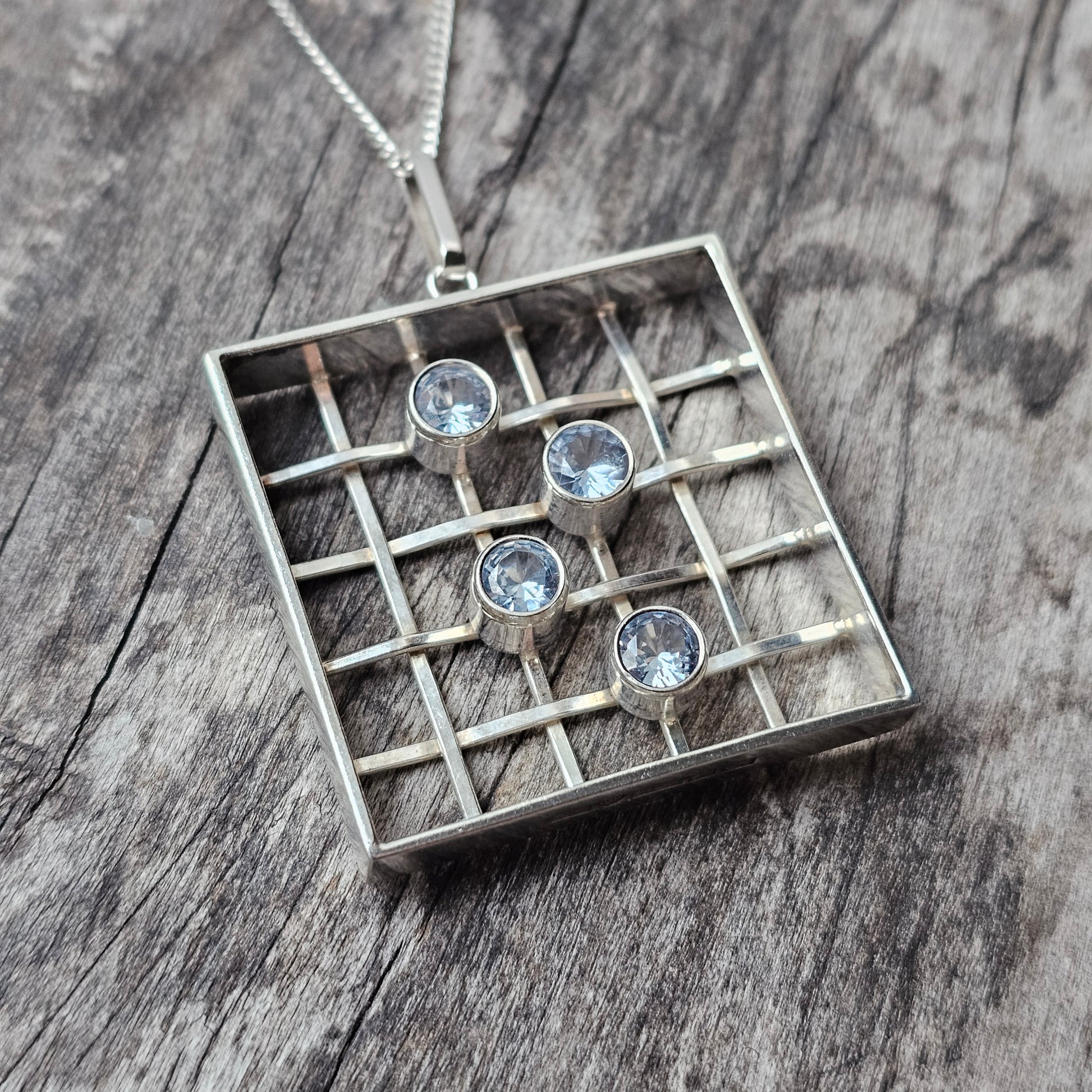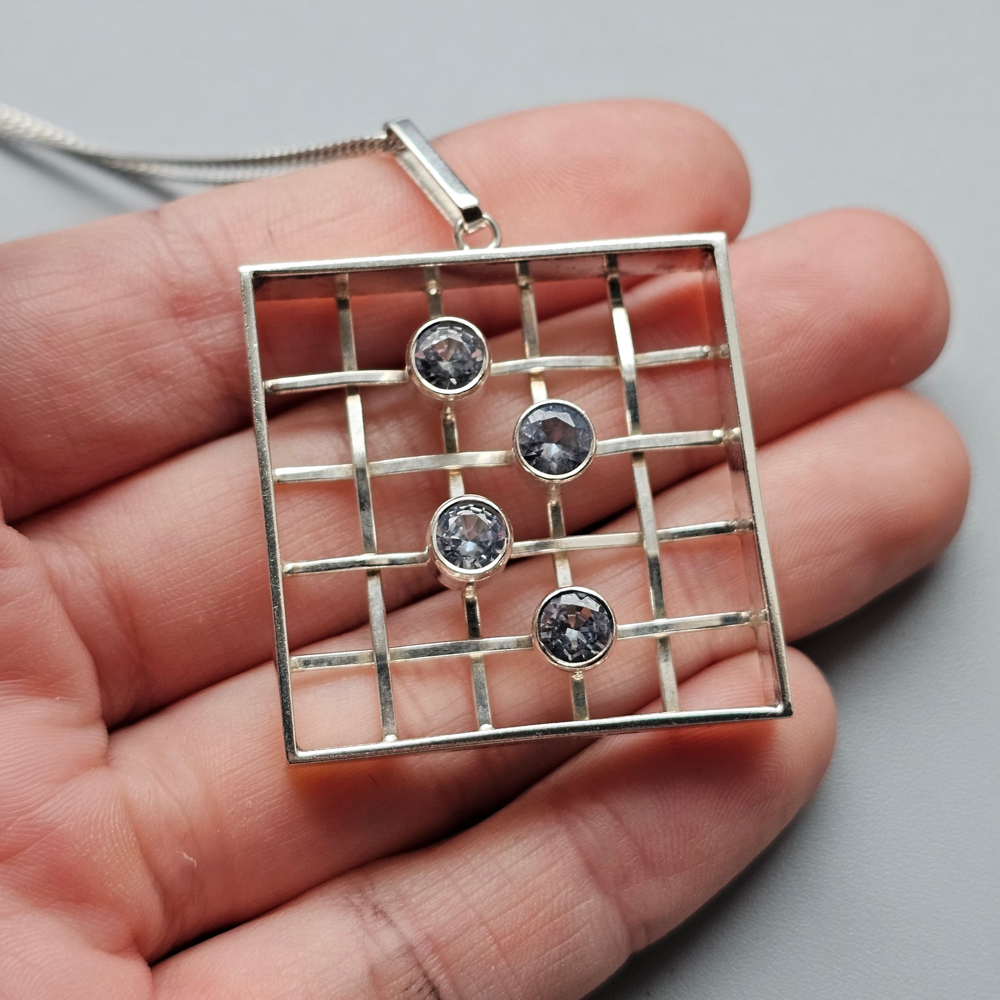 A vintage Finnish modernist silver pendant from the late 1960s, designed and made by Kultaseppä Salovaara. The pendant features a grid-like openwork structure with five bezel-set lab-created blue spinel stones. The geometric layout and clean lines give it a distinct mid-century Scandinavian feel.