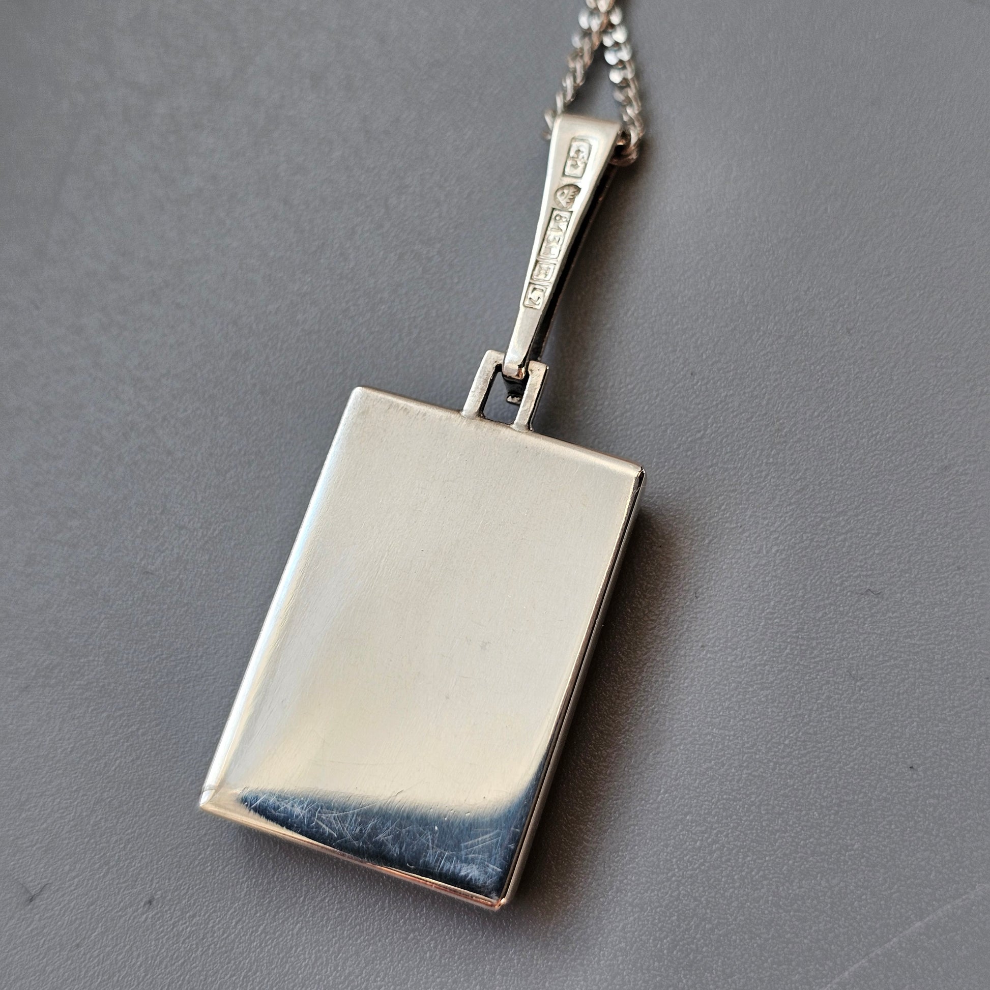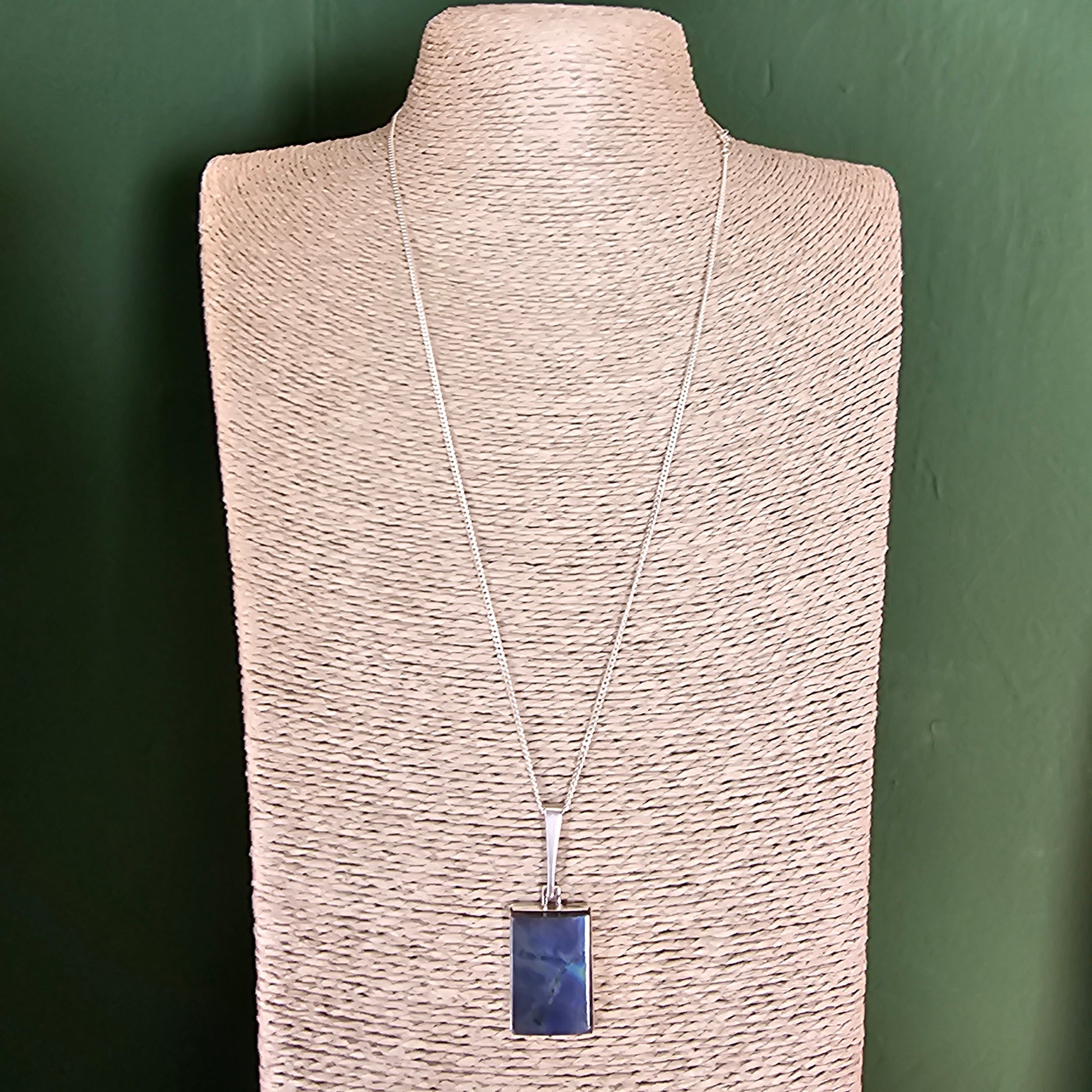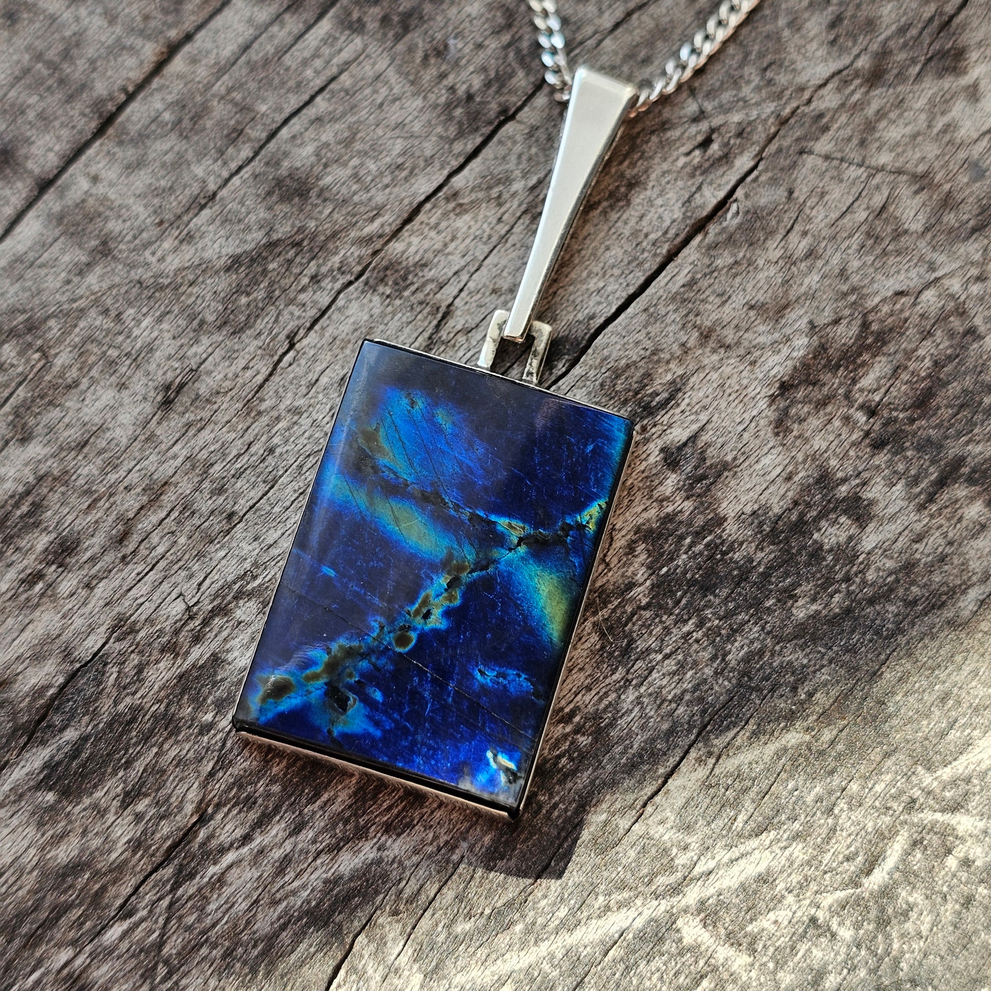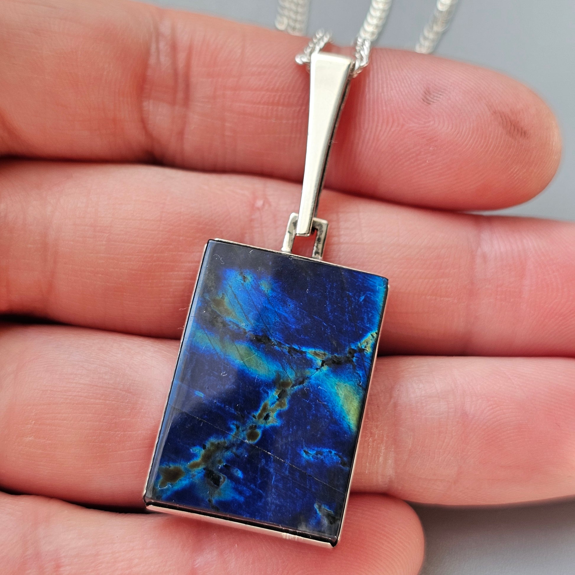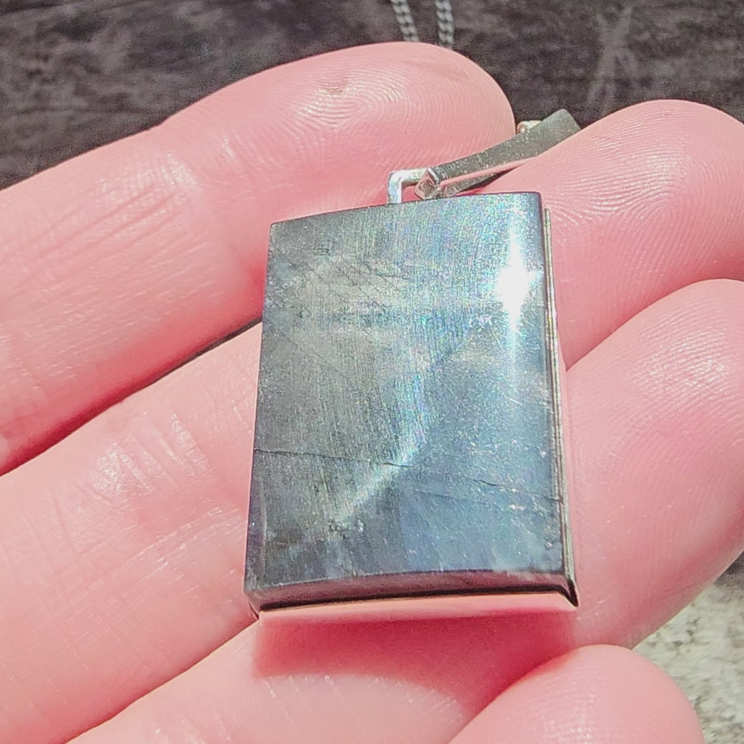 Rectangular modernist silver pendant set with a spectrolite cabochon displaying a strong, storm-like pattern. The stone has a very fine hairline crack, visible on close inspection.