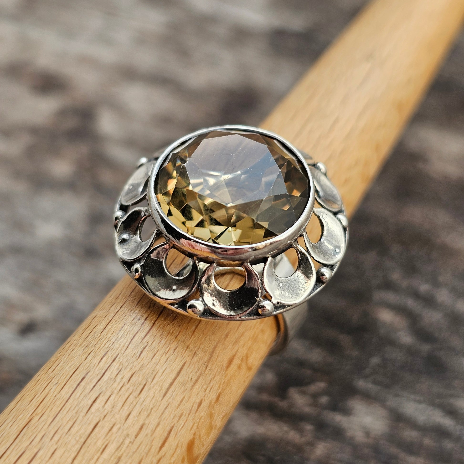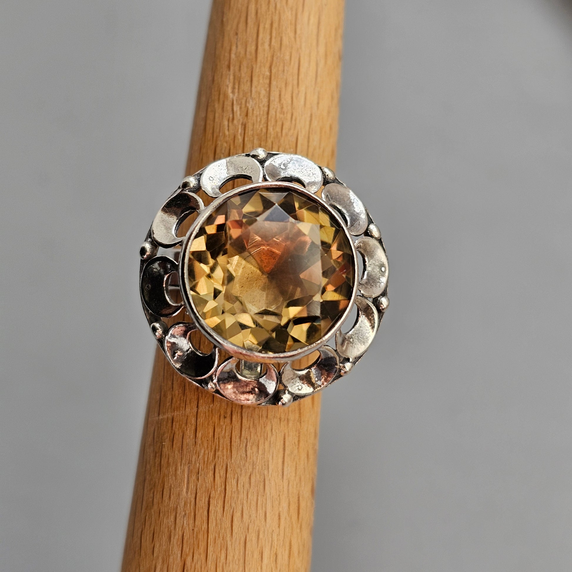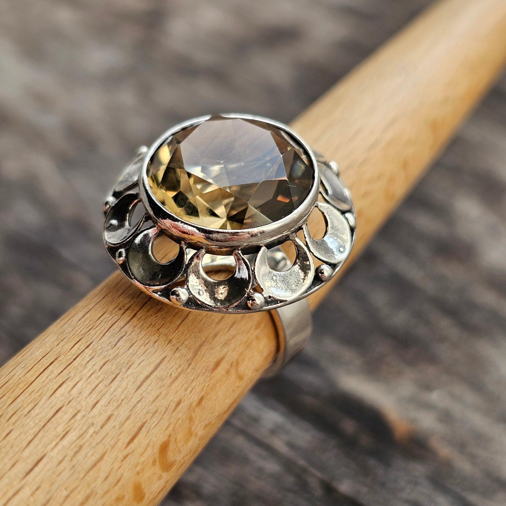 This Finnish silver ring from the 1970s features a large faceted smokey quartz set in an openwork circular mount. The stone sits in a raised bezel, surrounded by a patterned silver frame made up of repeated cut-out elements.