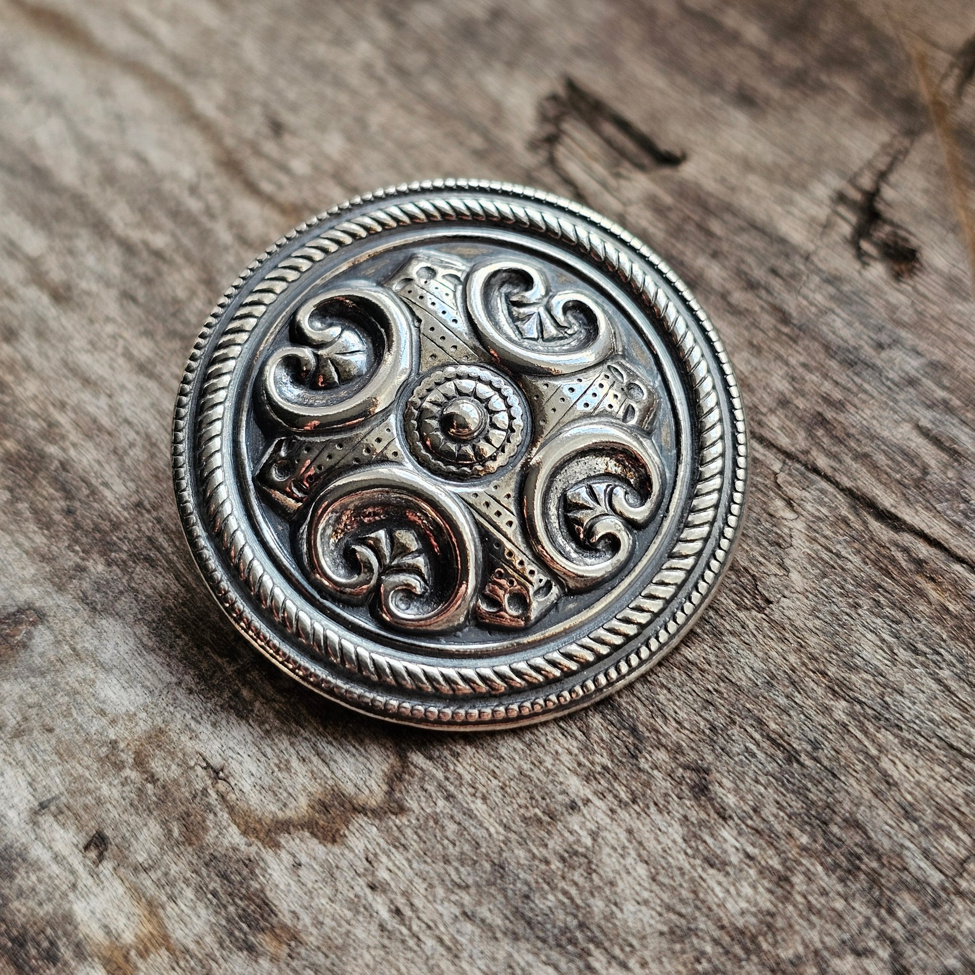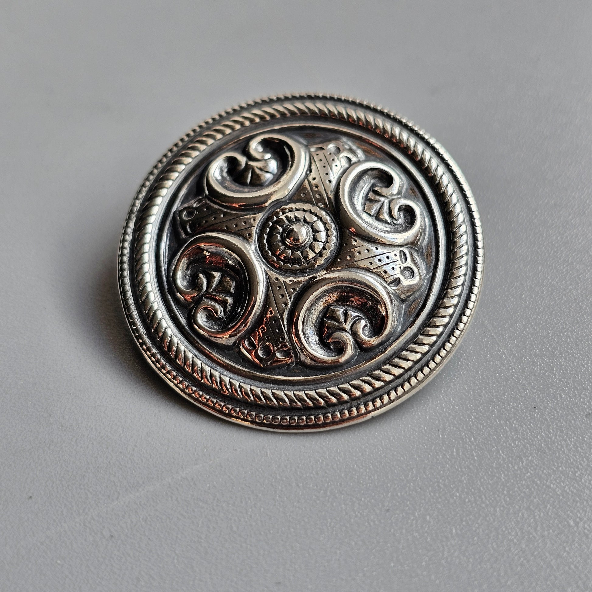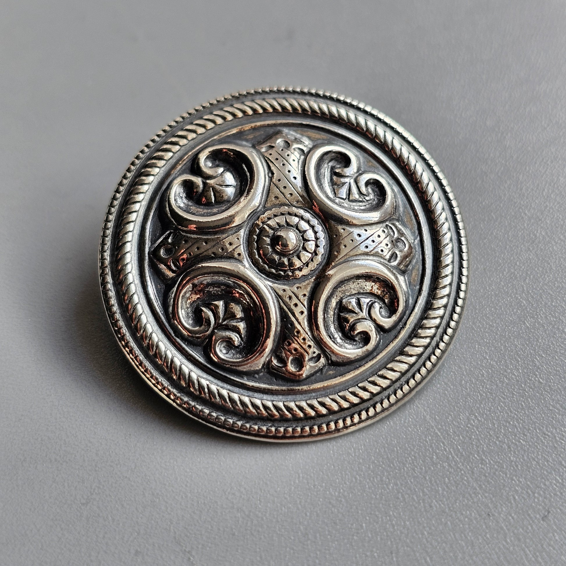 Small Vintage Kalevala Koru Räisälä Cross Sterling Silver Round Brooch – 12th Century Nordic Middle Ages Revival Design, Finland 1998
