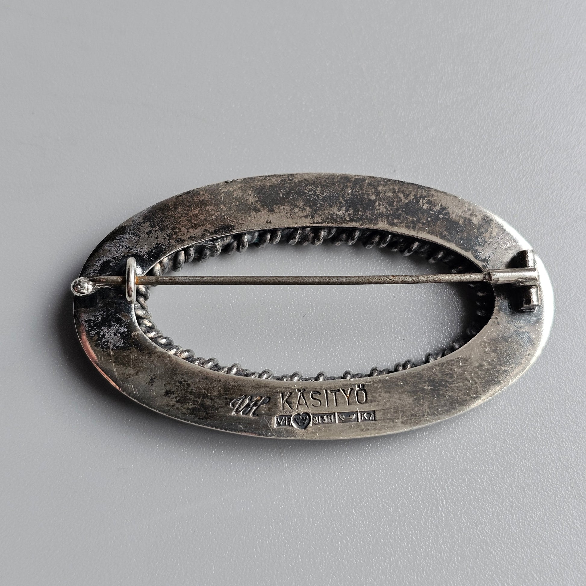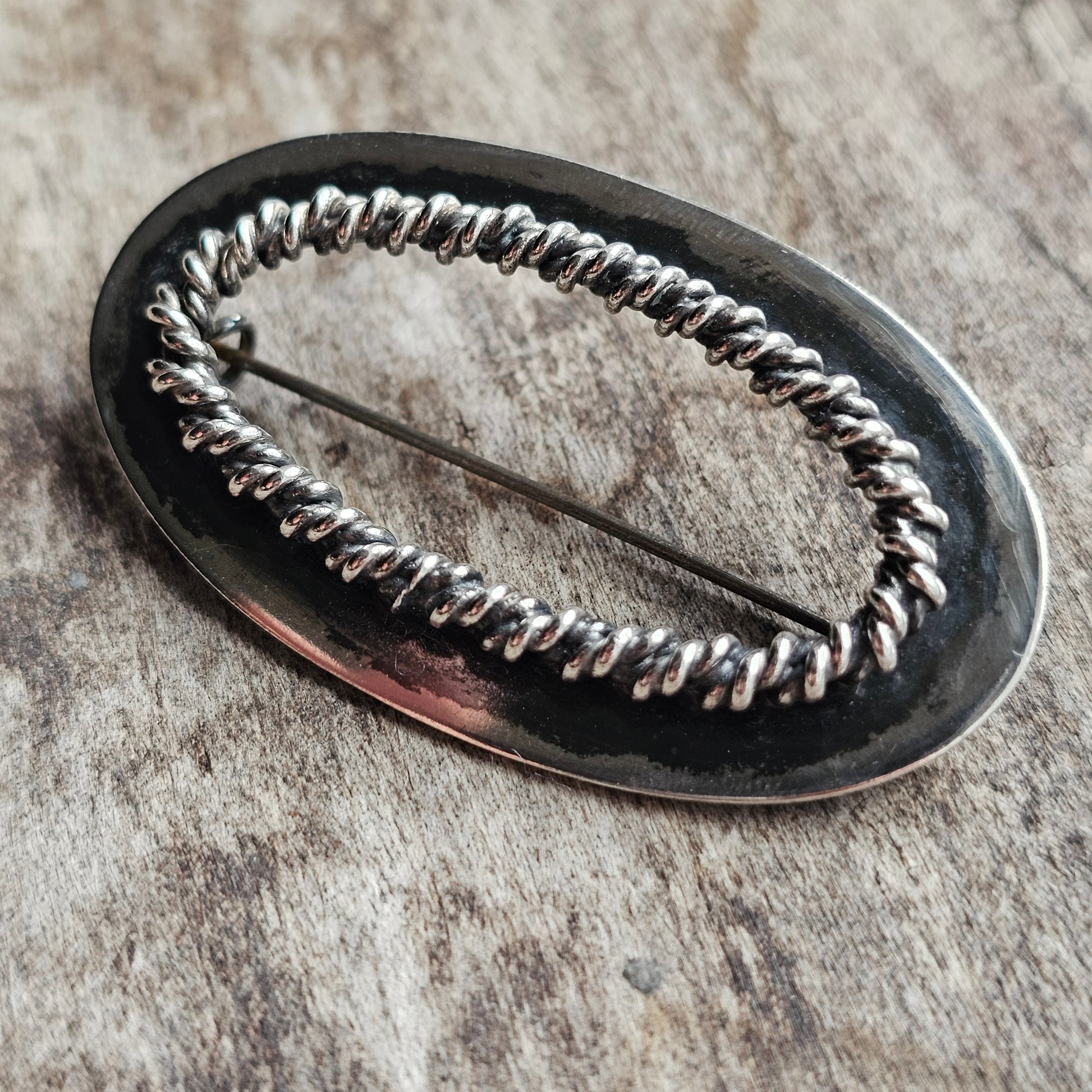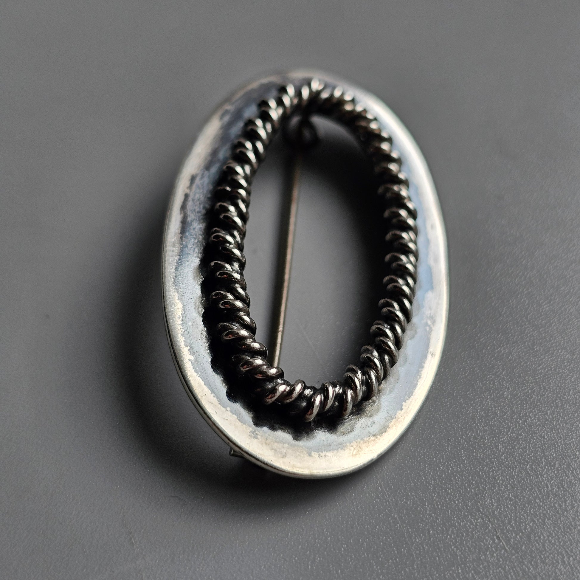This 1960s modernist piece features an oval form with a rope-textured inner element, creating depth and elegant contrast. Simple yet sculptural, it reflects the refined craftsmanship and organic design language that defined Finnish jewellery of the period.
