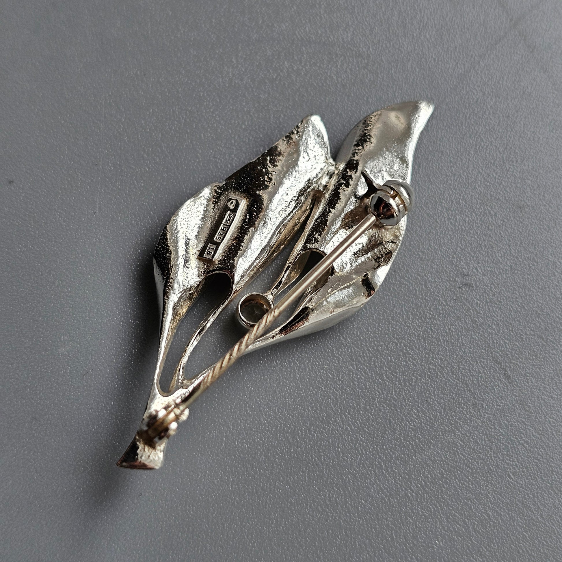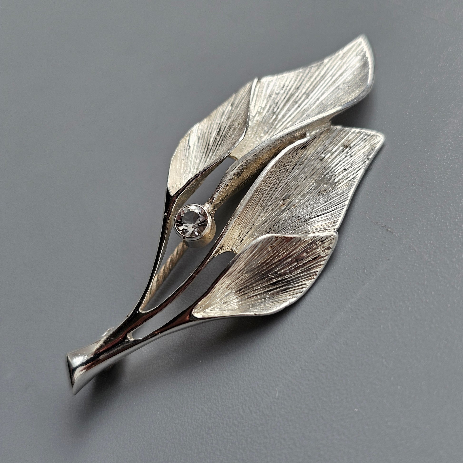 Designed in a layered leaf form, the brooch combines softly sculpted curves with textured detailing and clean polished lines — a refined example of Scandinavian organic modernism. The clear crystal is beautifully cut, adding brilliance and light to the naturalistic silver form.