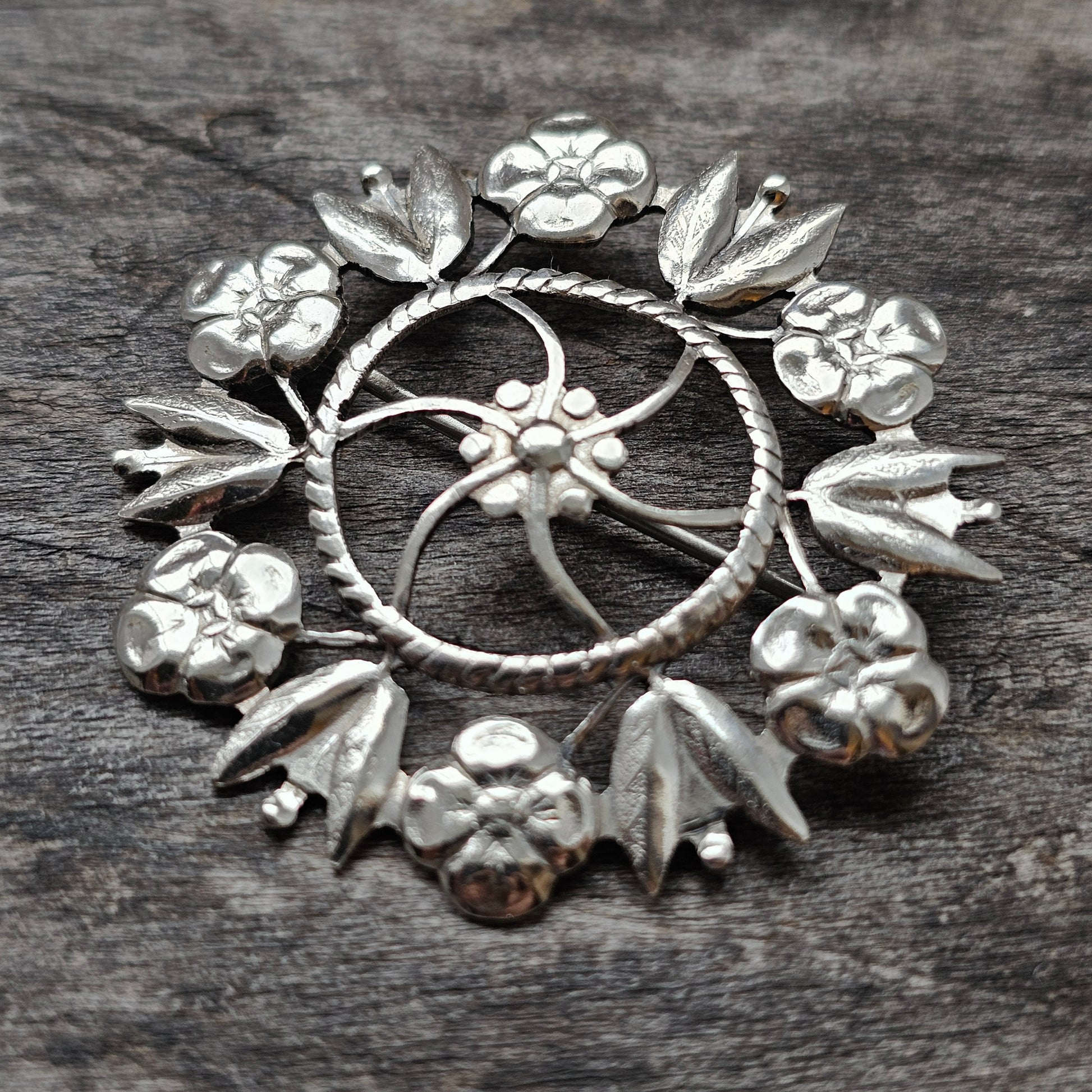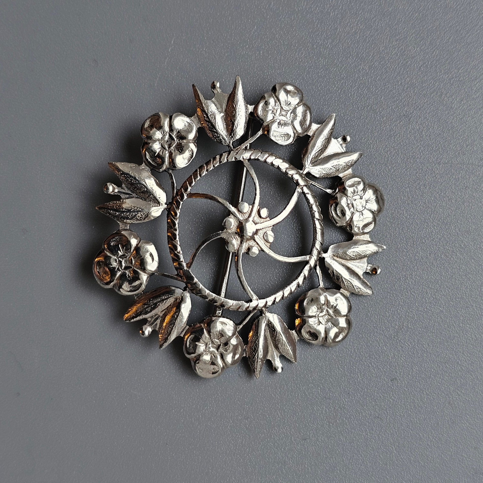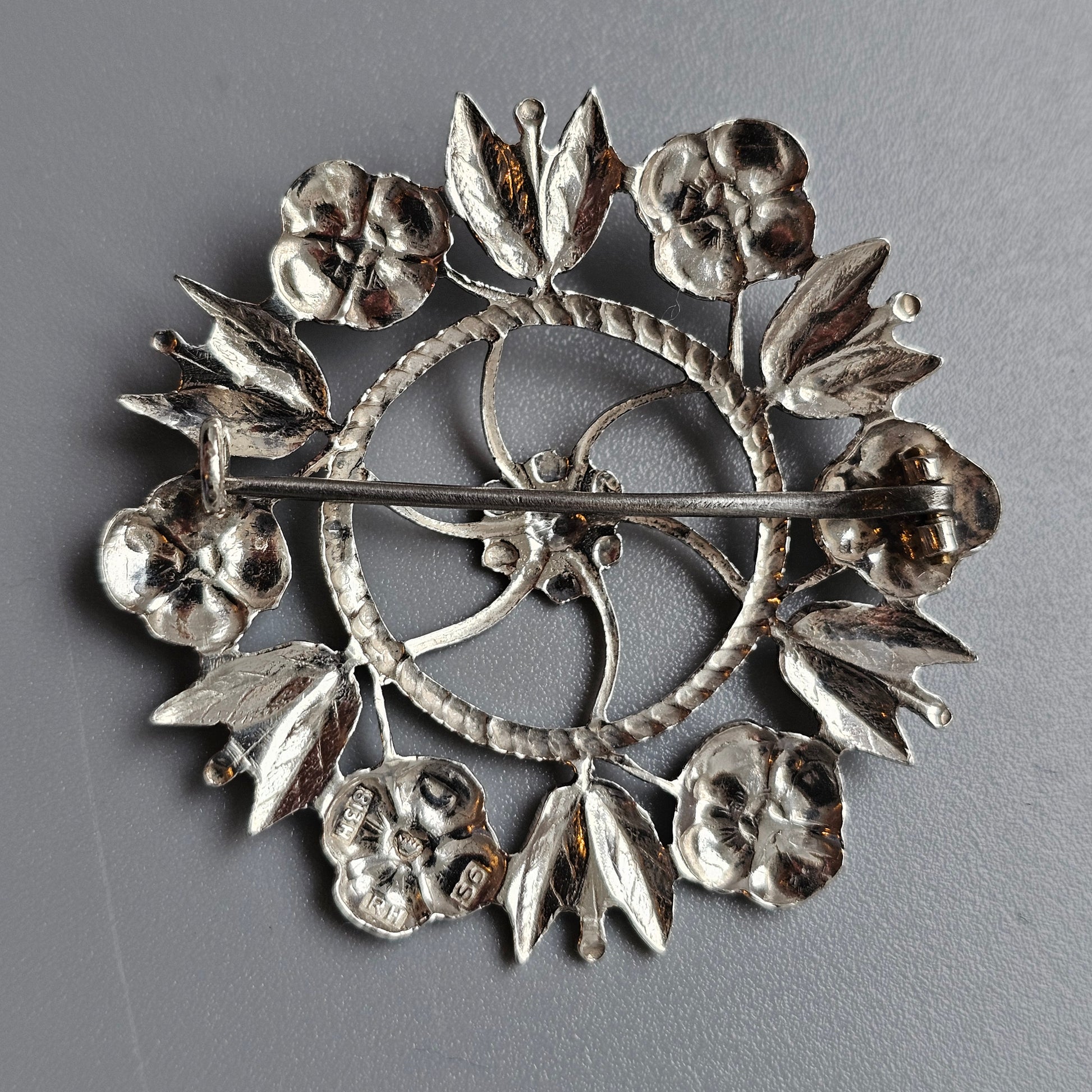 A charming and beautifully detailed Finnish silver floral brooch dating to the 1940s. This elegant piece features a finely worked wreath design with sculpted blossoms and leaves, arranged around a twisted rope-style circle and graceful swirling centre.