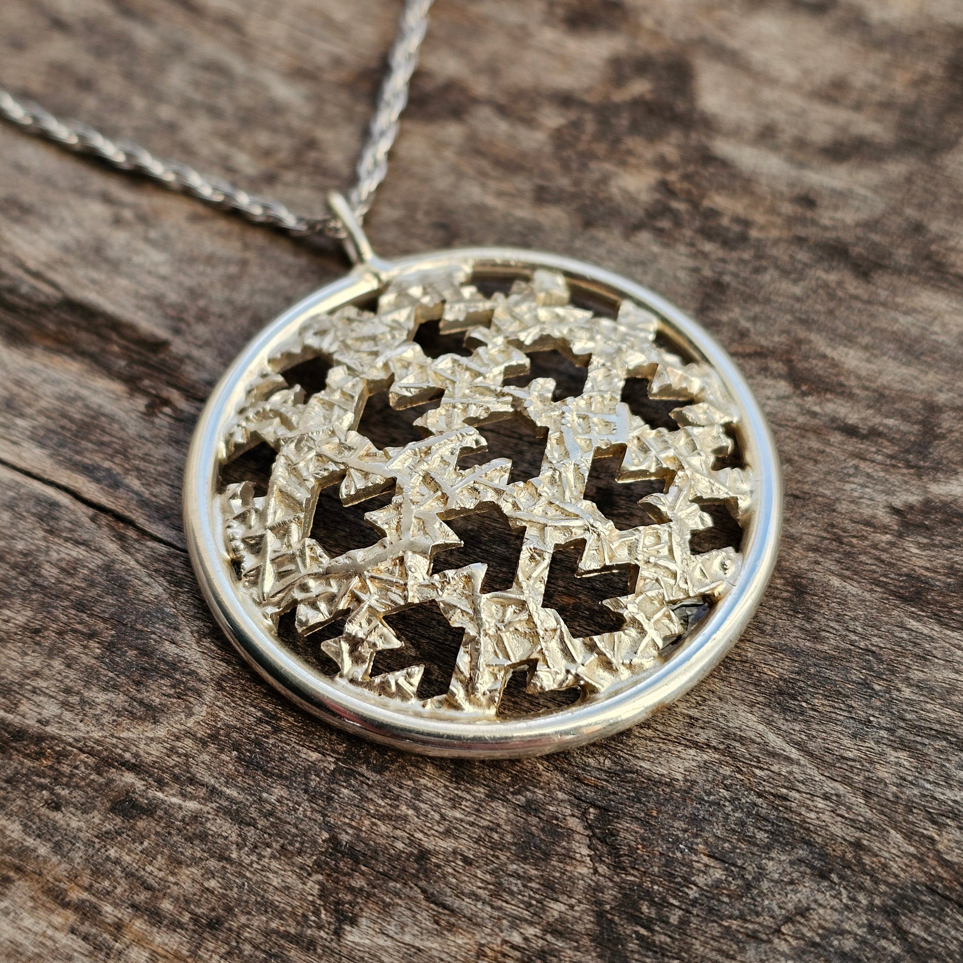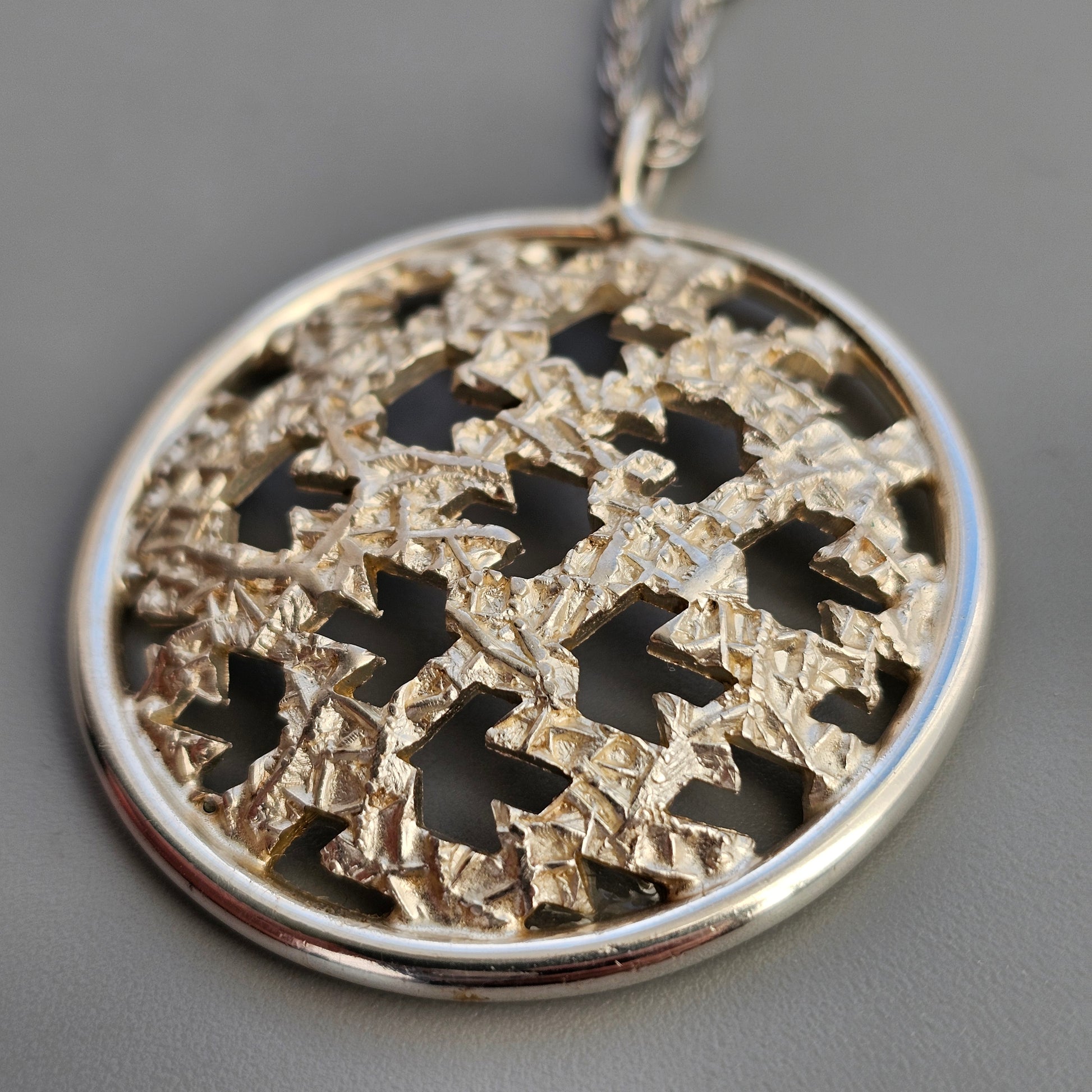 A vintage Finnish modernist necklace pendant made in silver, designed and produced by Auran Kultaseppä. The pendant features a circular openwork form with a repeating geometric pattern and a textured surface, framed within a smooth silver border. Both front and reverse sides show the cut-out design, with the reverse left smooth and polished