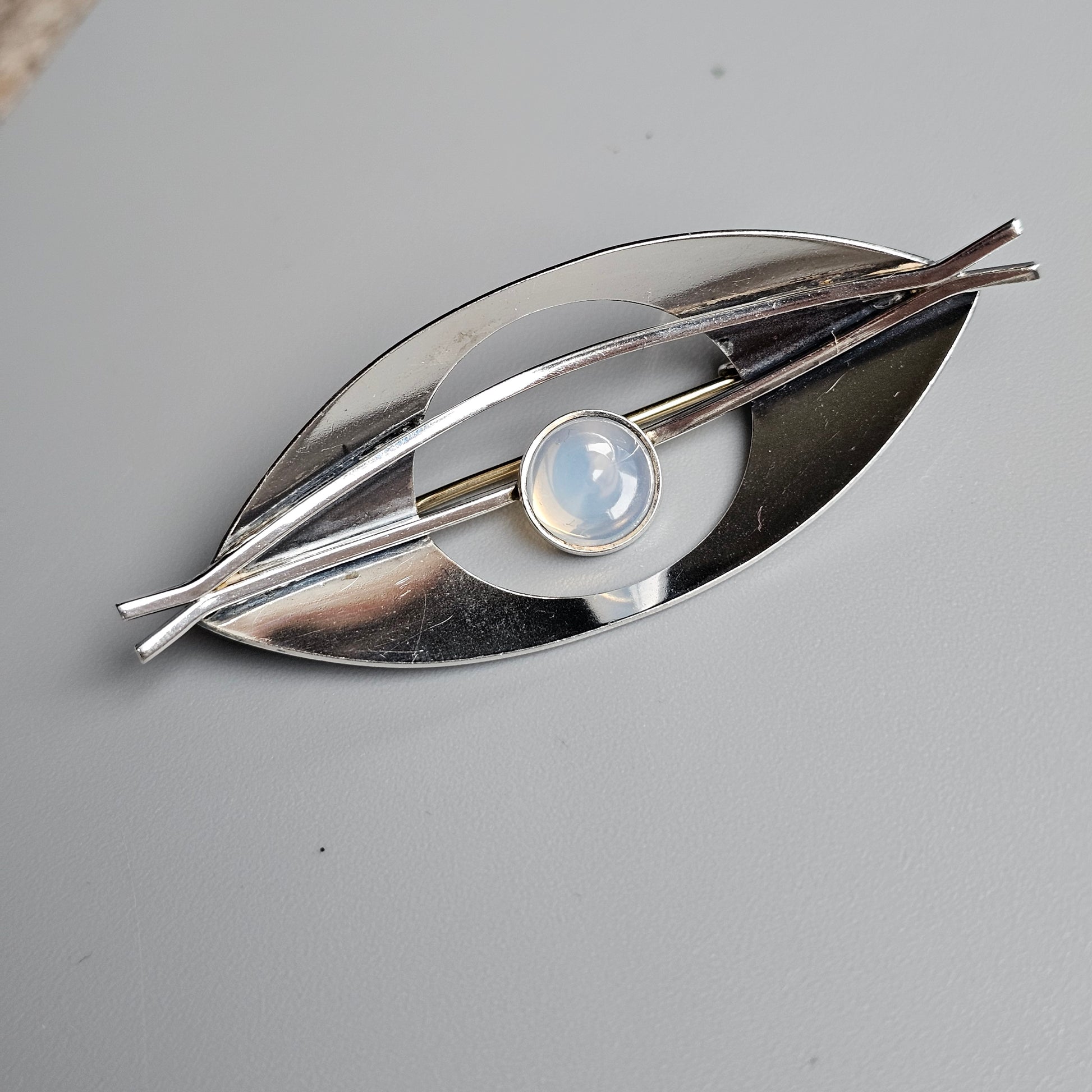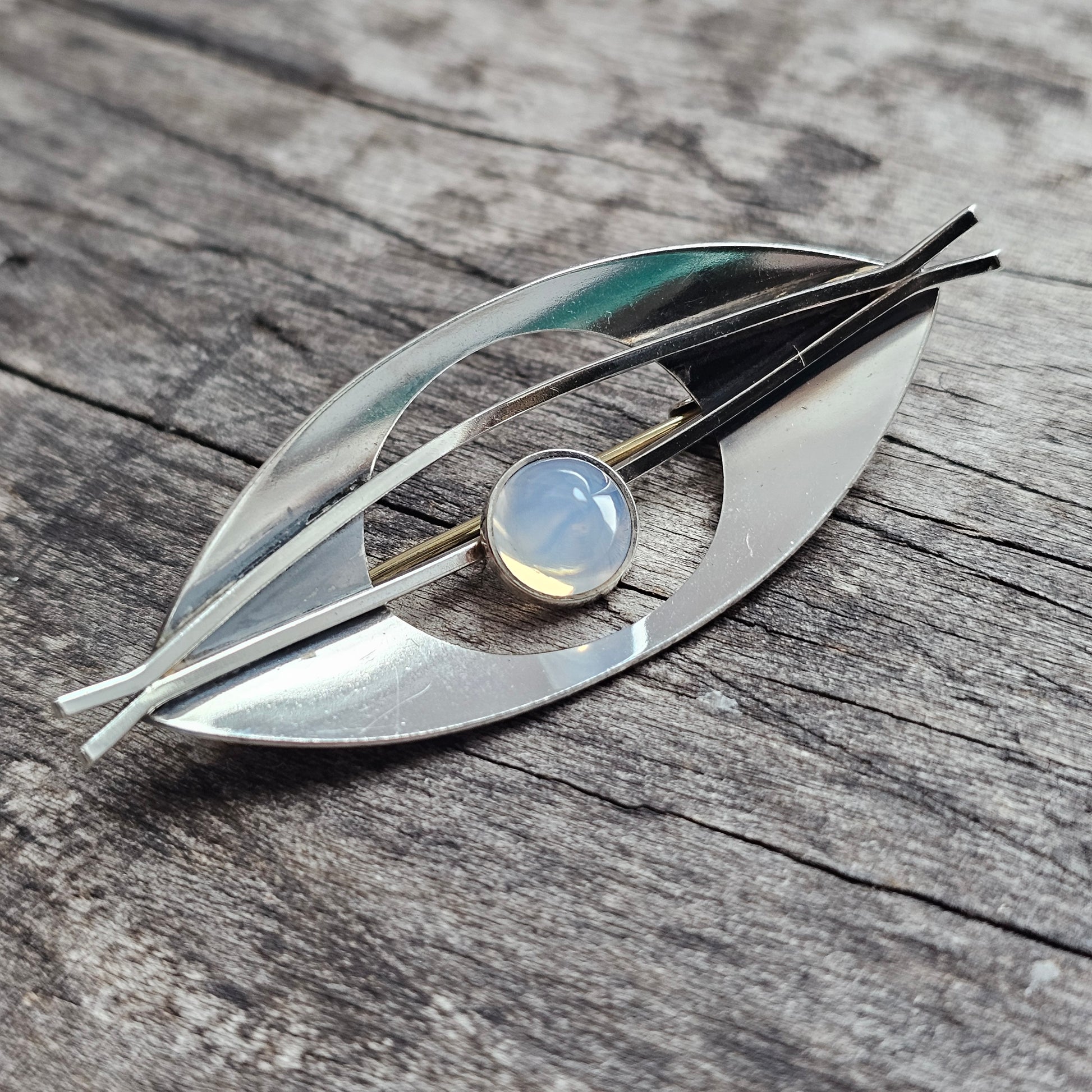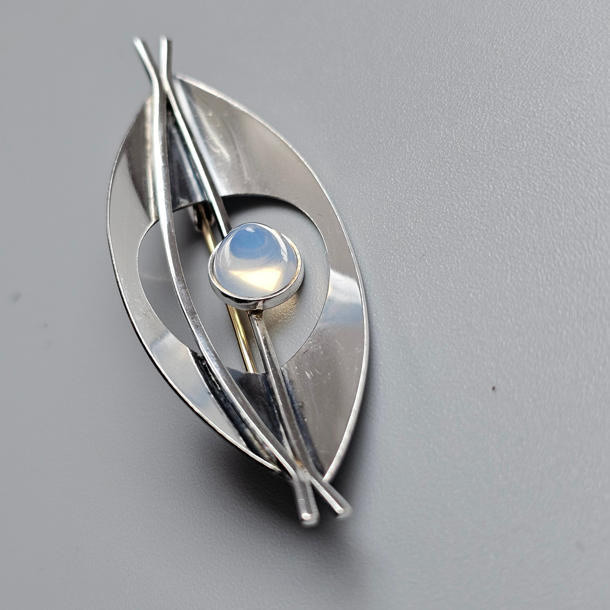 A striking and sculptural Finnish brooch from the 1960s, designed by Elis Kauppi for Kupittaan Kulta. The sleek, leaf-like form is cut from bright silver and set with a rounded chalcedony cabochon.
