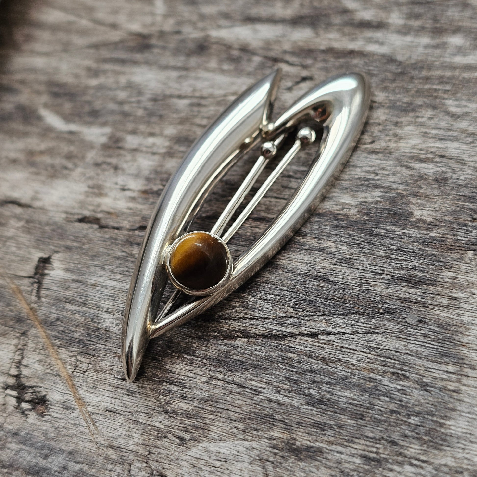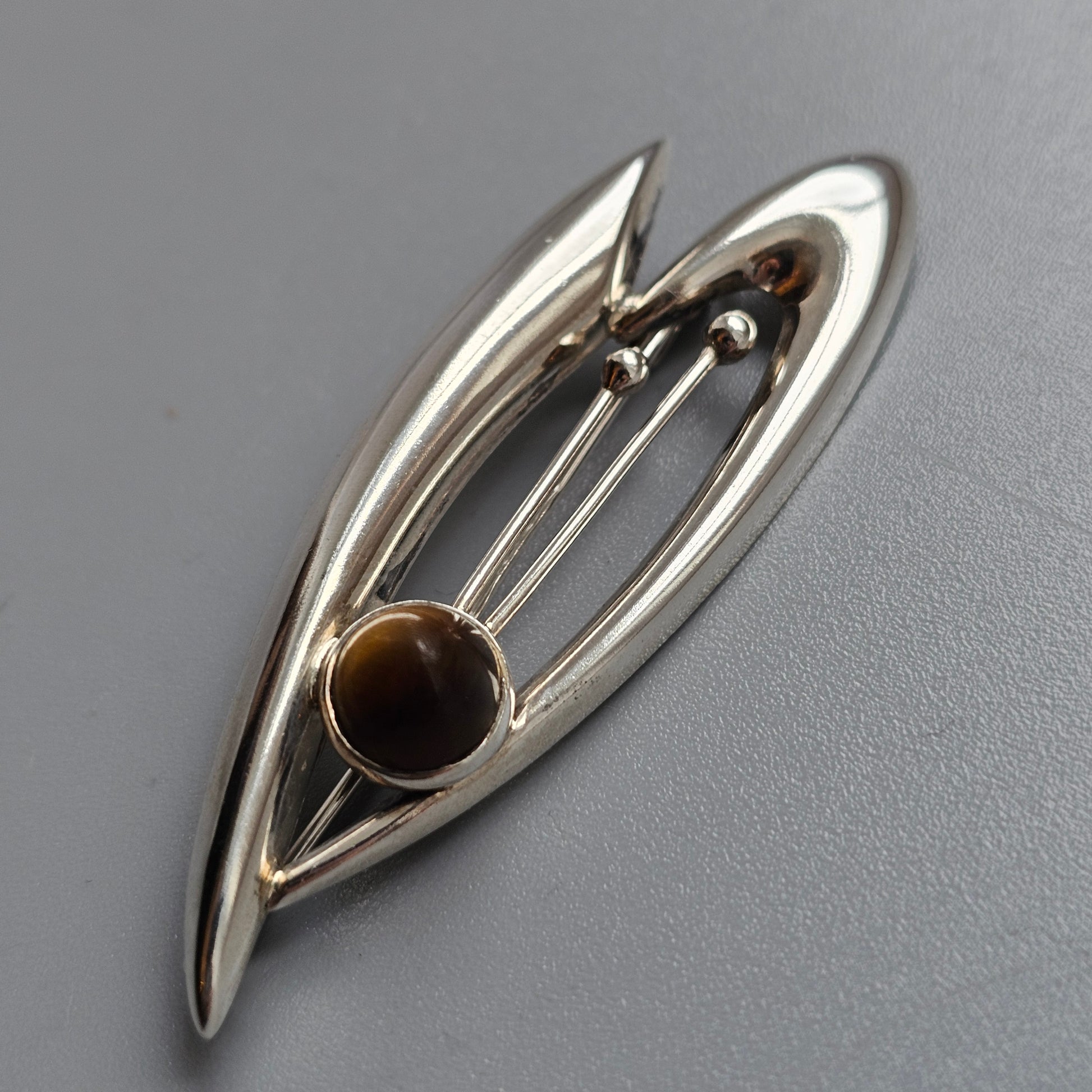 Vintage 1960s Finnish Modernist Silver & Tigers Eye Flower Brooch by Kultaseppä Salovaara 1963