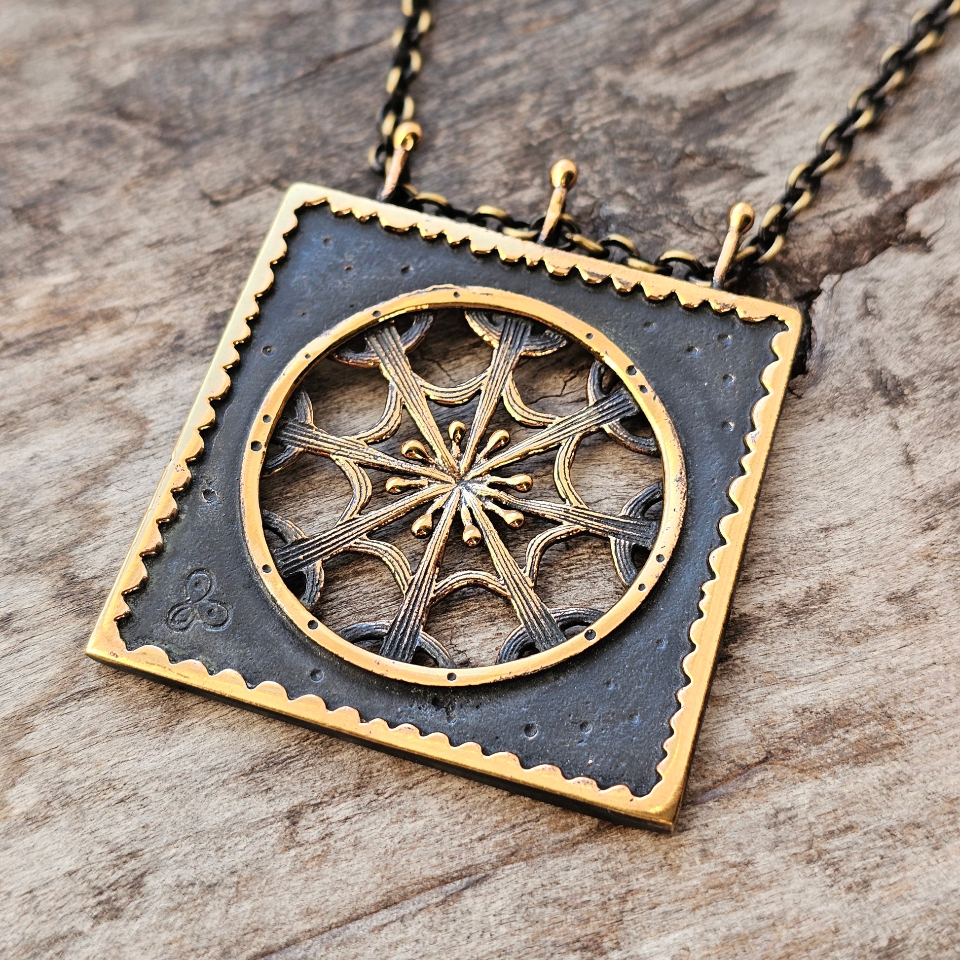 A vintage Finnish bronze necklace featuring an openwork square pendant with circular and radiating geometric almost snowflake like detailing. The surface shows contrasting textures: a darker patinated background and raised polished bronze elements.