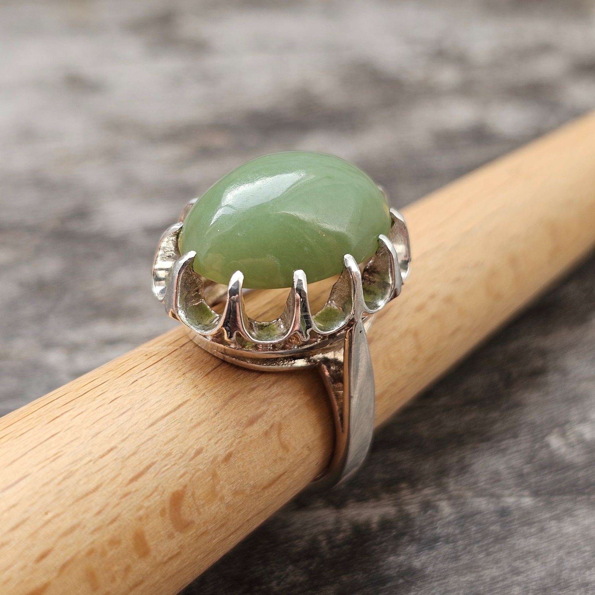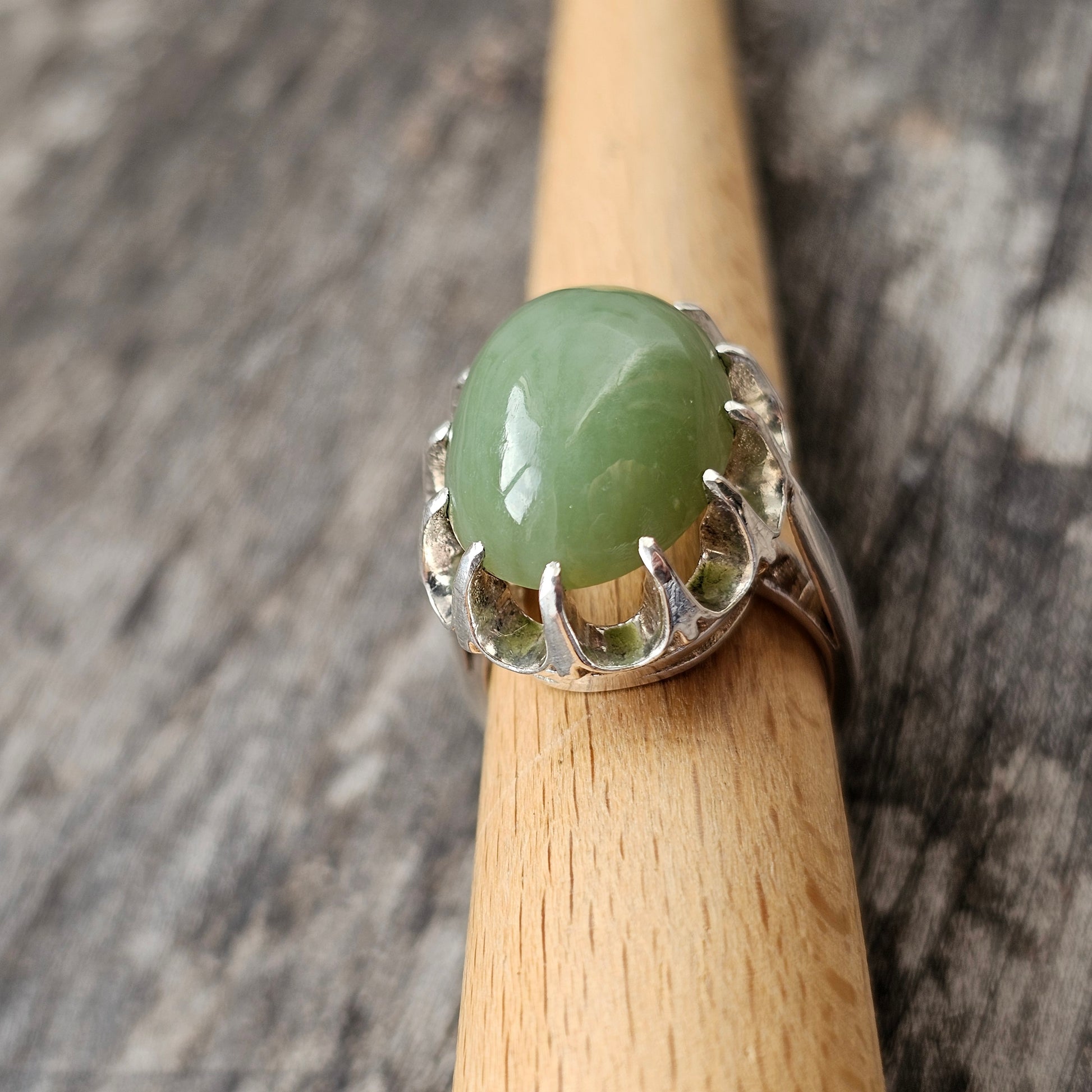 A vintage silver ring featuring an oval nephrite jade cabochon in a raised, sculptural claw setting. The stone sits high above the band, with openwork details beneath that allow light to pass through the setting.