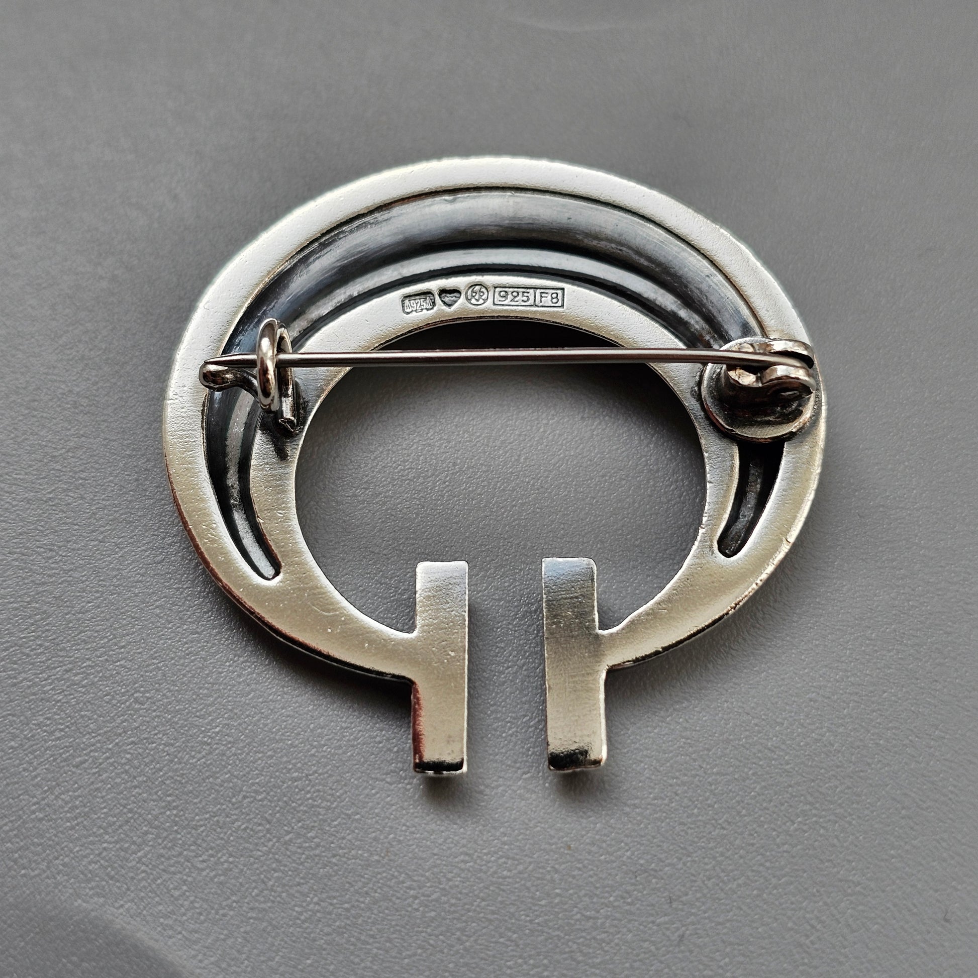 This Kalevala Koru silver brooch is a rendition of an 11th-century Finnish design, featuring oxidized details. The brooches historical counterpart was found in Kokemäki, Finland. This is Kalevala Koru design number 1097.