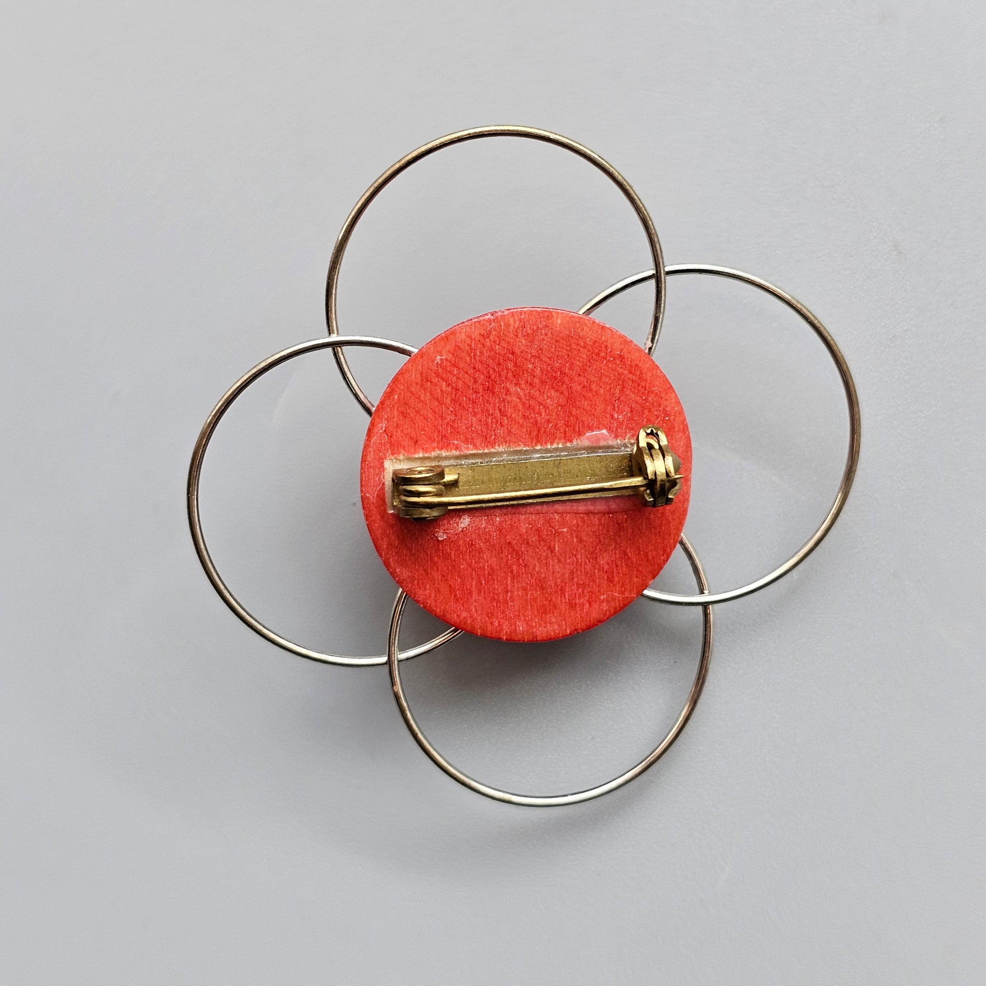 A minimalist wooden design in red & silver tone metal, typical of Aarikka’s playful, sculptural aesthetic. The wood surface has a soft matte finish and retains its original pin back.