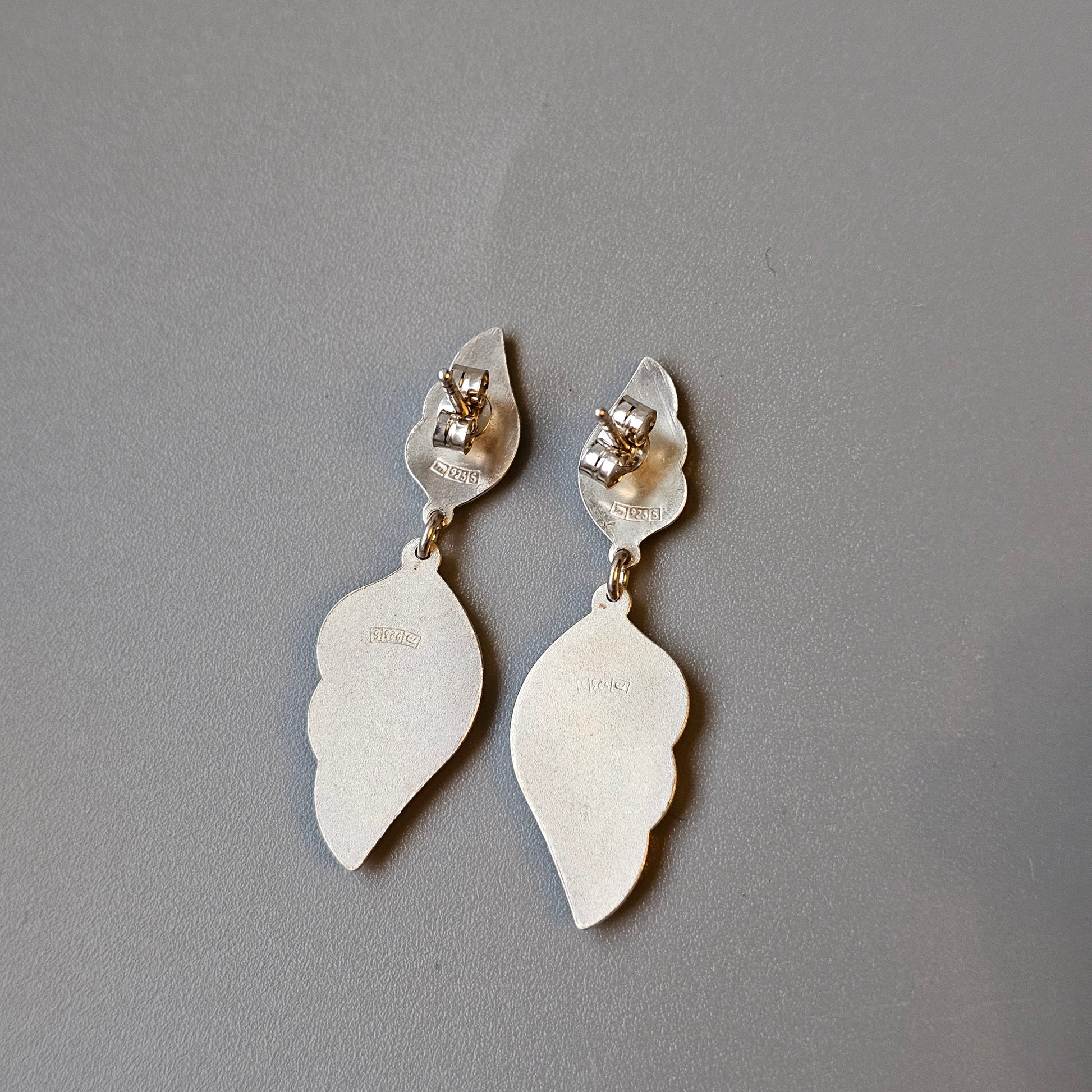 A pair of vintage Finnish sterling silver drop earrings by Finnfeelings, dating from the late 1990s to early 2000s. Each earring has a flowing, layered leaf-inspired form with a mix of polished and softly textured surfaces.