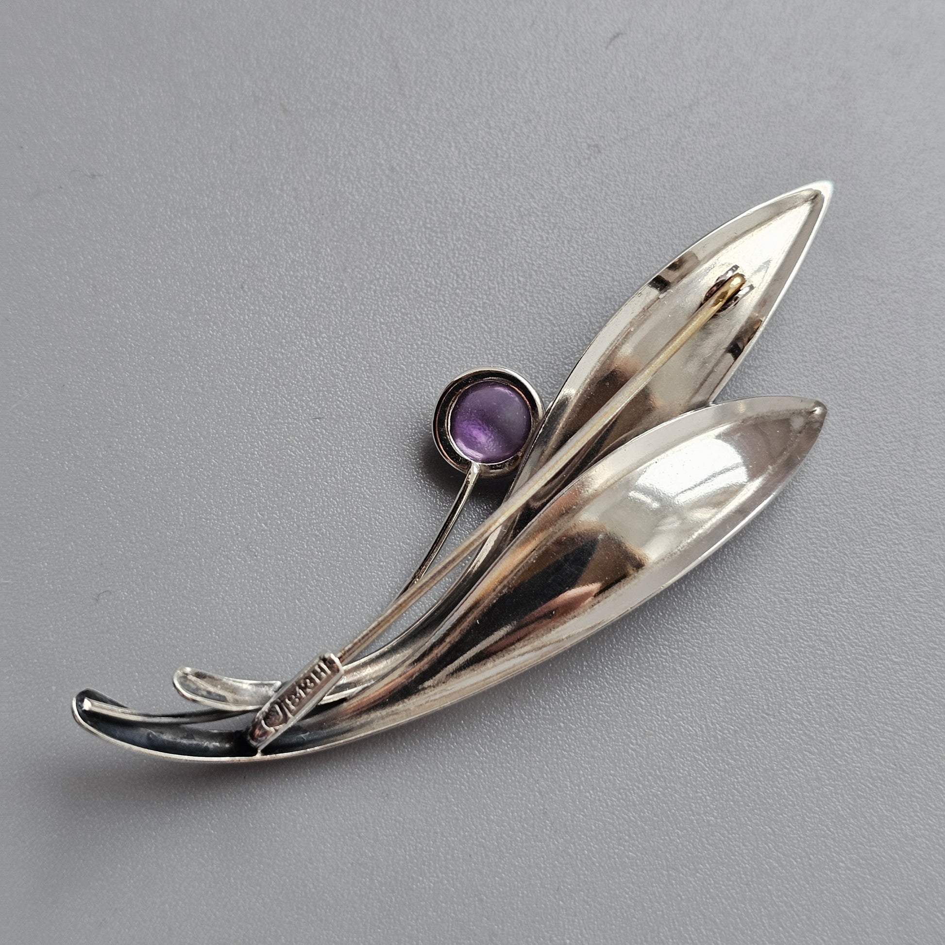 Designed by Elis Kauppi for Kupittaan Kulta in 1950s, this Finnish modernist brooch design features a stylized floral form with two elongated silver leaves and a softly glowing cabochon amethyst, set where a bud might emerge. The lines are clean but fluid, with gentle curves and high-polished surfaces that reflect light with movement.