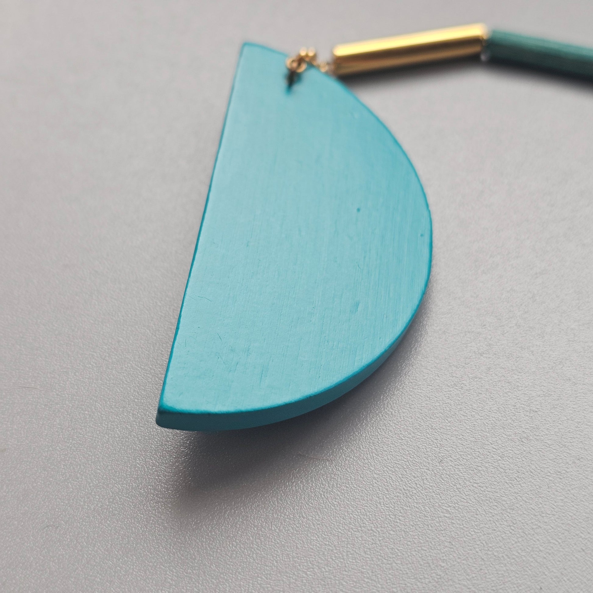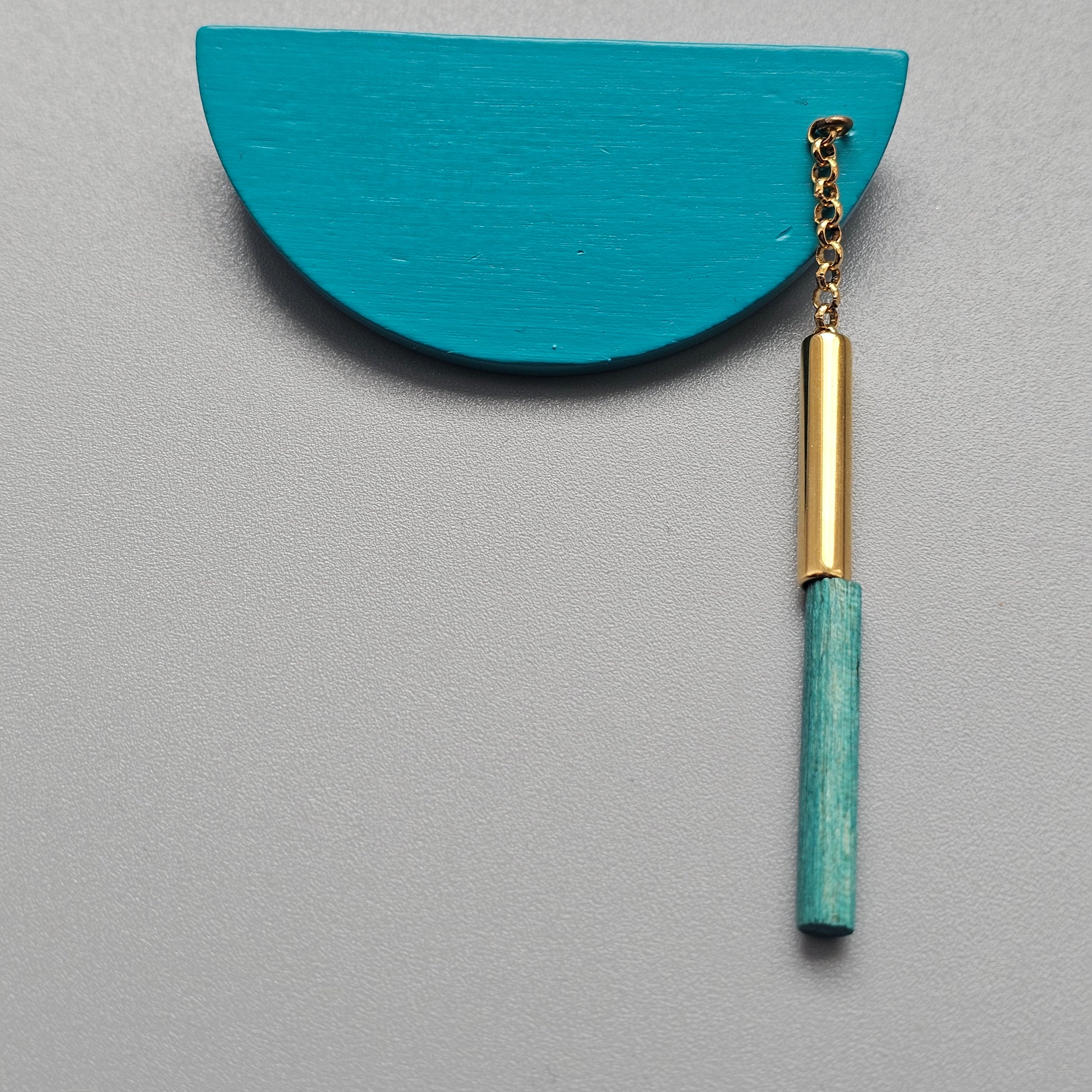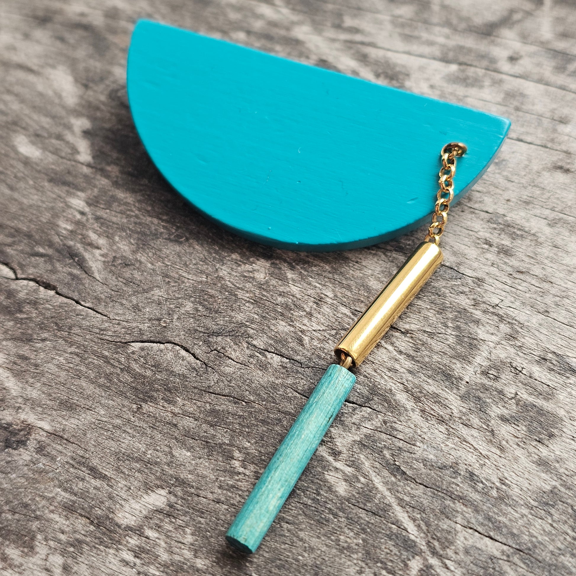 Classic Aarikka Heiluri Pendulum brooch in lovely bright teal colour wood with gold tone metal.