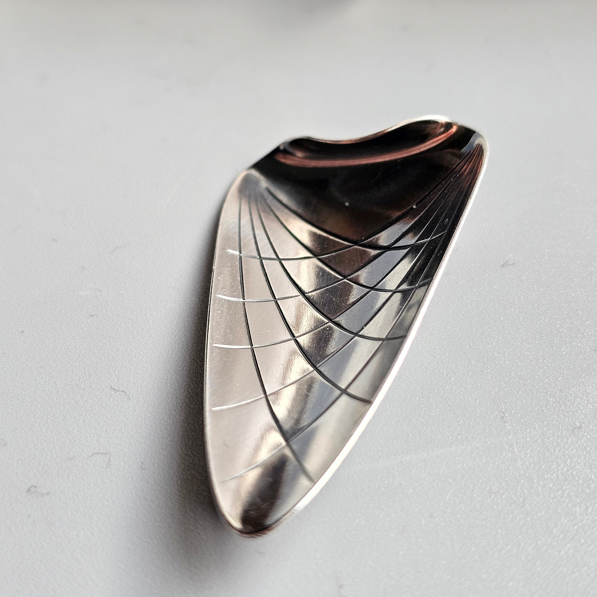 This sculptural piece features sweeping folded contours with engraved intersecting lines that evoke sails, wings, or mid-century architectural forms. Elegant, lightweight yet substantial, and beautifully crafted — it perfectly captures the sophistication and sculptural purity of Scandinavian modern jewellery design.