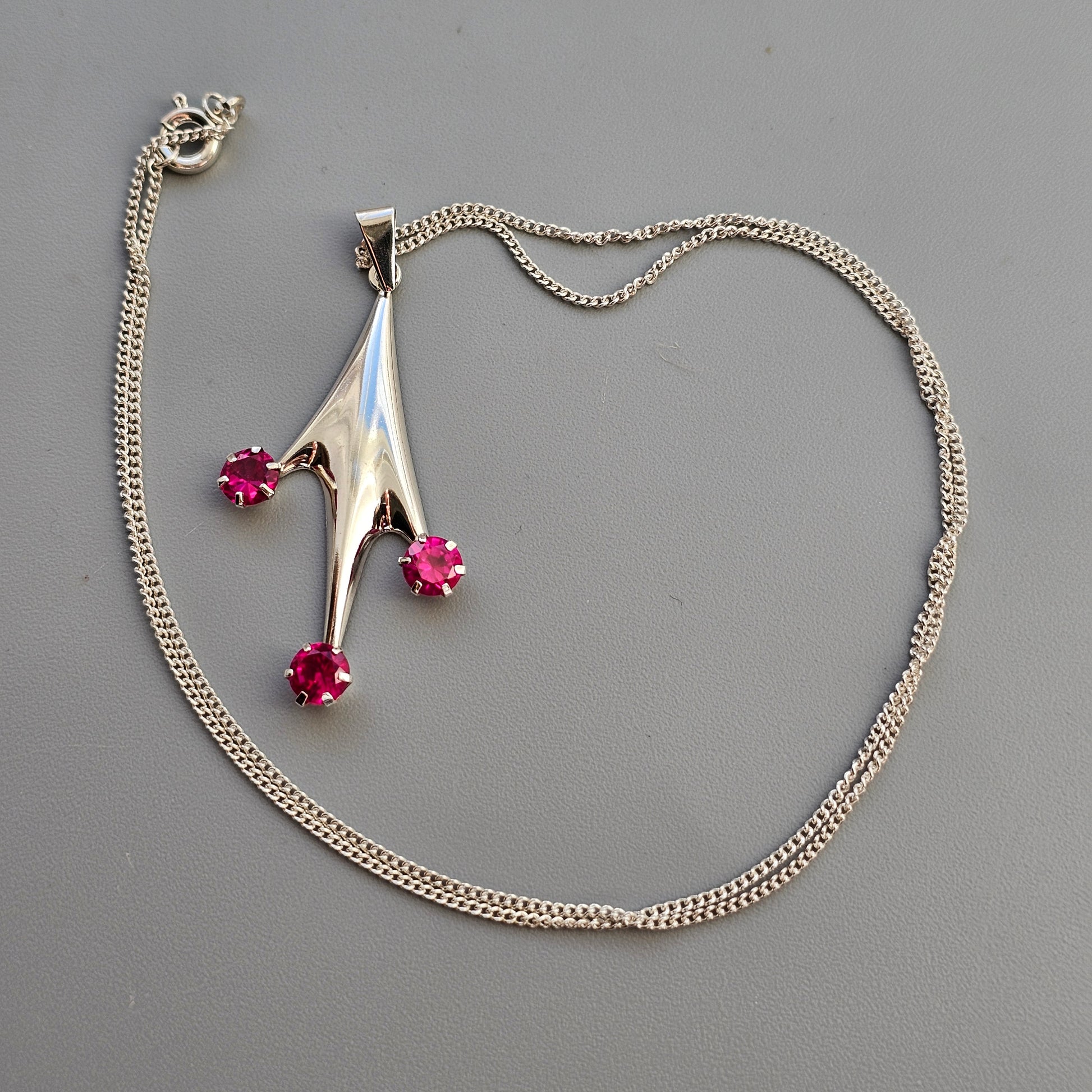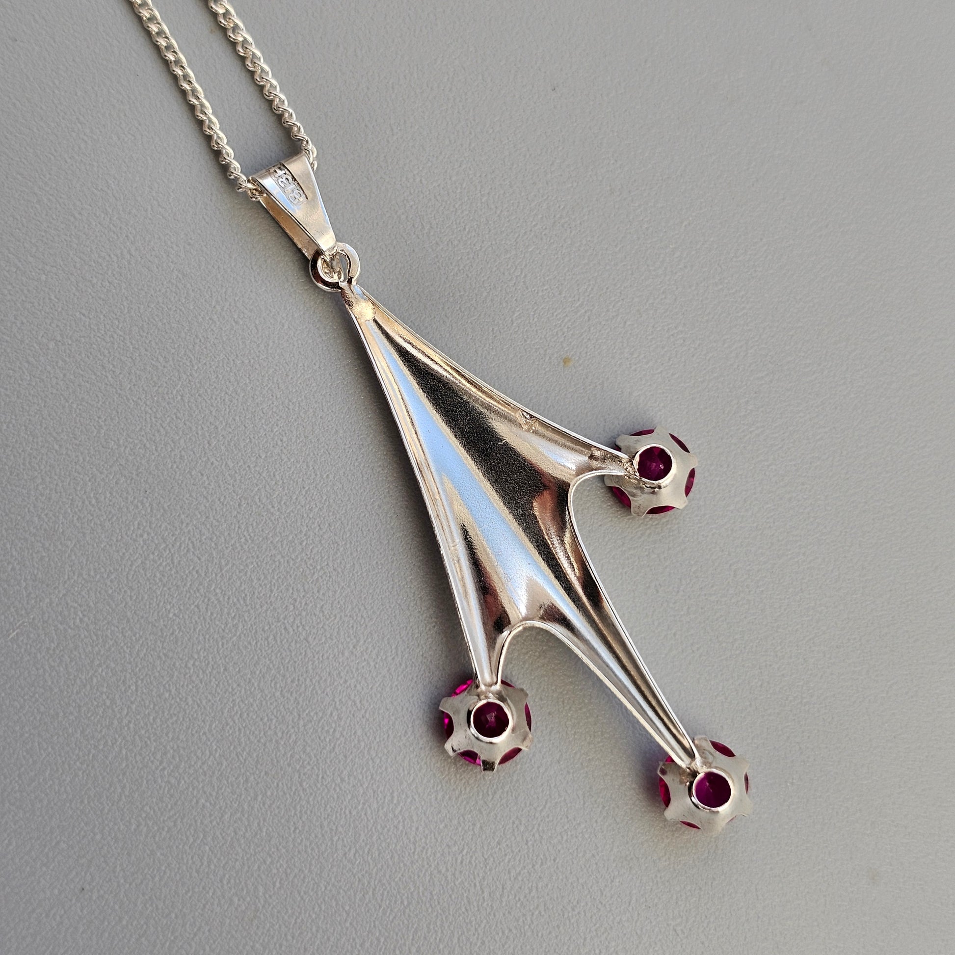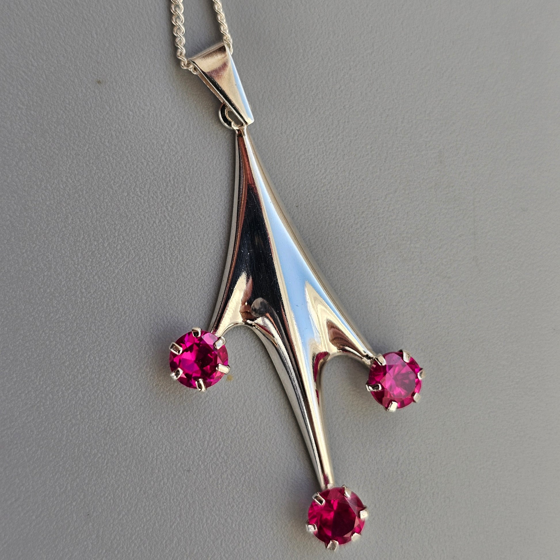A vintage Finnish silver necklace from the 1960s, designed in a bold and angular modernist form. The pendant features three vibrant lab-created ruby stones set in claw settings at the tips of the branching form, adding colour and contrast to the polished silver surface.