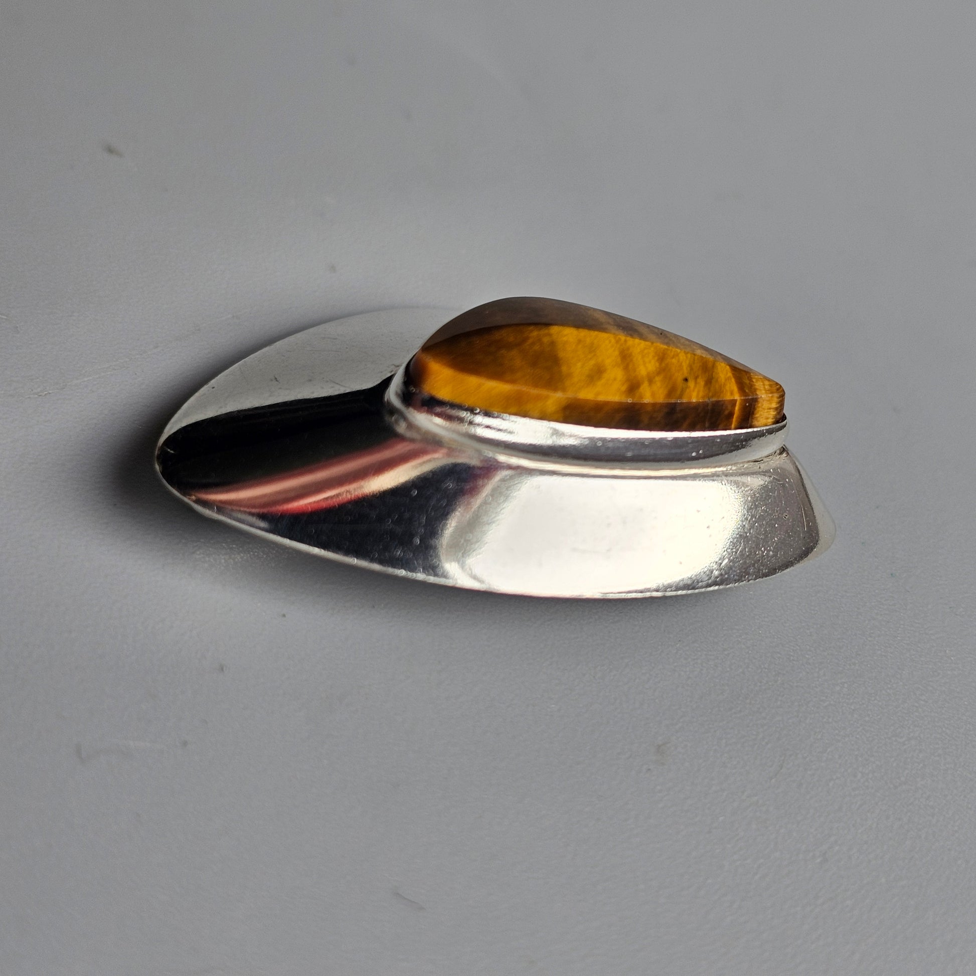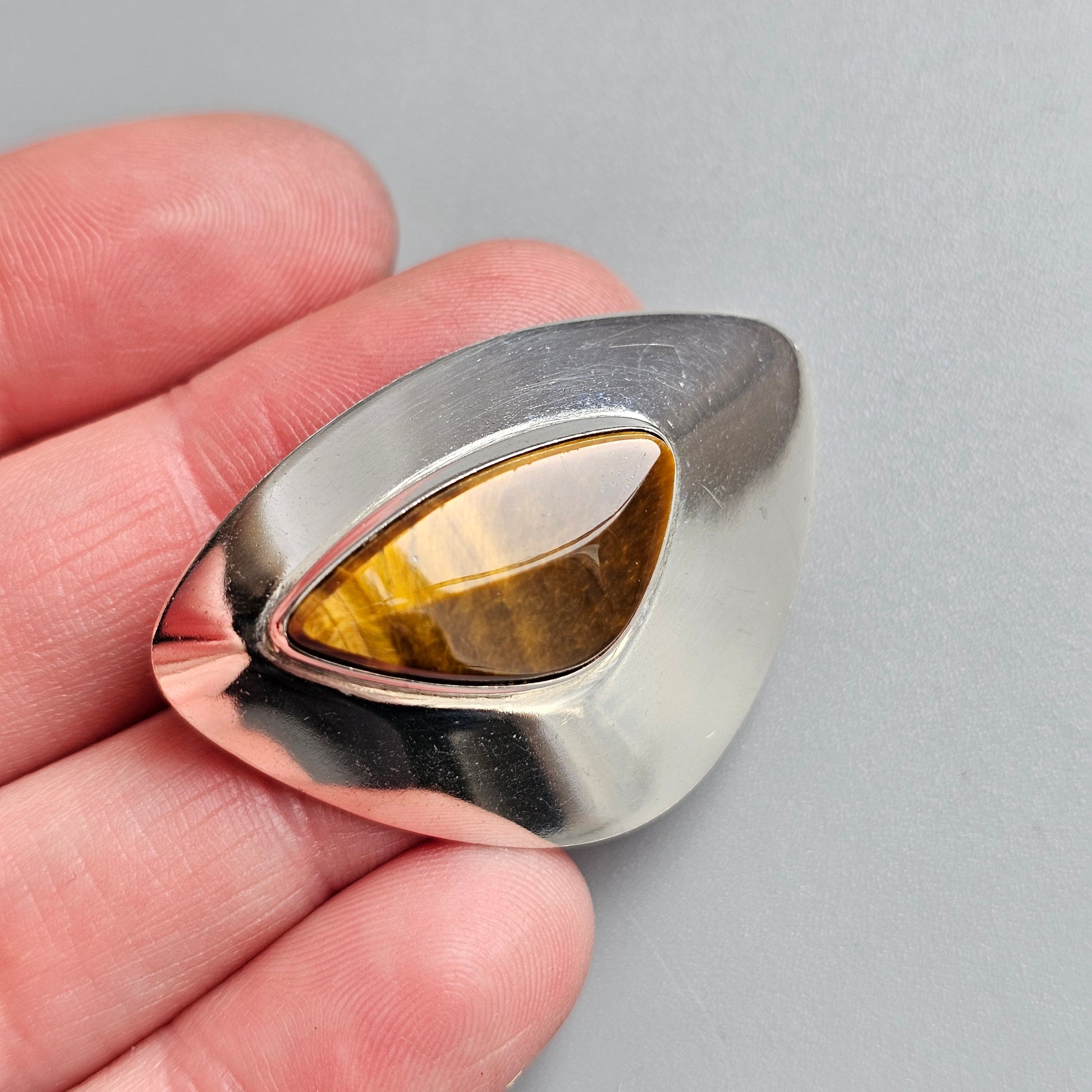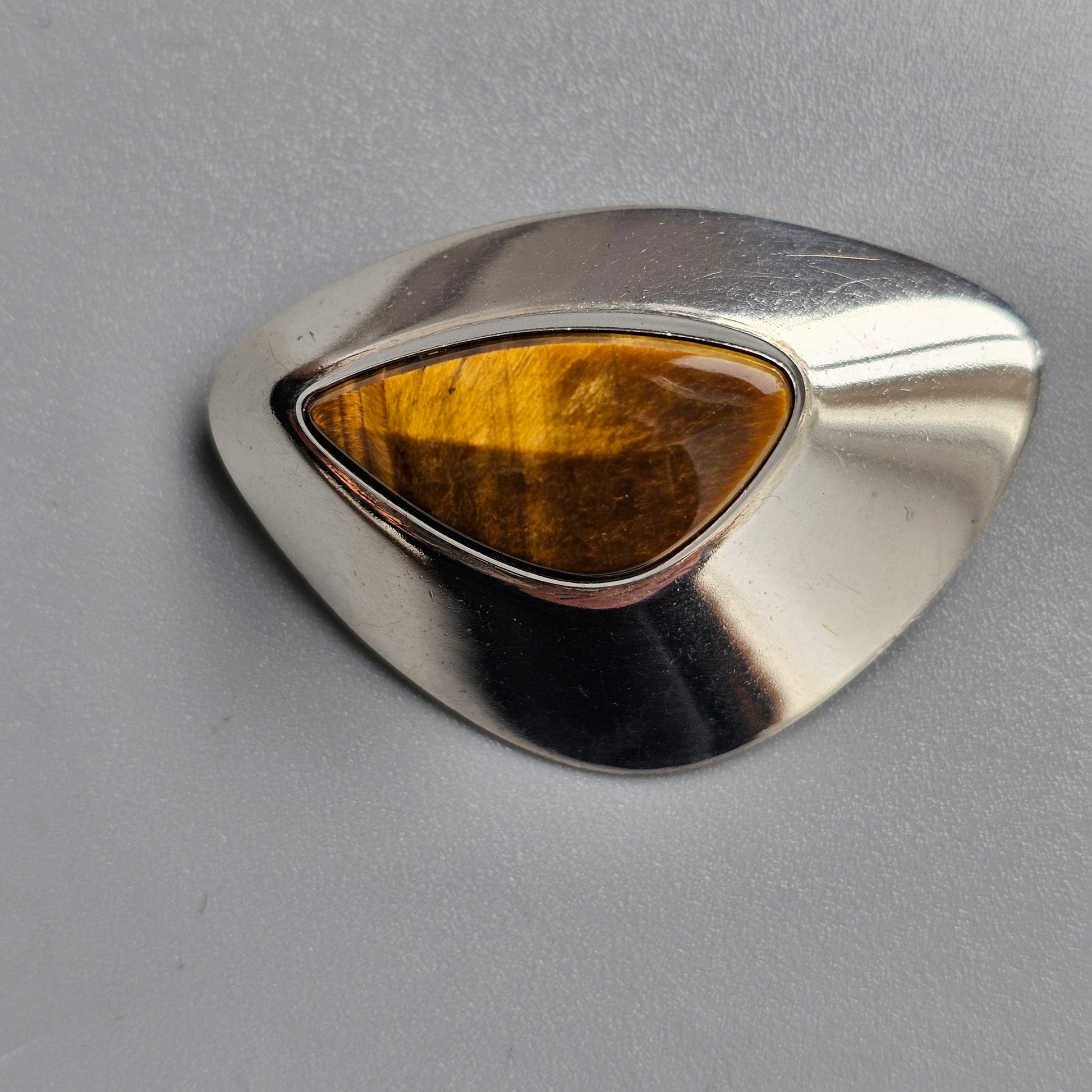 Vintage Finnish modernist silver brooch with a warm tiger’s eye gemstone from 1960s made by Jalosepot. The bold sculptural form and clean Scandinavian lines give this piece elegance. A beautiful example of Nordic mid-century jewellery.