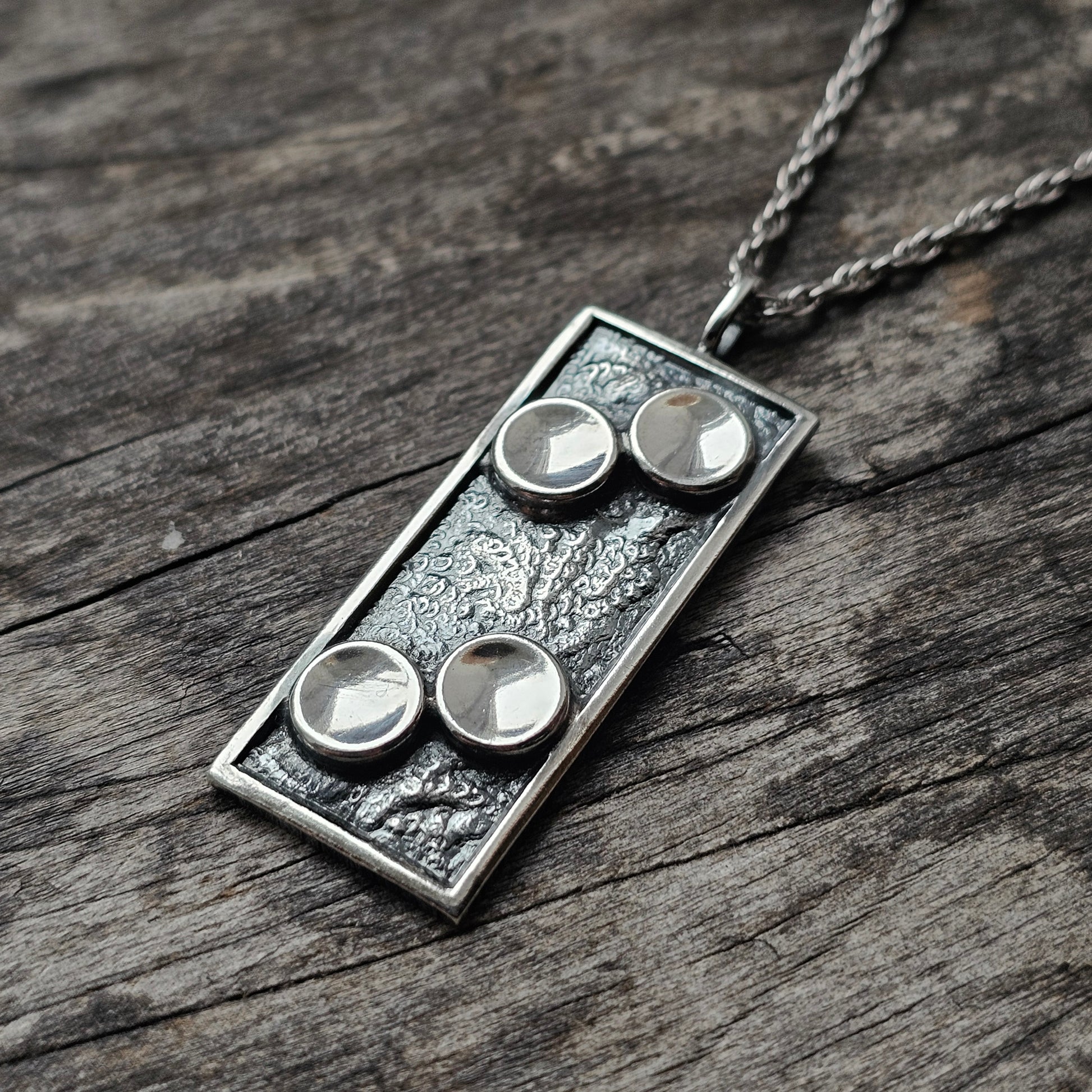 A rectangular silver pendant with a textured surface and three smooth raised circular elements arranged off-centre. The contrast between the roughened background and polished rounded forms gives the piece depth and visual interest.